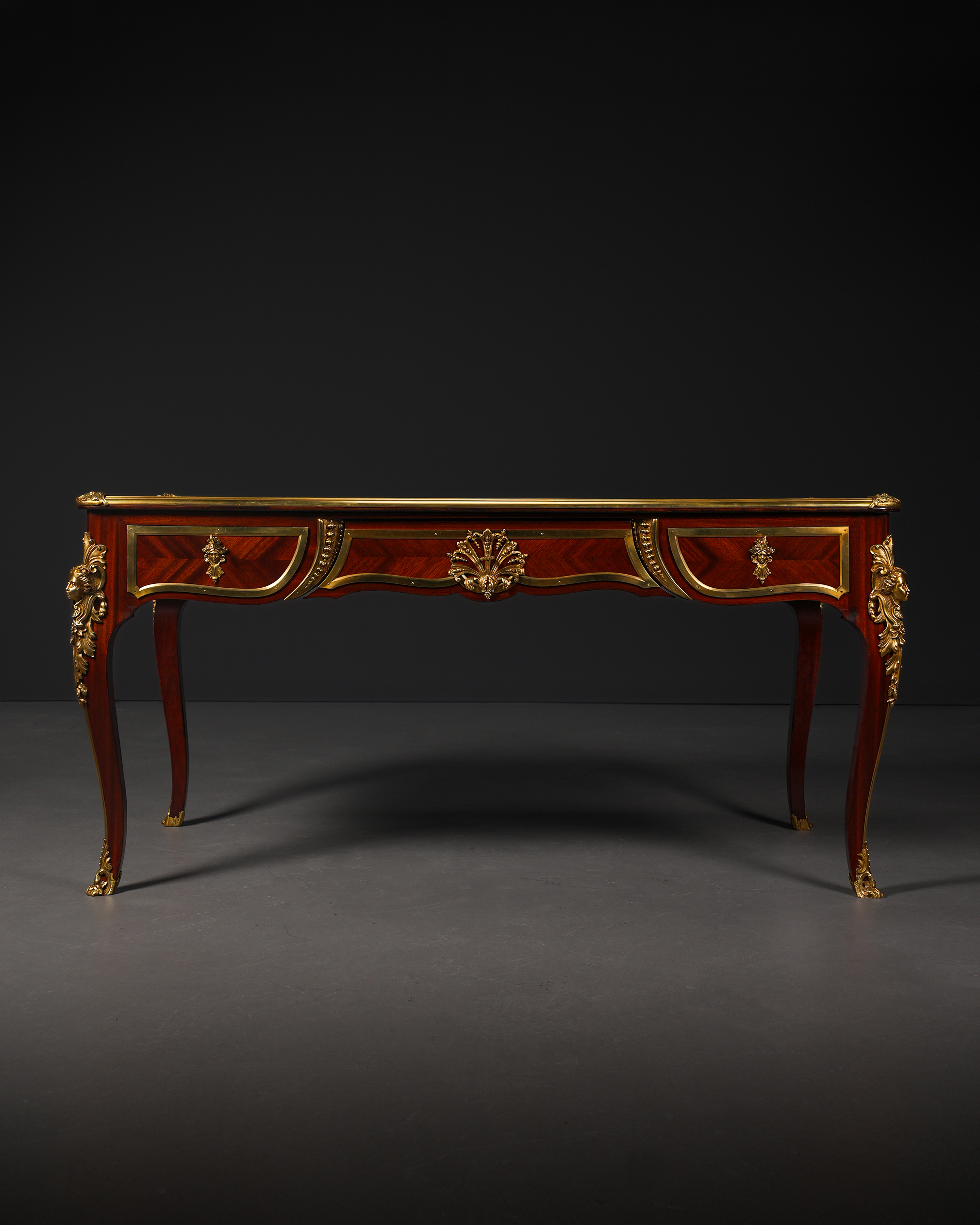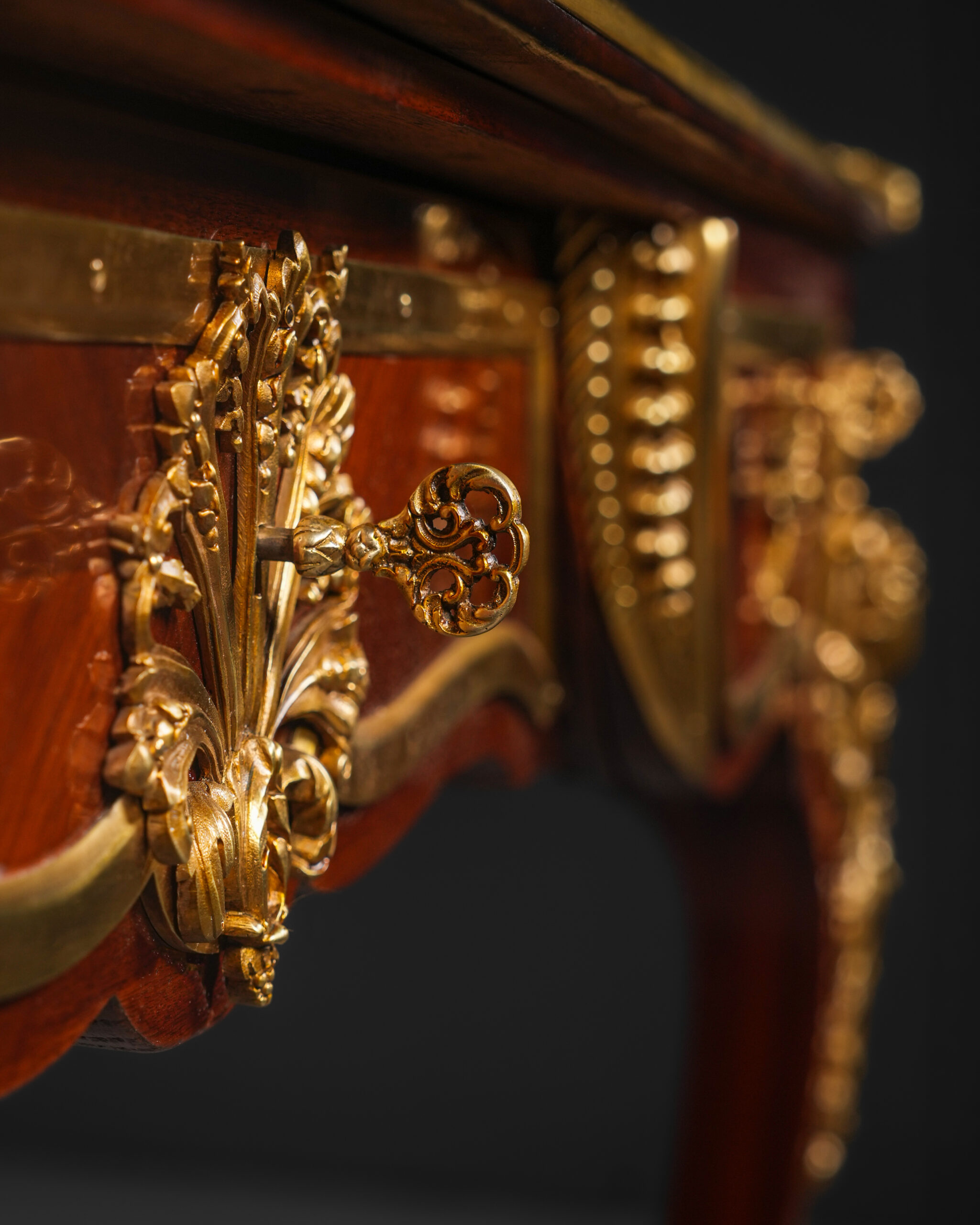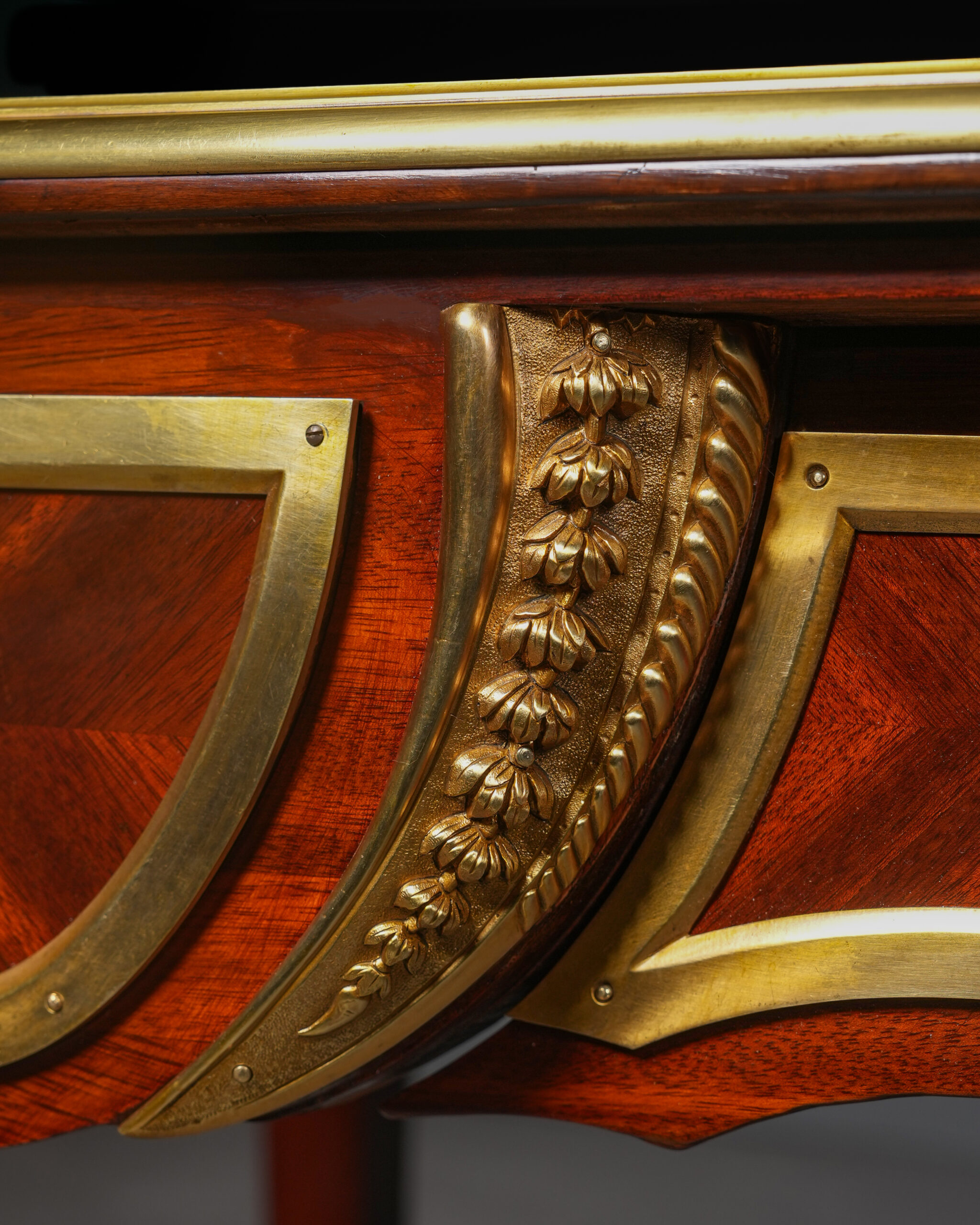 Kavisli gövde formu ve cabriole ayak yapısı, Louis XV stilinin karakteristik özelliklerini taşır. Çekmece yüzeylerinde kullanılan geometrik maun kaplama desenleri, altın tonlu bronz çerçevelerle vurgulanmış; orta bölümde yer alan kabartmalı bronz motif kompozisyona dengeli ve ihtişamlı bir görünüm kazandırmıştır. Köşelerde ve ayaklarda görülen figüratif bronz aplikler, parçaya saray estetiğini çağrıştıran güçlü bir karakter katmaktadır.
