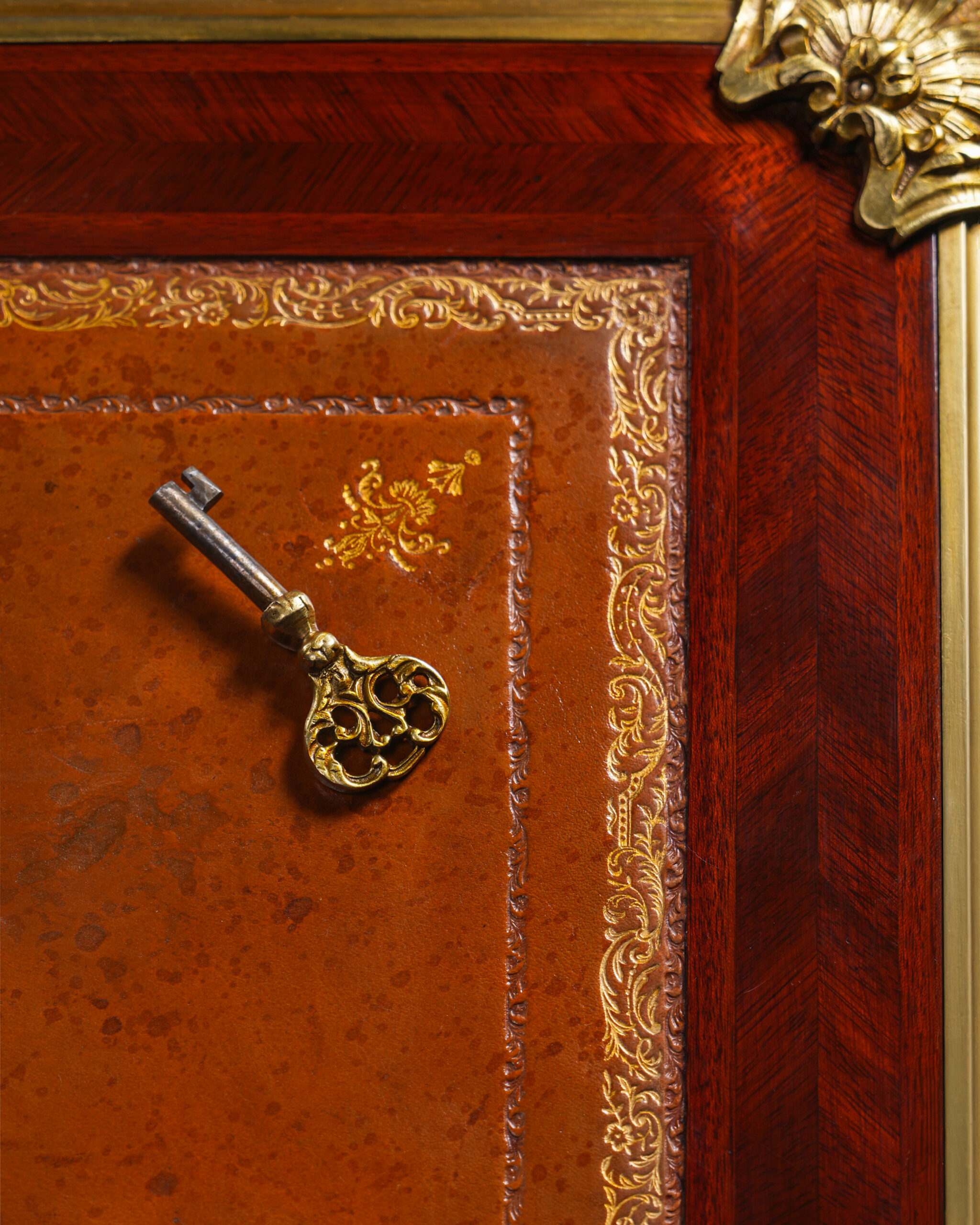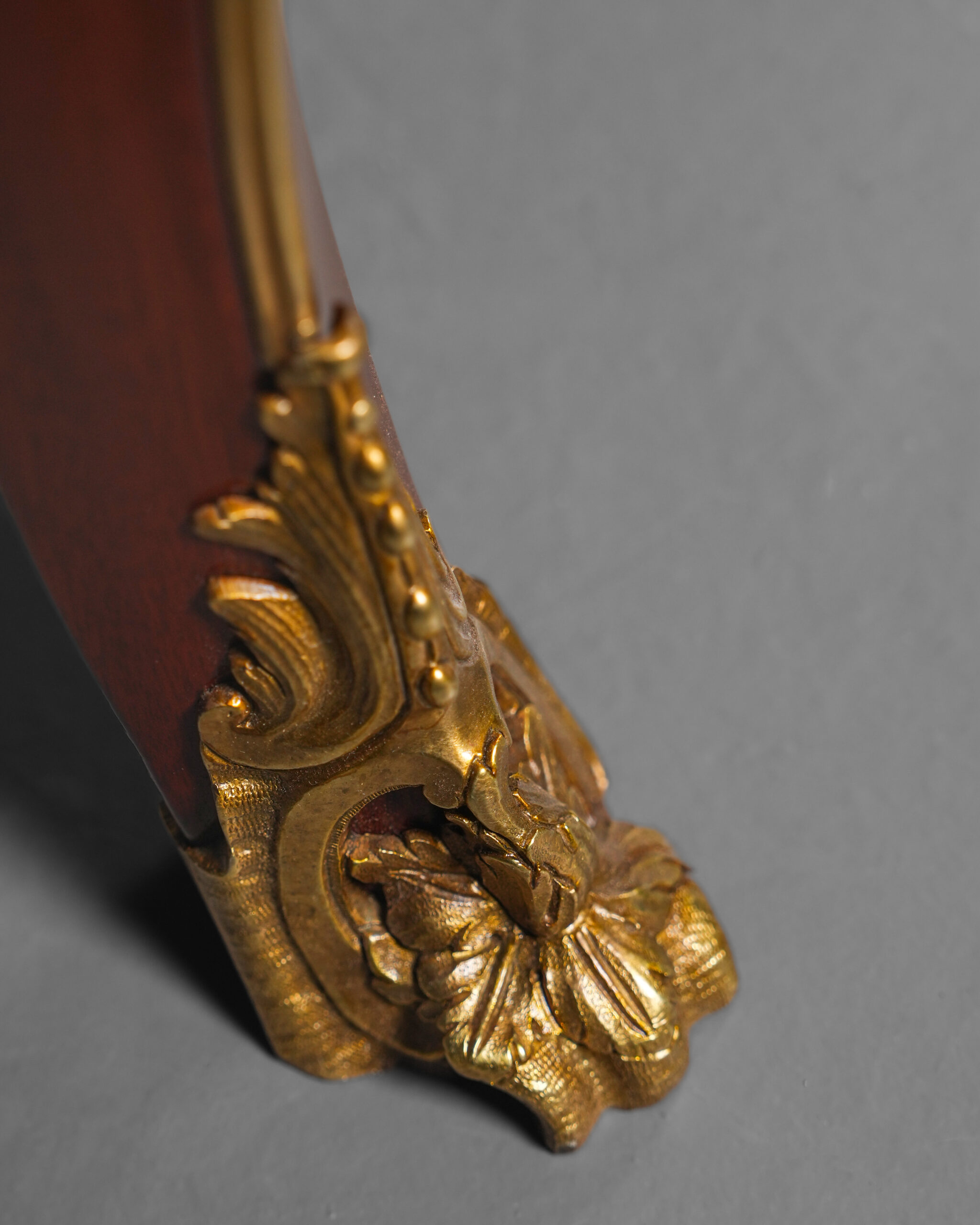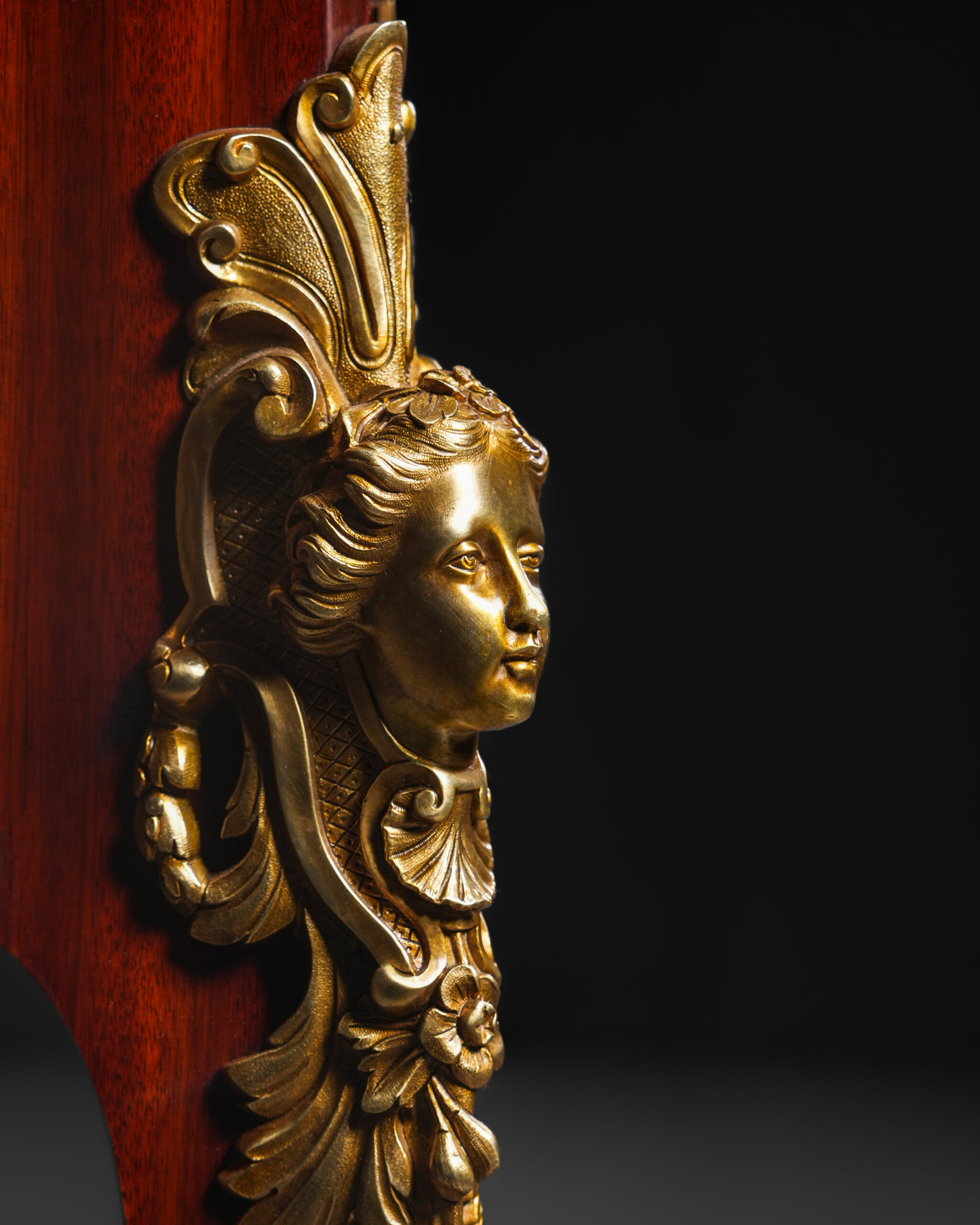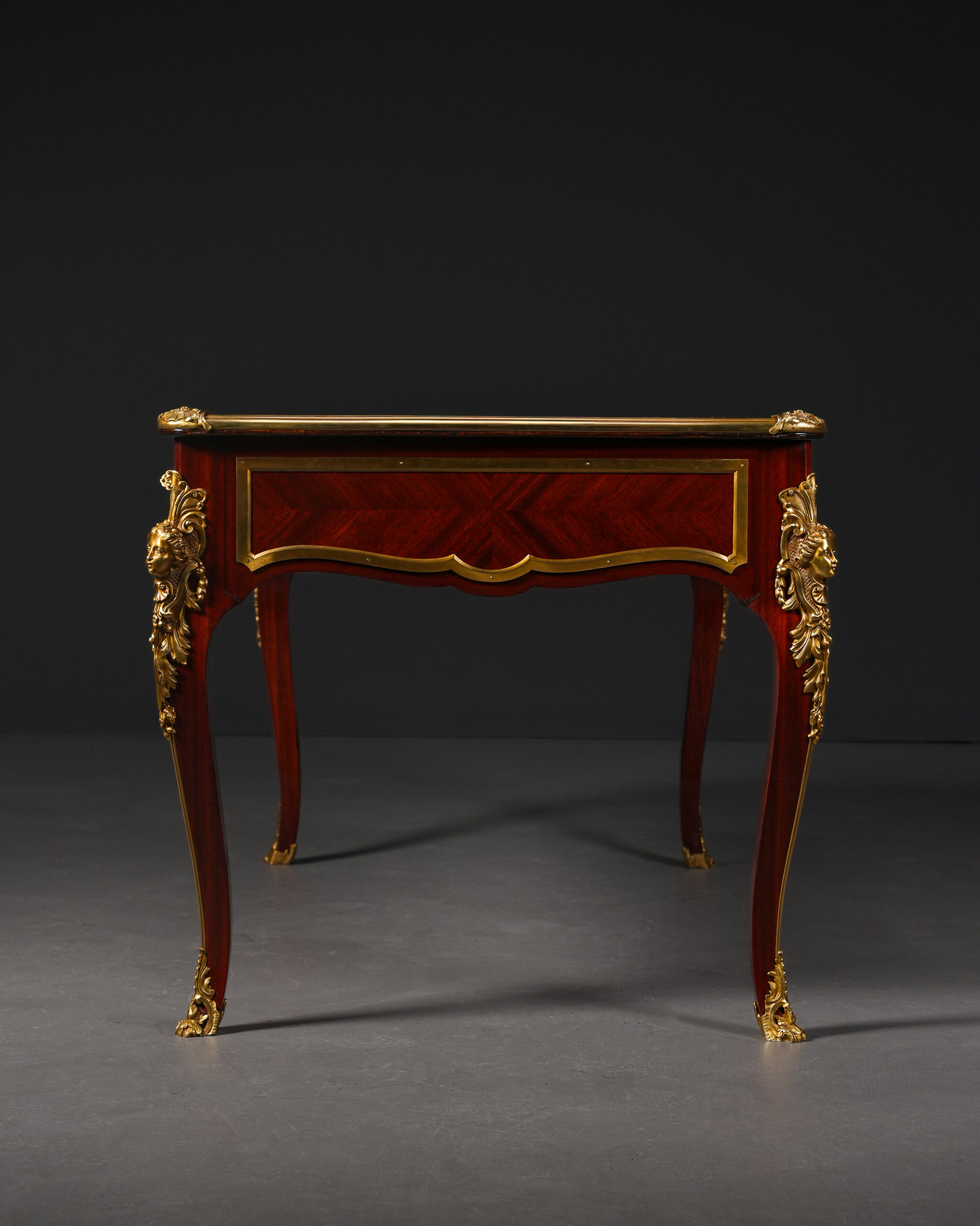 Kavisli gövde formu ve cabriole ayak yapısı, Louis XV stilinin karakteristik özelliklerini taşır. Çekmece yüzeylerinde kullanılan geometrik maun kaplama desenleri, altın tonlu bronz çerçevelerle vurgulanmış; orta bölümde yer alan kabartmalı bronz motif kompozisyona dengeli ve ihtişamlı bir görünüm kazandırmıştır. Köşelerde ve ayaklarda görülen figüratif bronz aplikler, parçaya saray estetiğini çağrıştıran güçlü bir karakter katmaktadır.