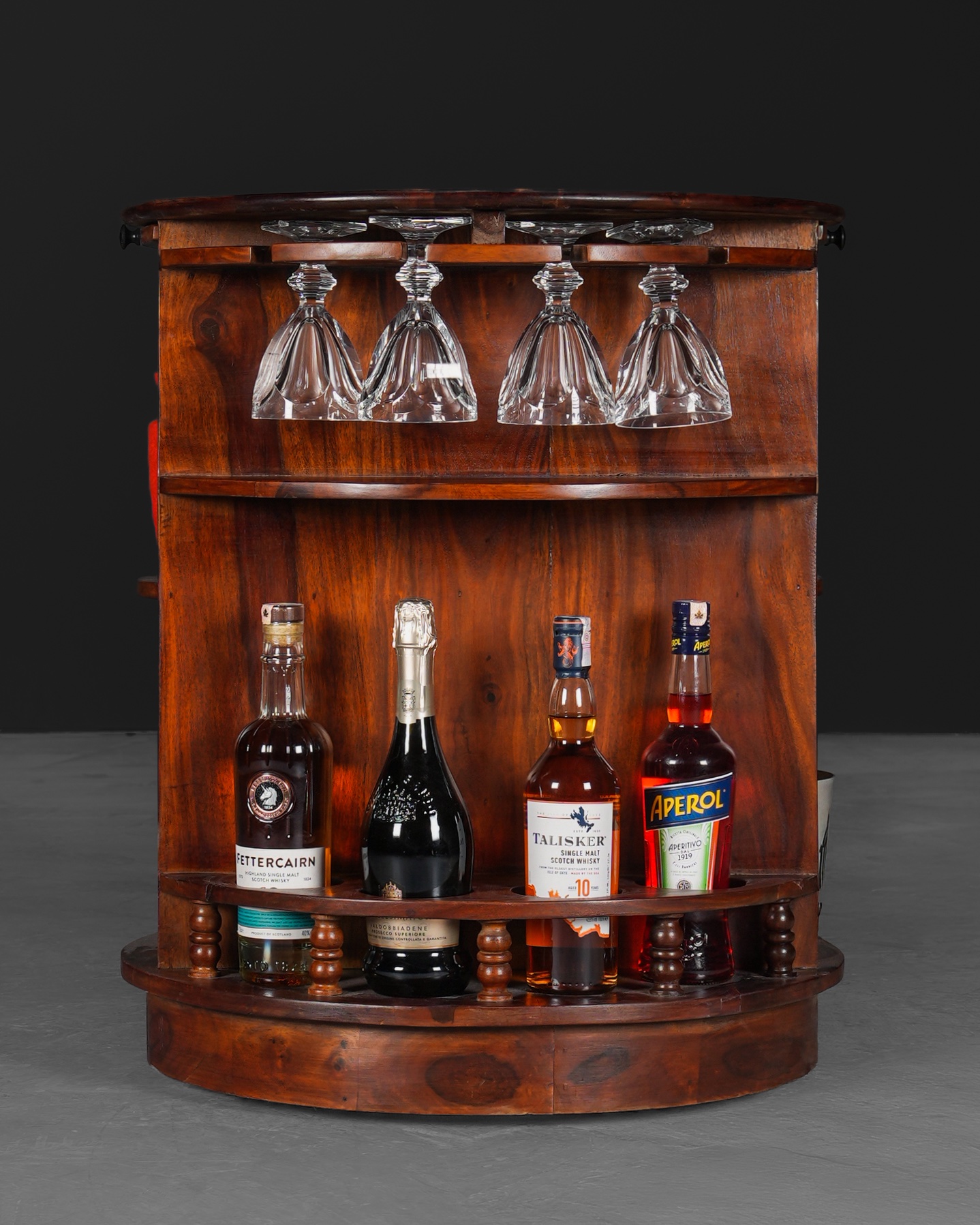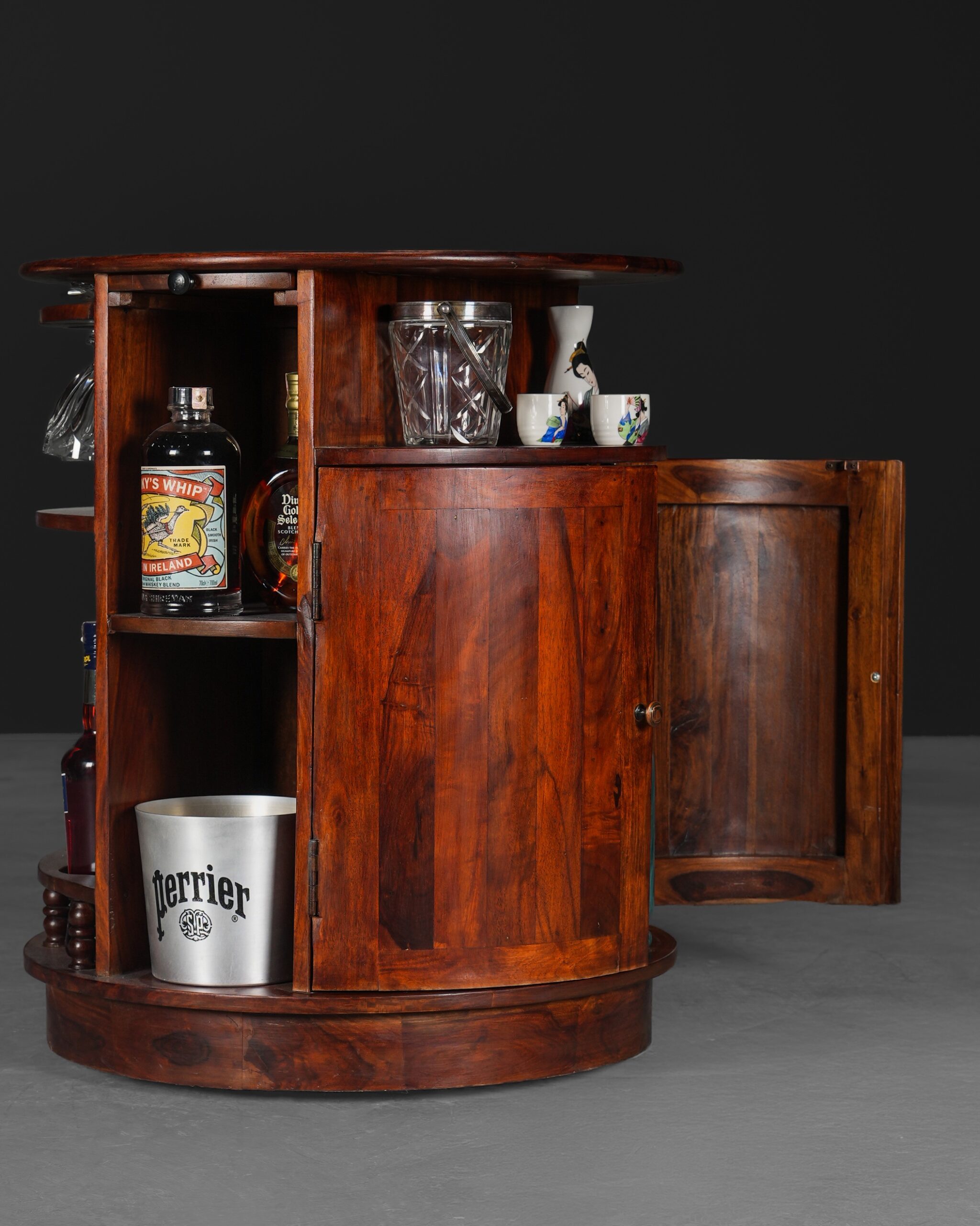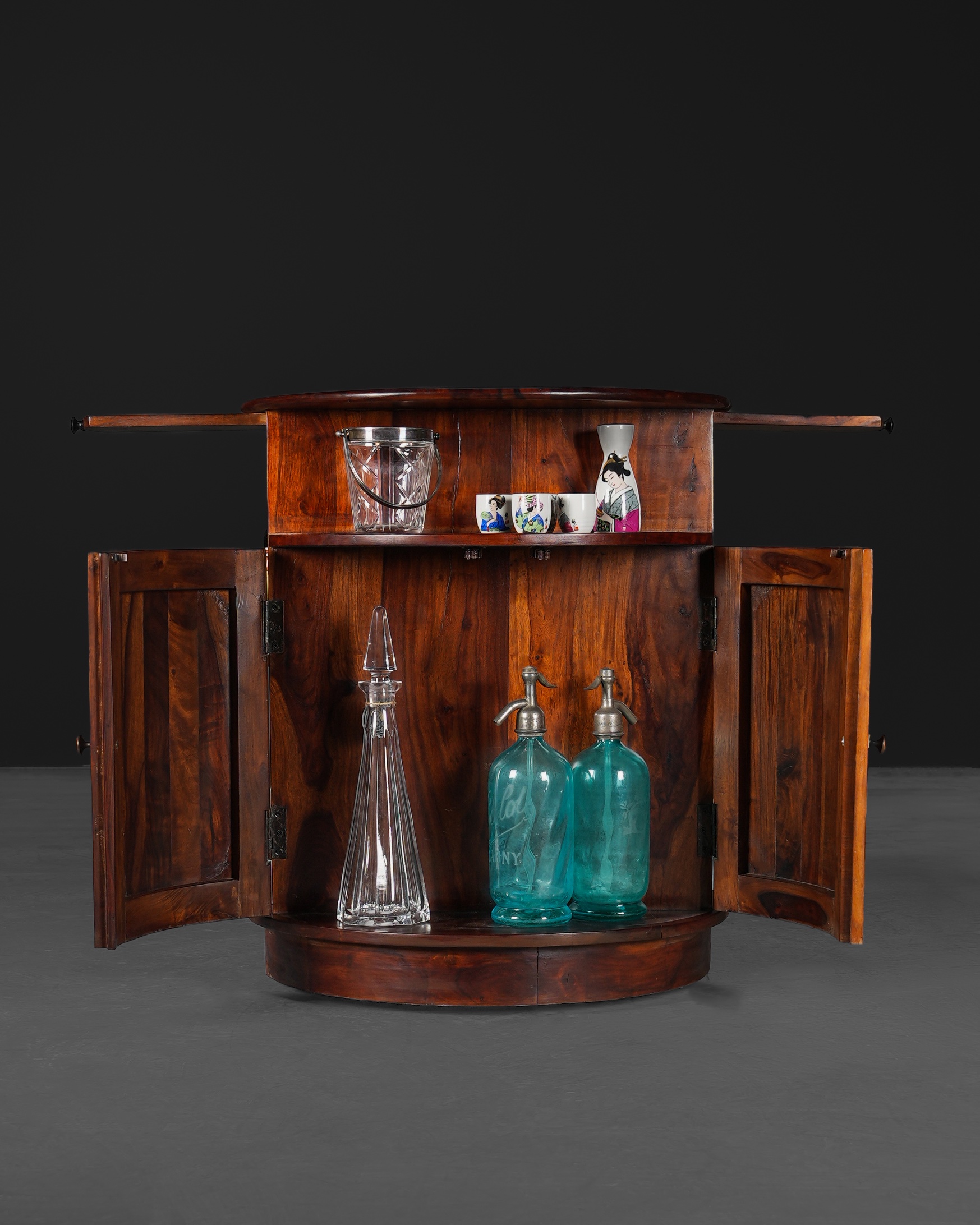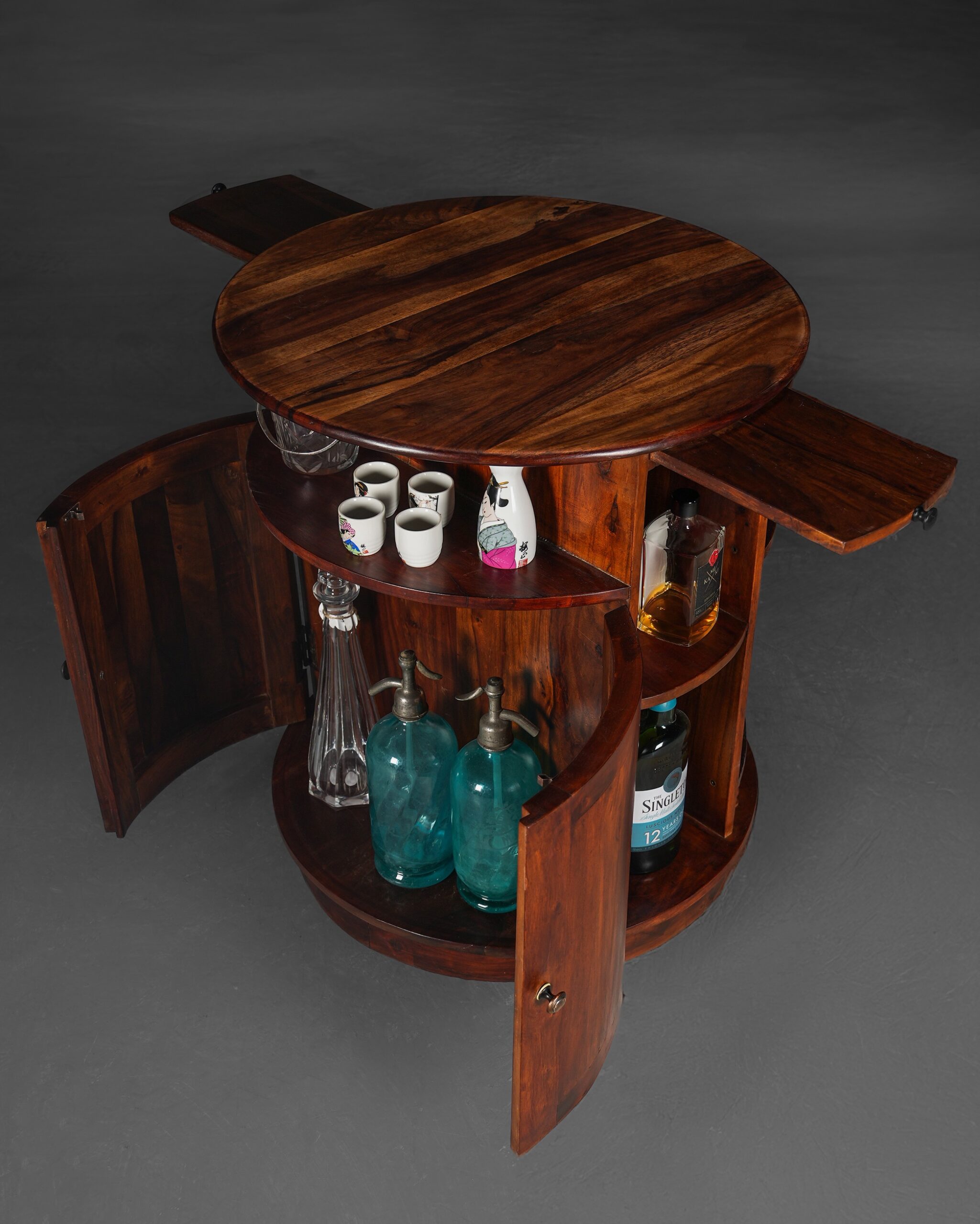 Sisam ağacından üretilmiş, kendi etrafında 360° dönen, akılcı ve pratik bir tasarıma sahip bu silindir bar; bir yandan yerden tasarruf etmenizi sağlarken bir yandan da size tam teşekküllü bir barın konforunu sunacaktır.