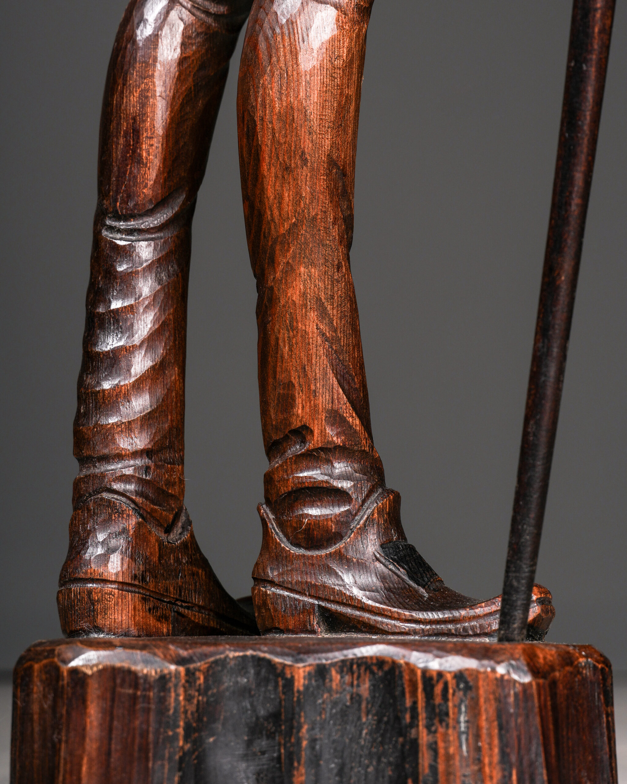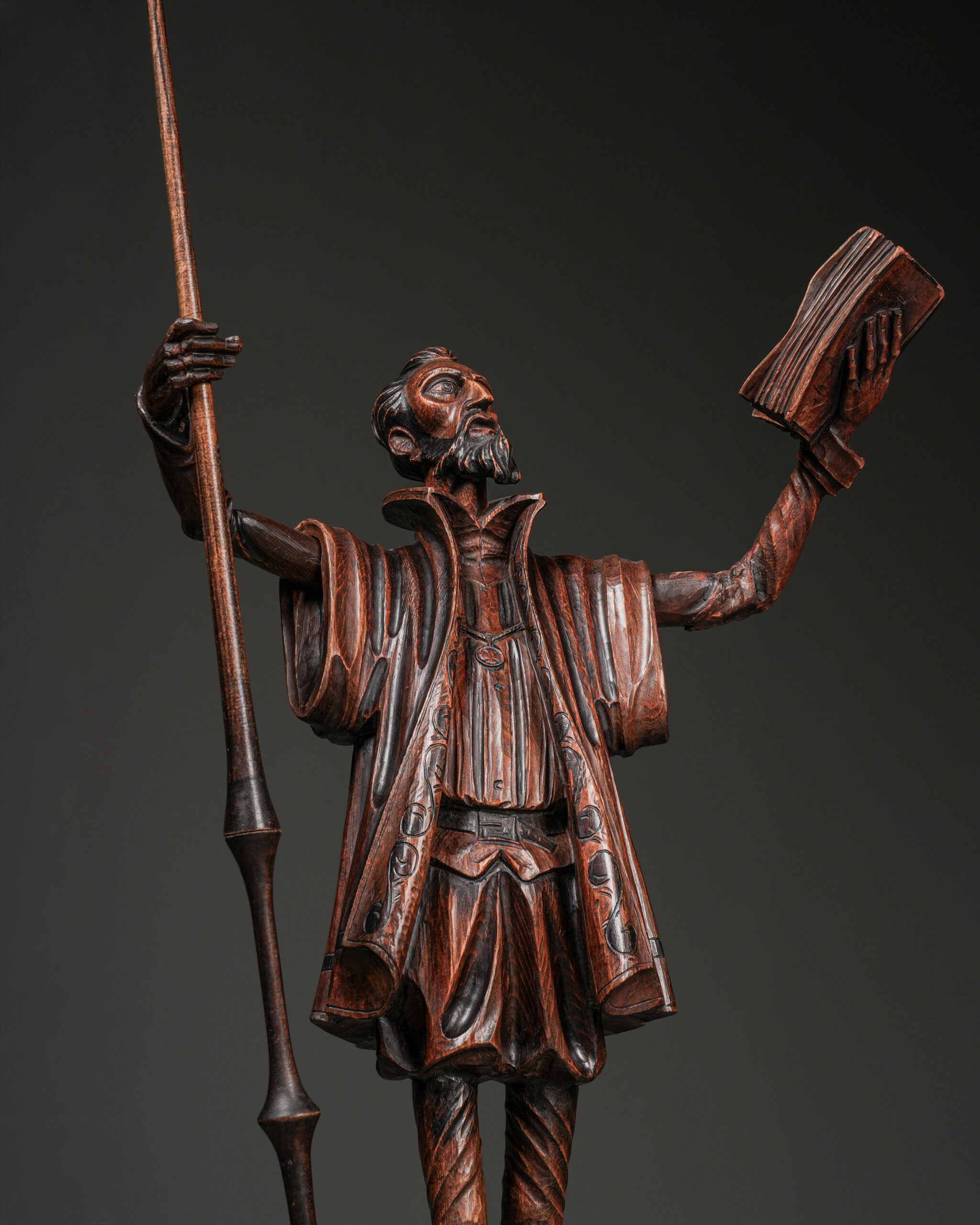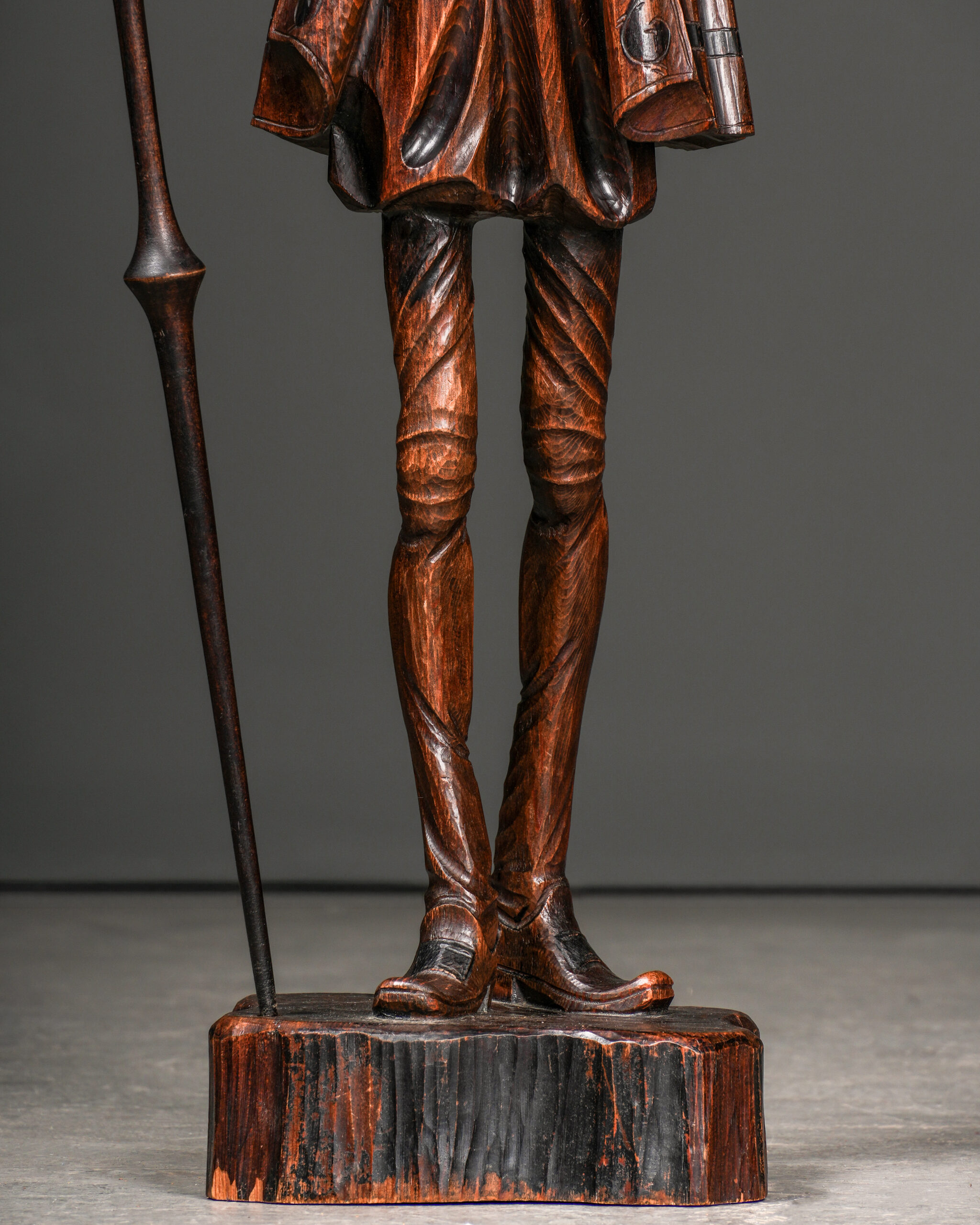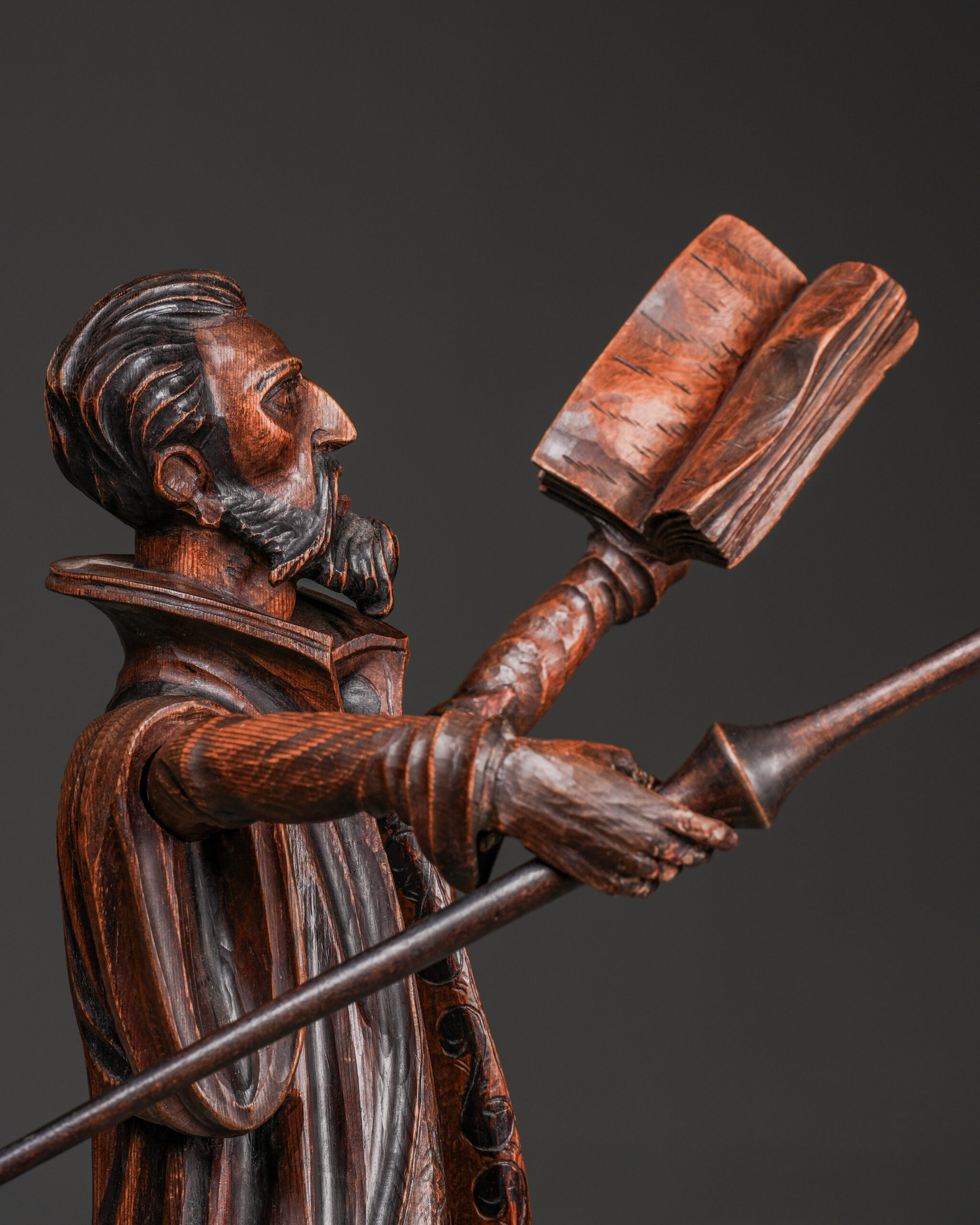 Masif ahşaptan ustalıkla oyularak oluşturulan bu eser, figürün ince uzun oranları ve hareketli duruşuyla dikkat çeker. Giysi kıvrımları, yüz ifadesi ve duruşundaki dramatik etki; heykelin karakterini güçlü bir şekilde yansıtır. El işçiliğinin izlerini taşıyan yüzey dokusu, objeye hem sıcaklık hem de özgünlük kazandırır.