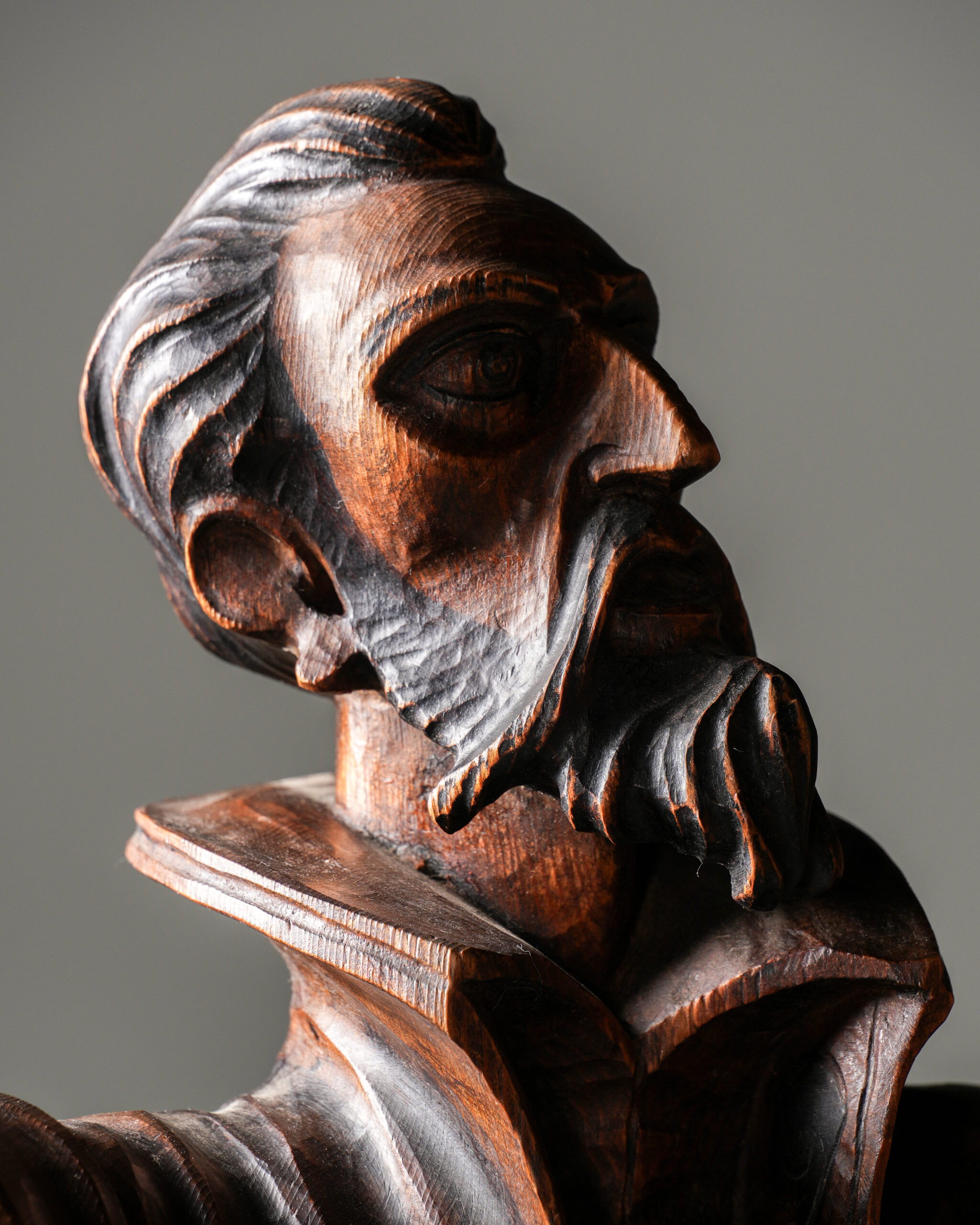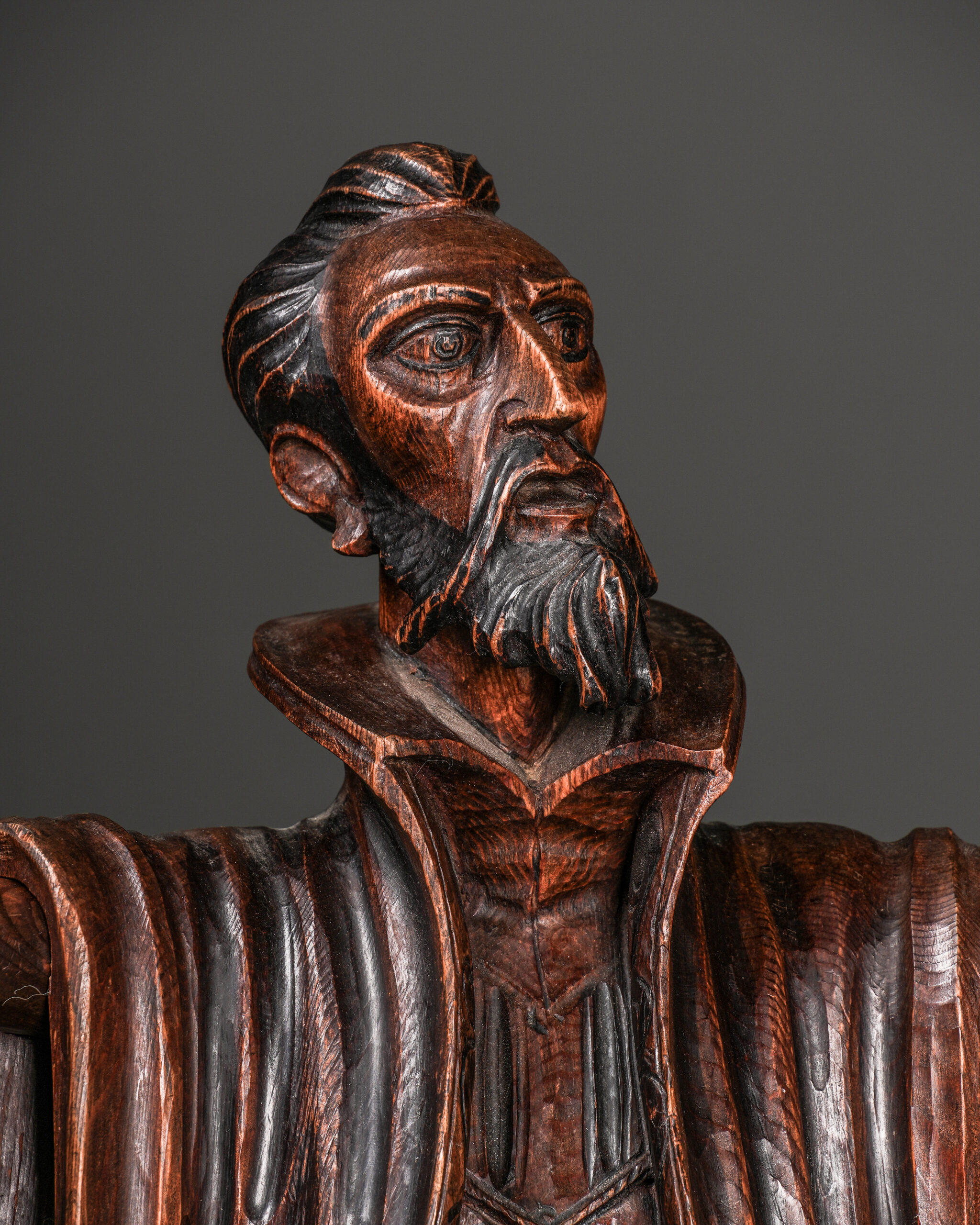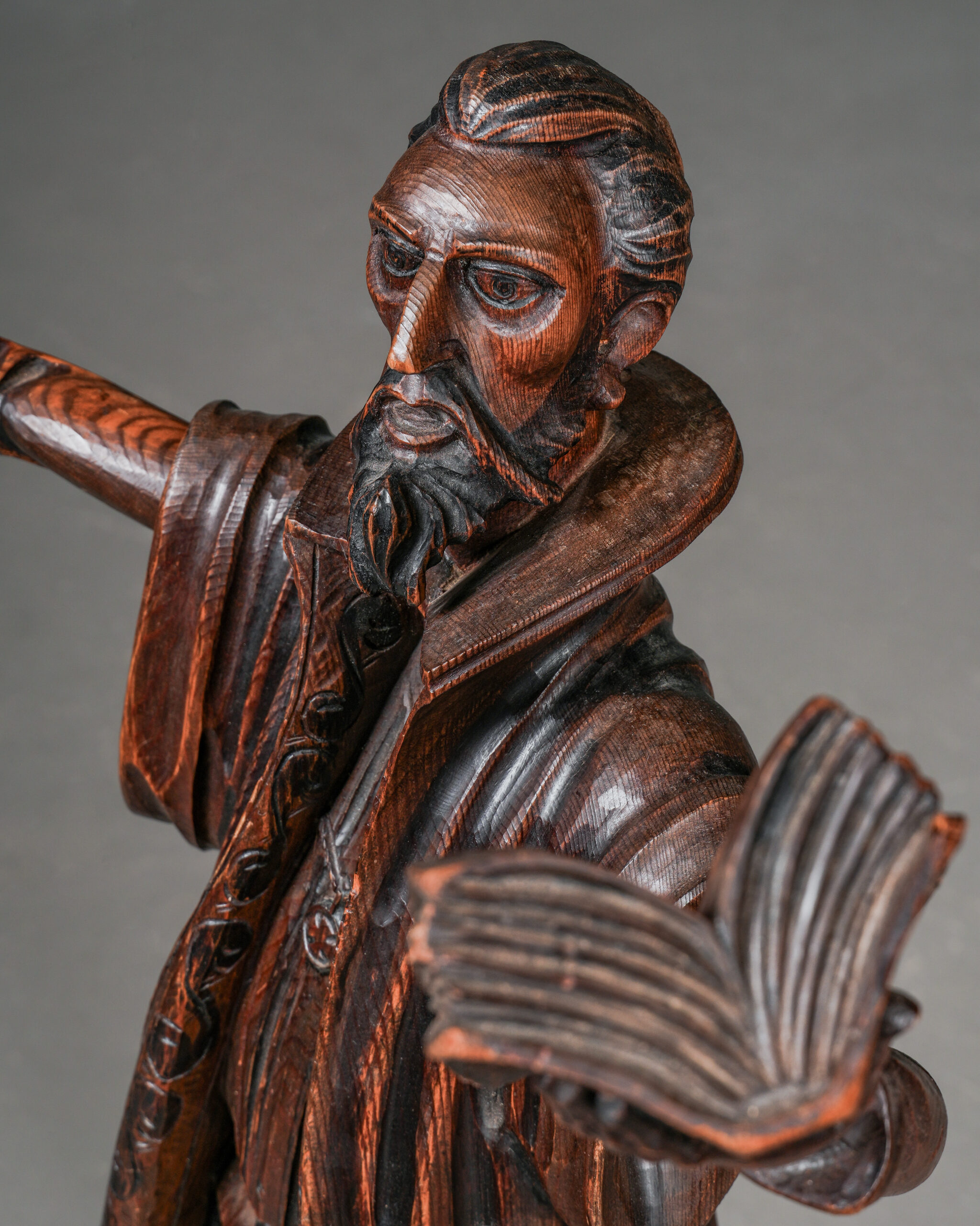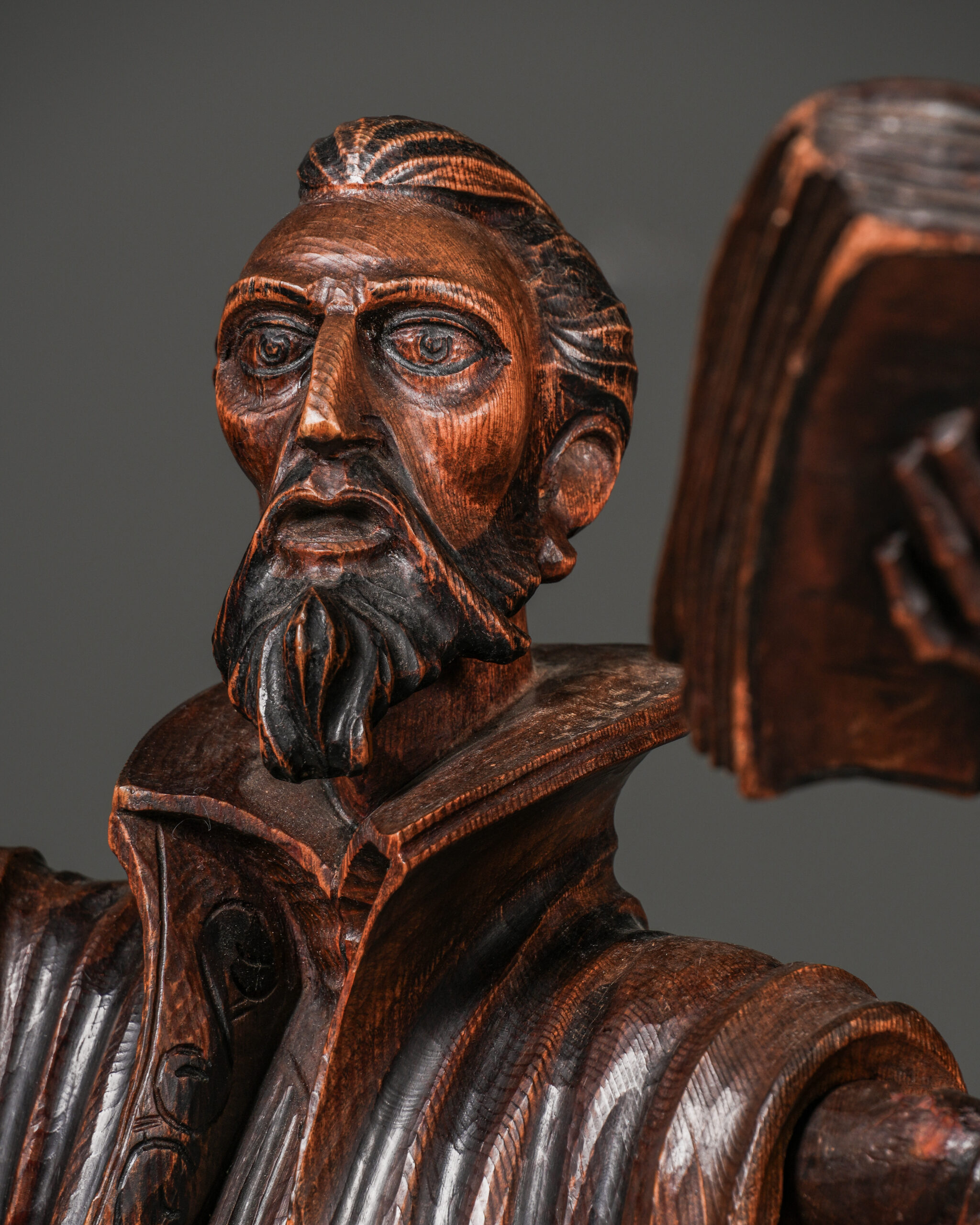 Masif ahşaptan ustalıkla oyularak oluşturulan bu eser, figürün ince uzun oranları ve hareketli duruşuyla dikkat çeker. Giysi kıvrımları, yüz ifadesi ve duruşundaki dramatik etki; heykelin karakterini güçlü bir şekilde yansıtır. El işçiliğinin izlerini taşıyan yüzey dokusu, objeye hem sıcaklık hem de özgünlük kazandırır.