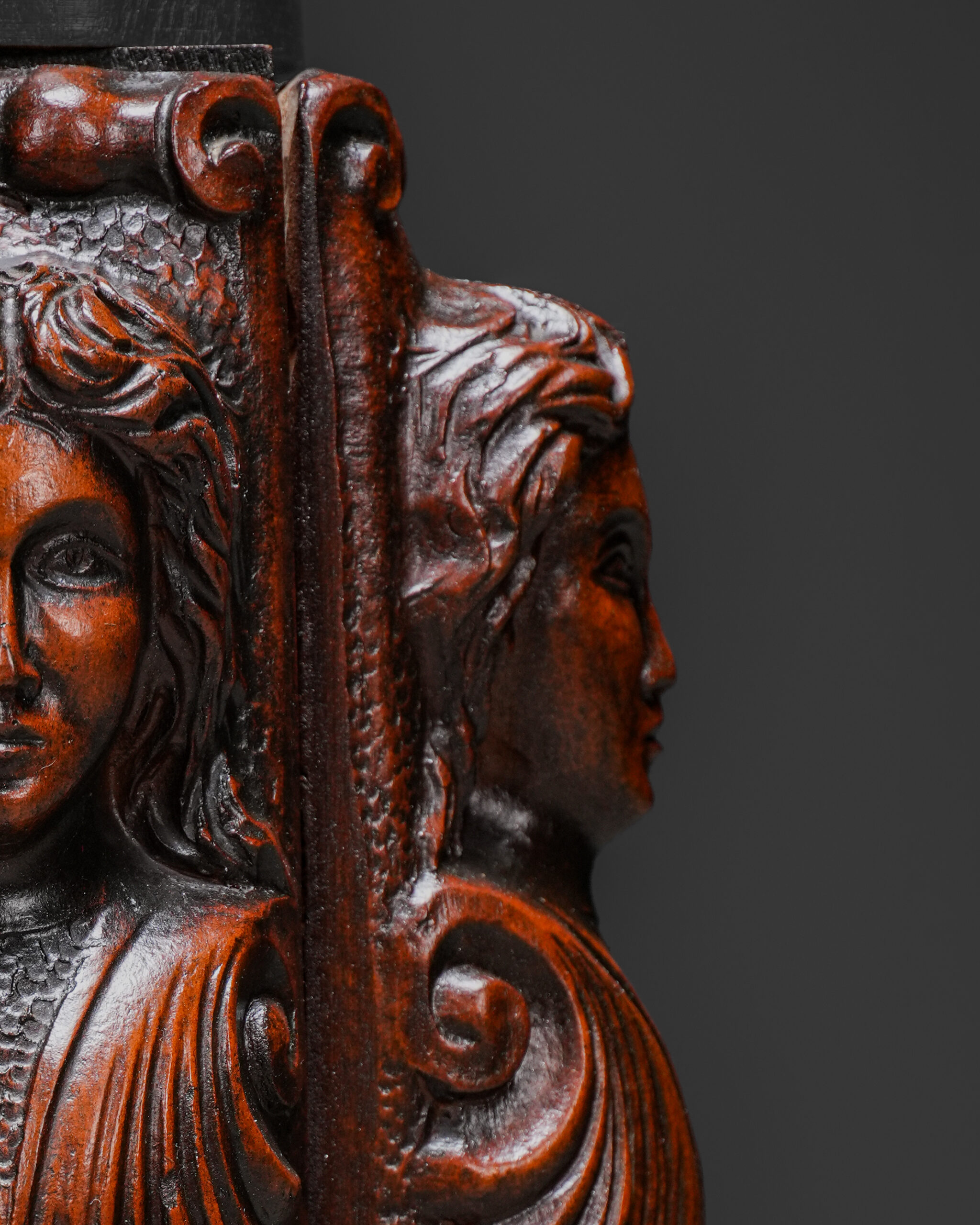 Askılığın en dikkat çekici kısmı olan kaide bölümünde yer alan kanatlı kadın figürleri (caryatid), Rönesans mimarisinden esinlenen heykelsi bir tasarım anlayışını ortaya koyar. Drapeli kıyafetleri ve stilize kanatlarıyla betimlenen bu figürler, mobilyanın taşıyıcı elemanı olarak tasarlanmış olup dönemin Neo-Rönesans dekoratif sanatlarının karakteristik özelliklerinden biridir.