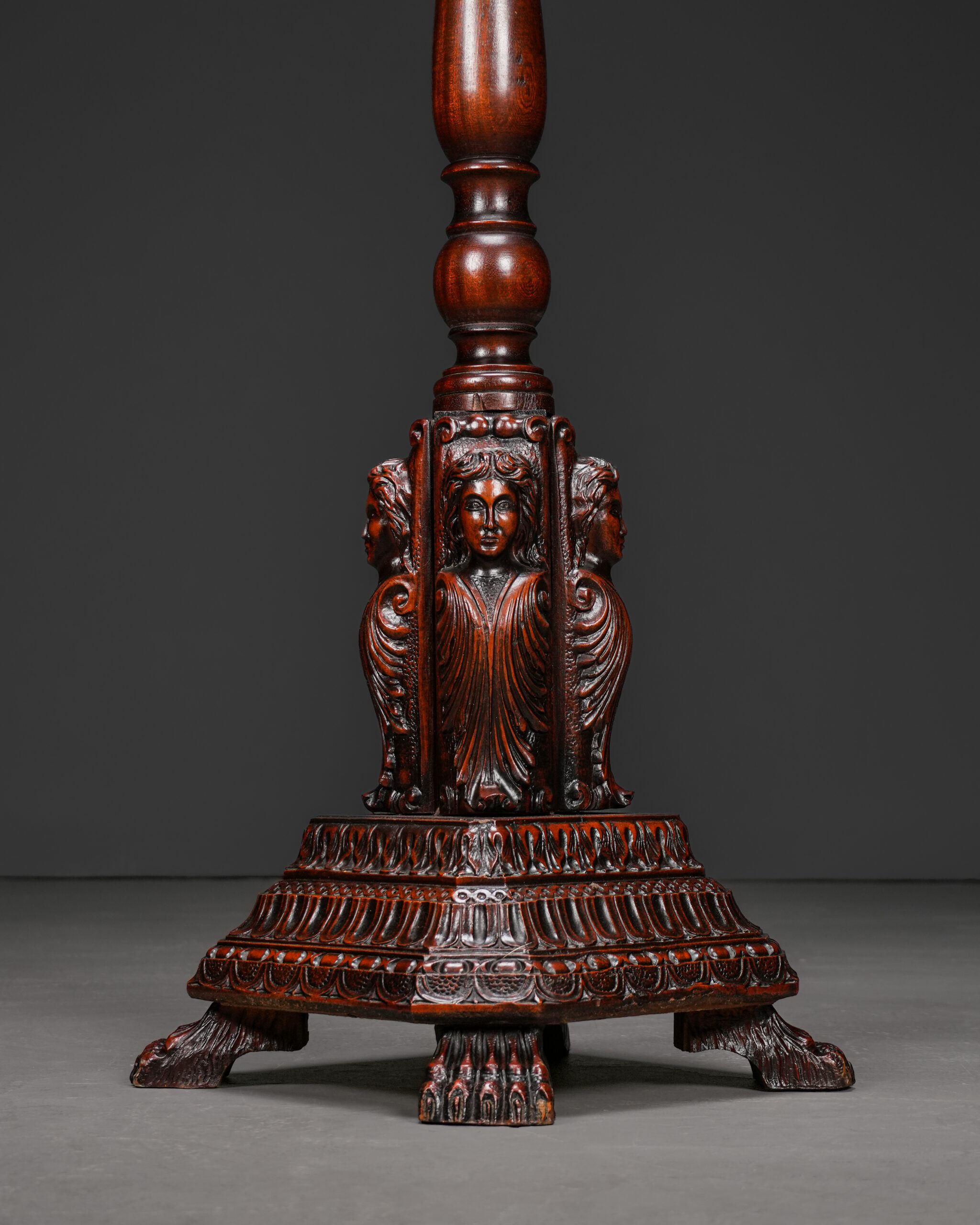 Katmanlı mimari kaide formu, yoğun oyma bezemeler ve pençe ayak detaylarıyla tamamlanan bu parça, 19. yüzyıl Avrupa üretimi Neo-Rönesans stil mobilyaların güçlü ve görkemli estetiğini yansıtır. Hem koleksiyonluk hem de mekân içerisinde heykelsi bir odak noktası oluşturabilecek nitelikte nadir bir dekoratif objedir.