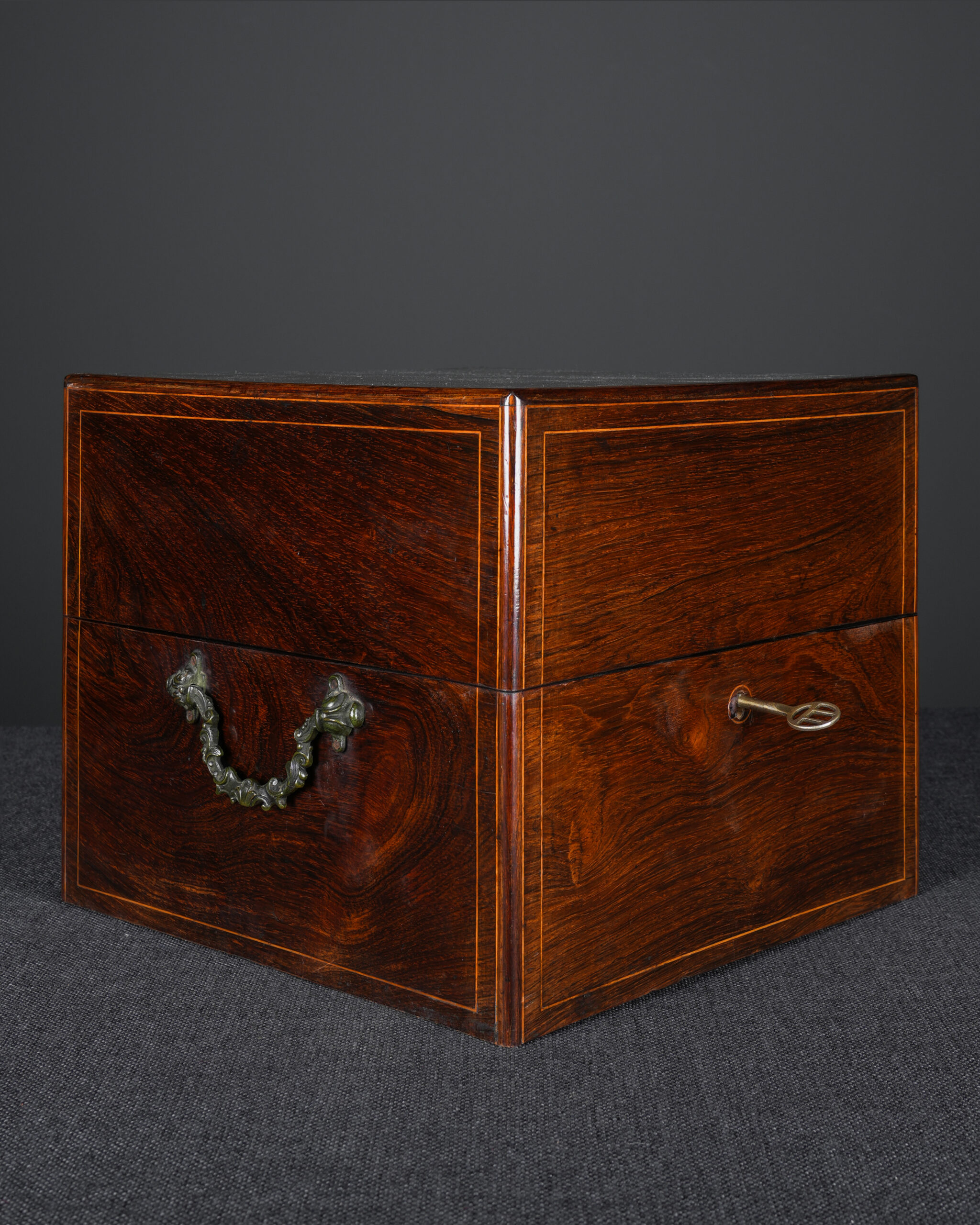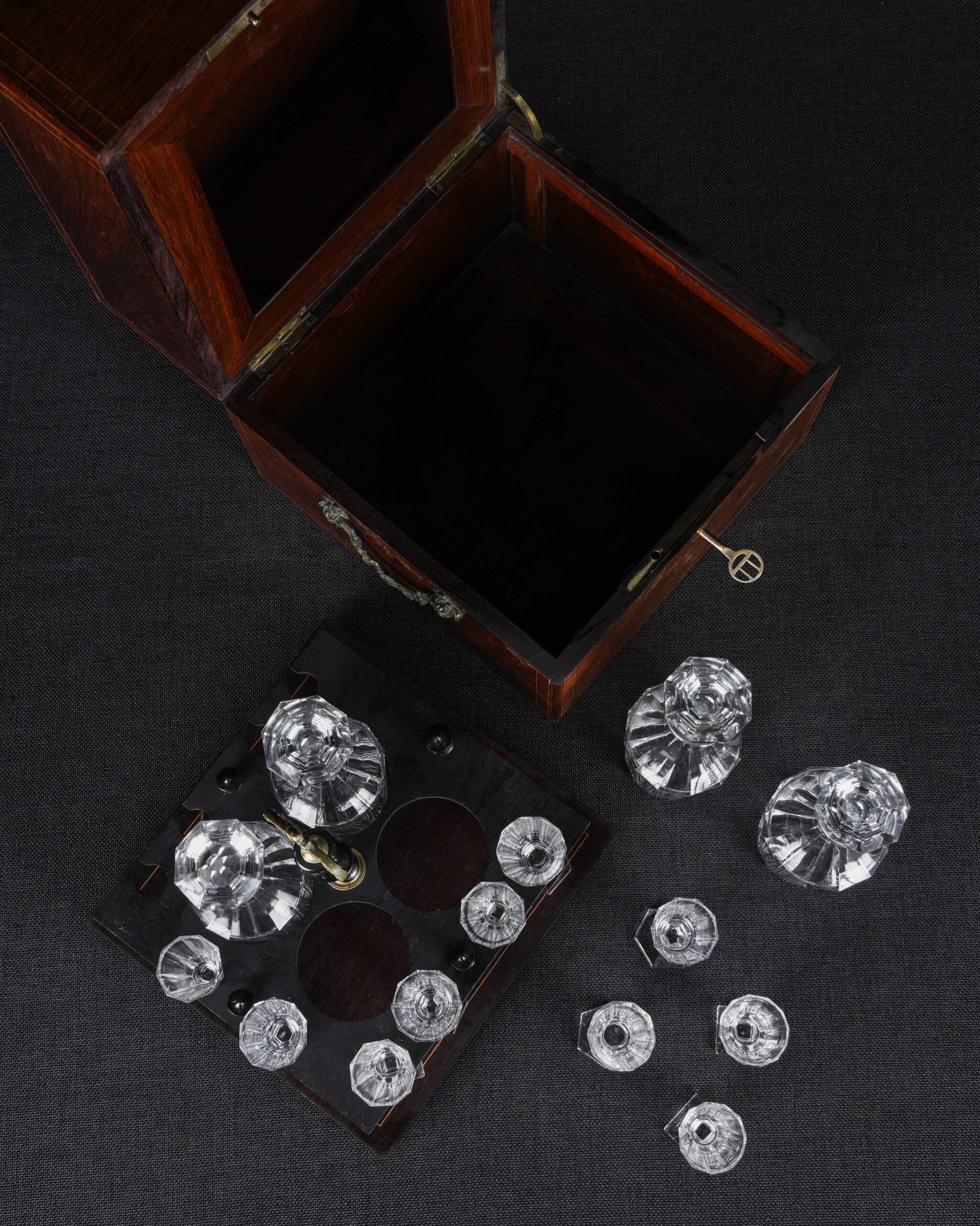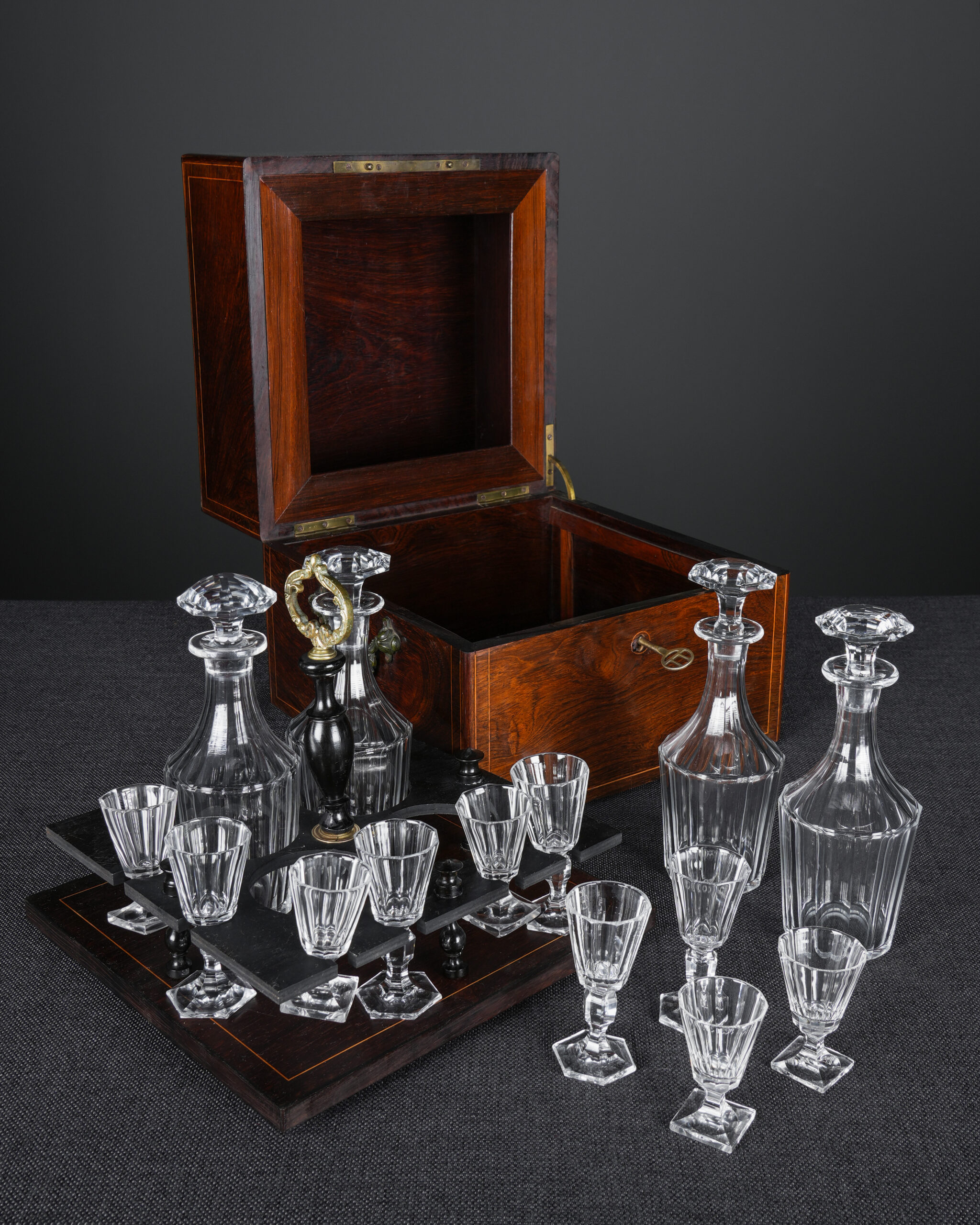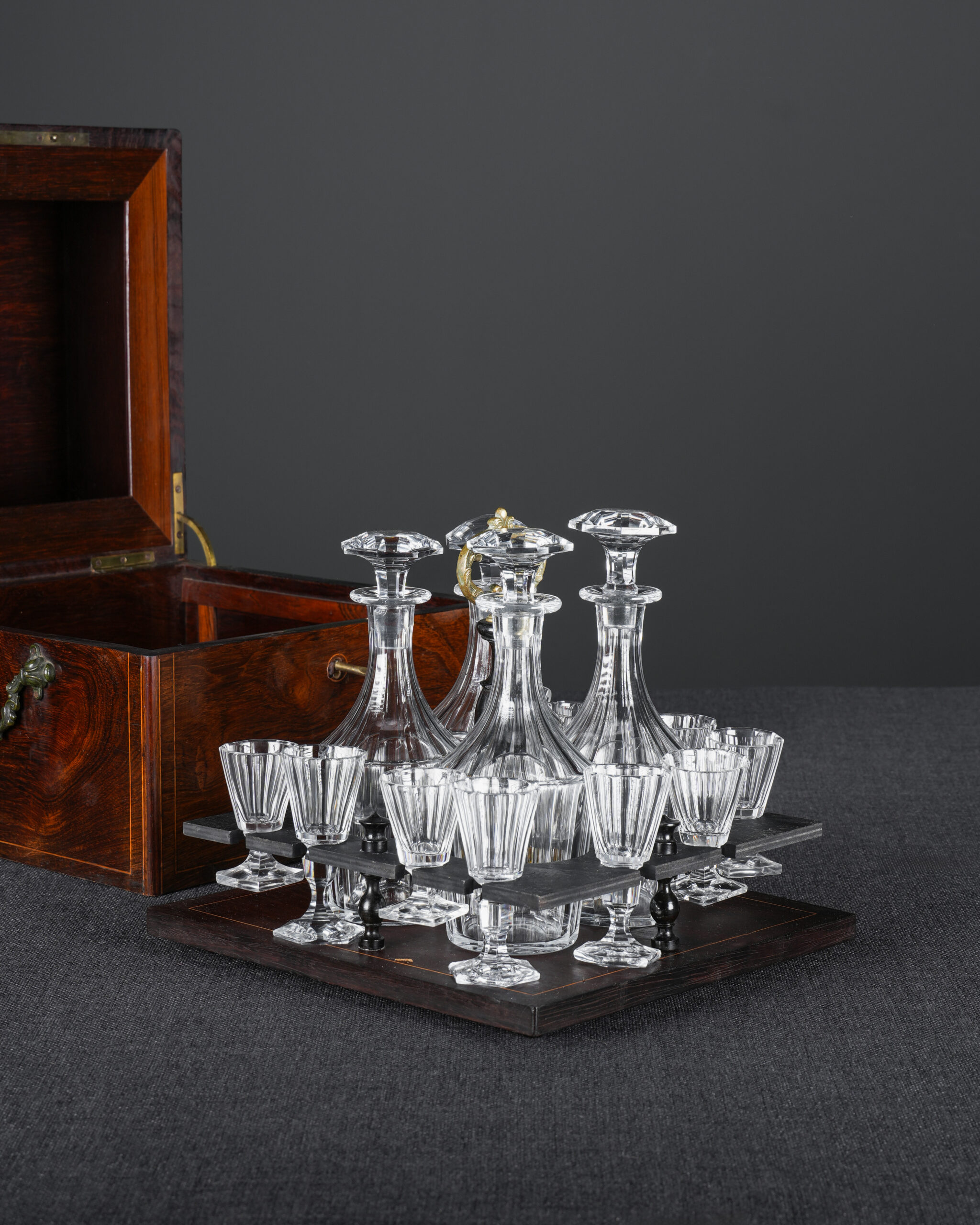 Pirinç ve sedef kakmalı ceviz kutu içinde dört adet kristal karaf ve 10 adet kristal kadeh bulunur.
