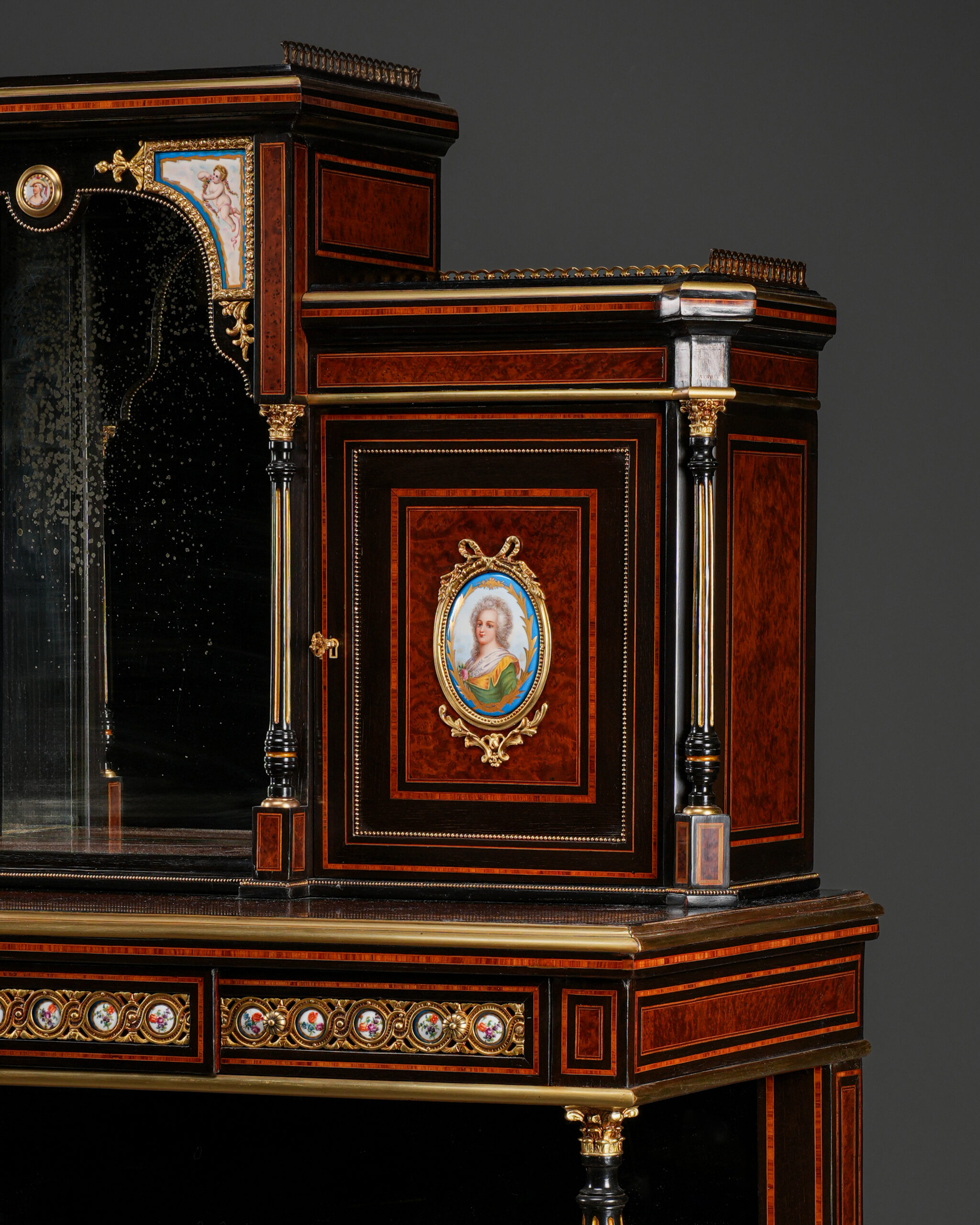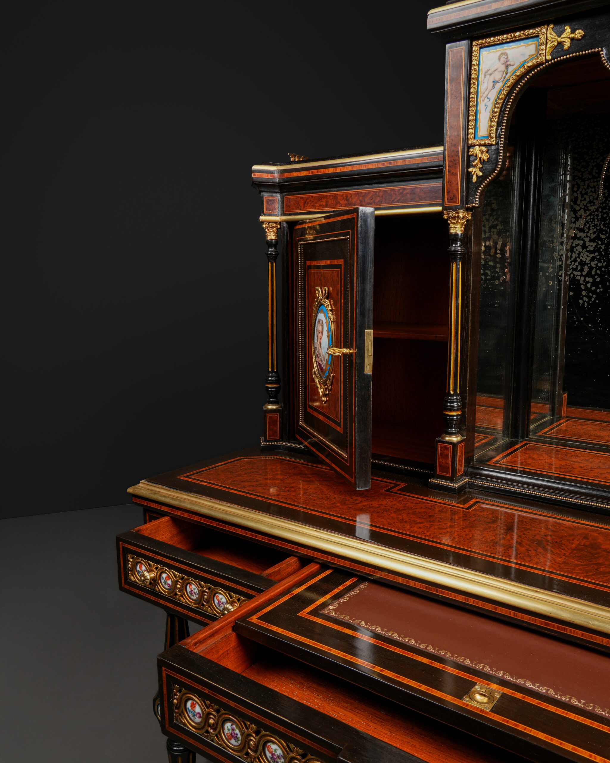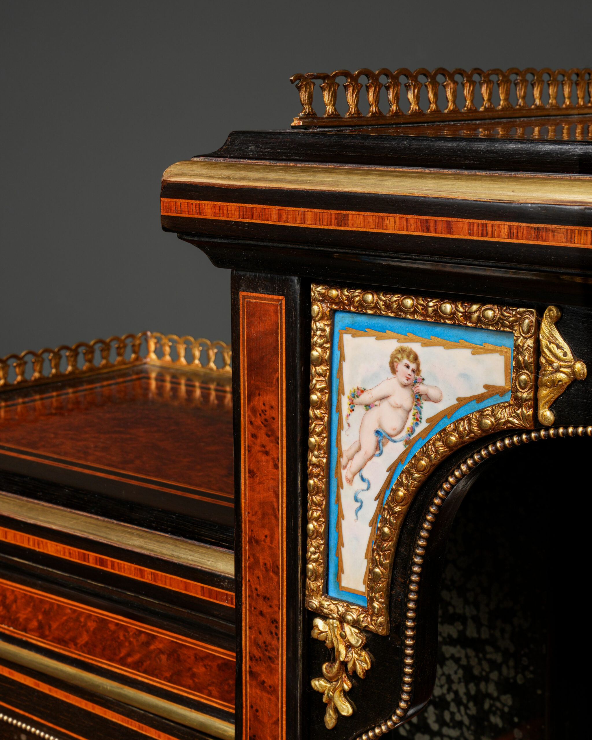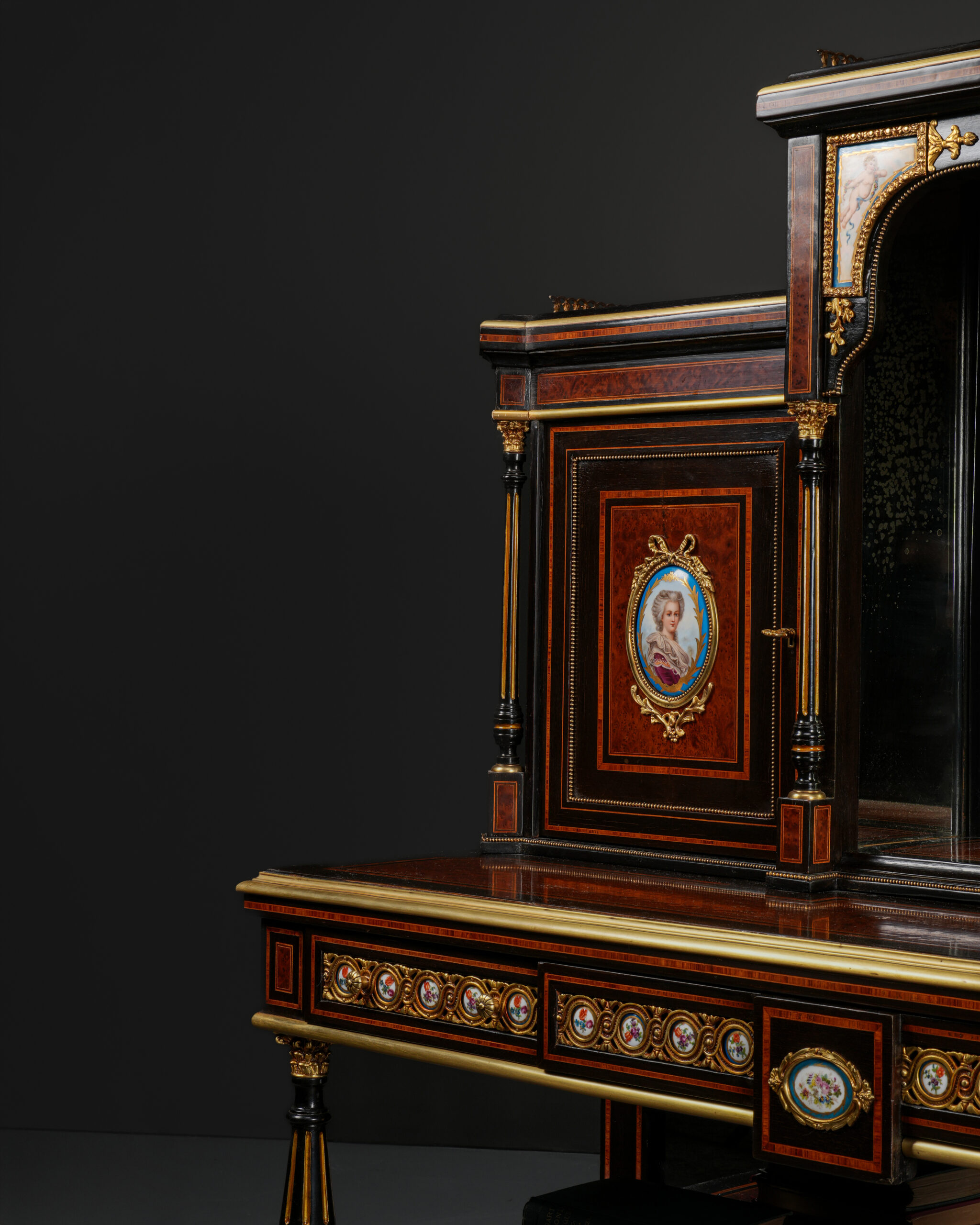 Parça, göz alıcı damarlara sahip amboyna kaplama ile zenginleştirilmiş; ince kakma işçiligi ve bronz detaylarla tamamlanmıştır. Kapak ve paneller üzerinde yer alan el boyaması porselen portreler, dönemin aristokrat zevkini yansıtan güçlü dekoratif unsurlar olarak öne çıkar.