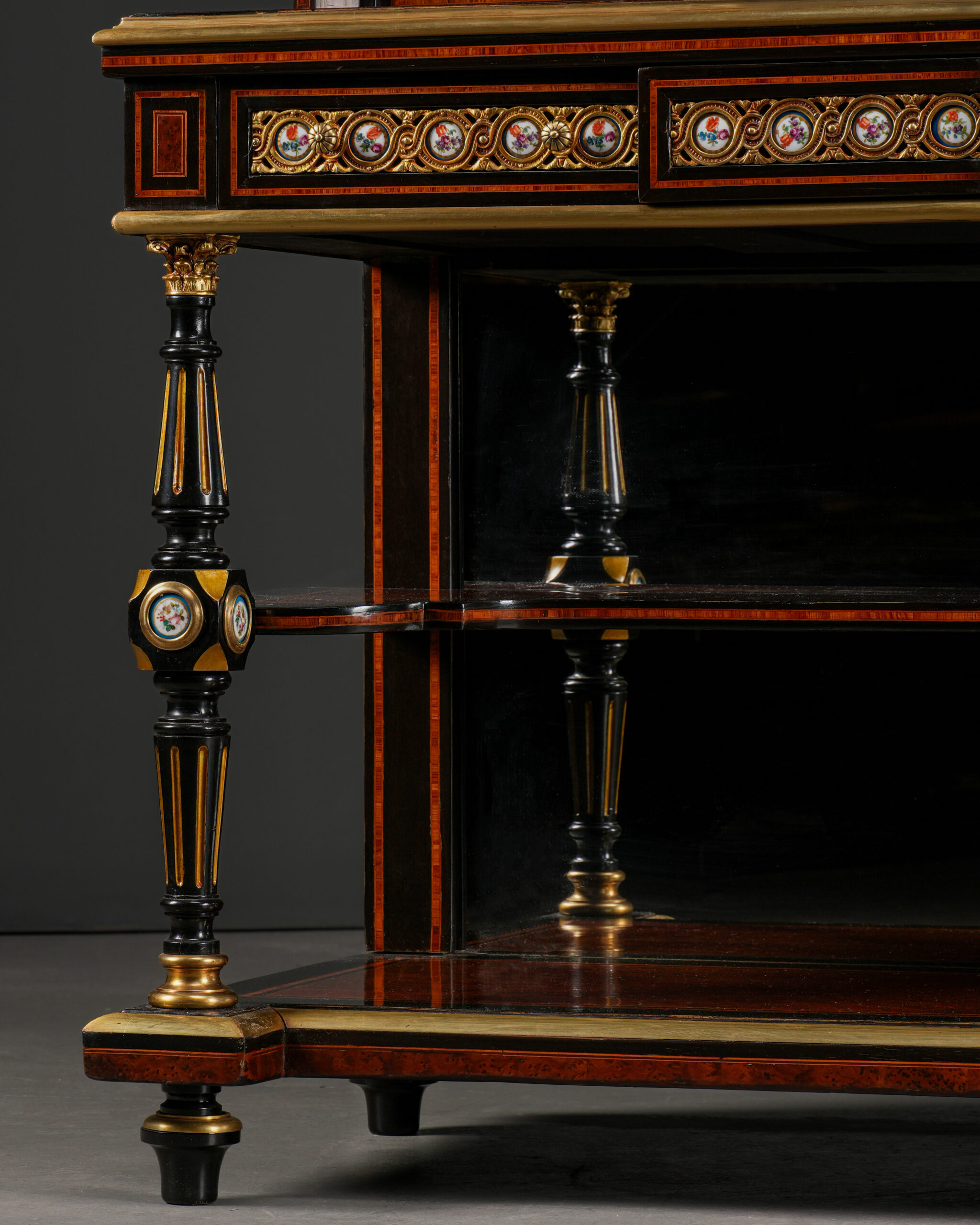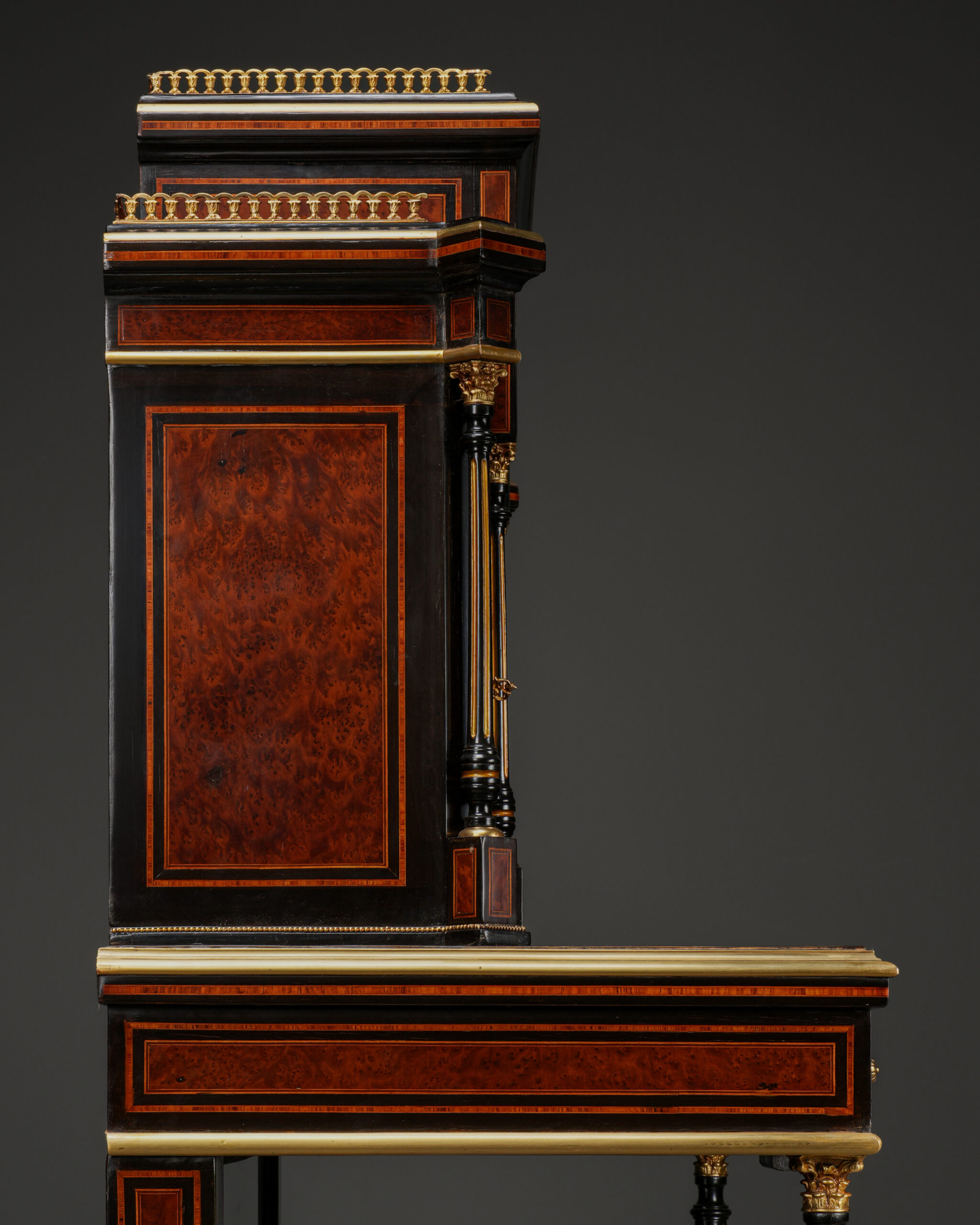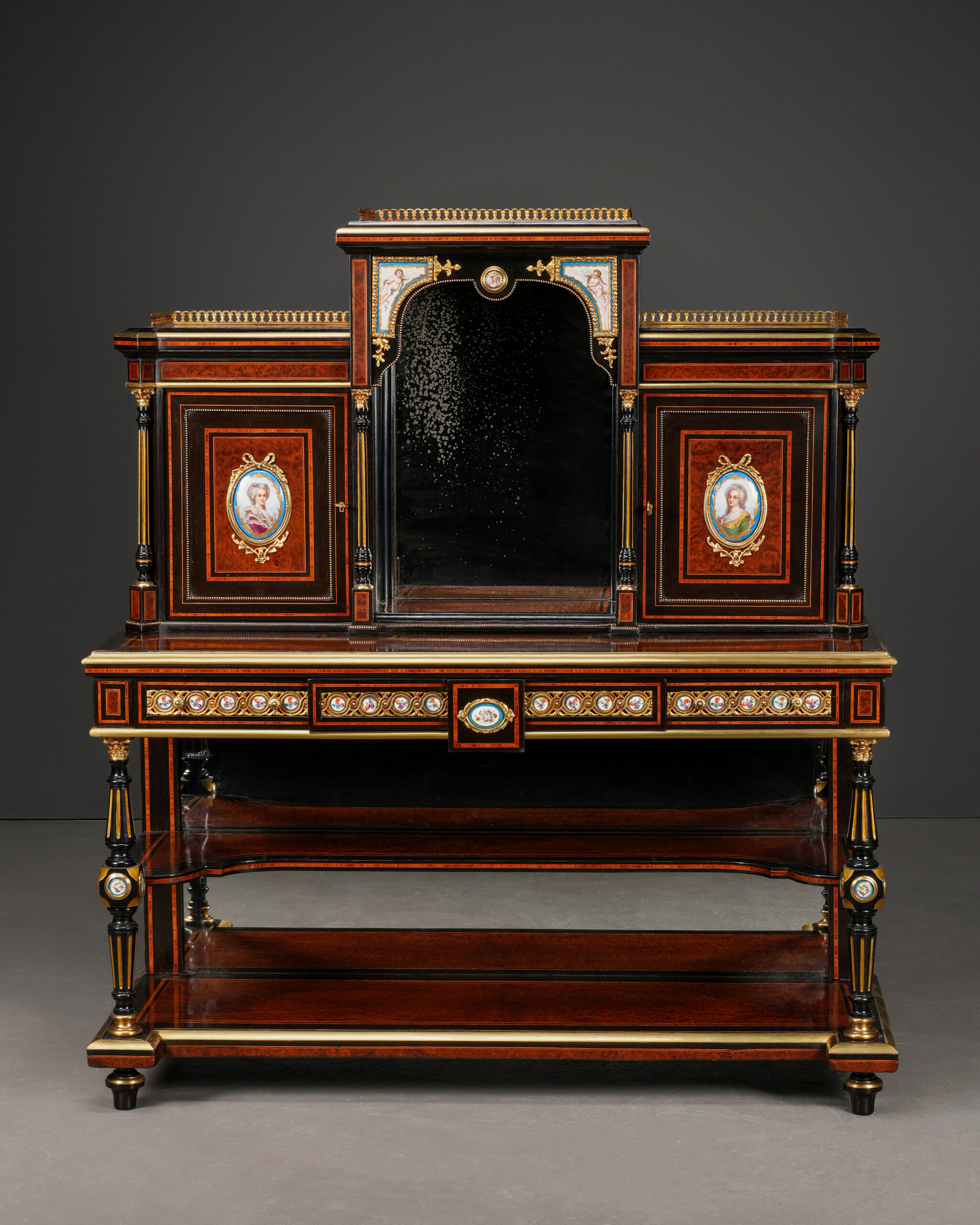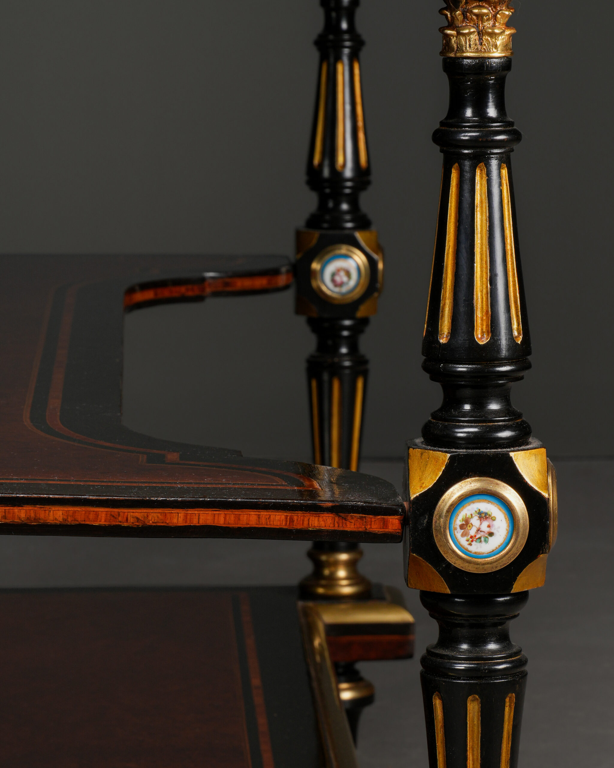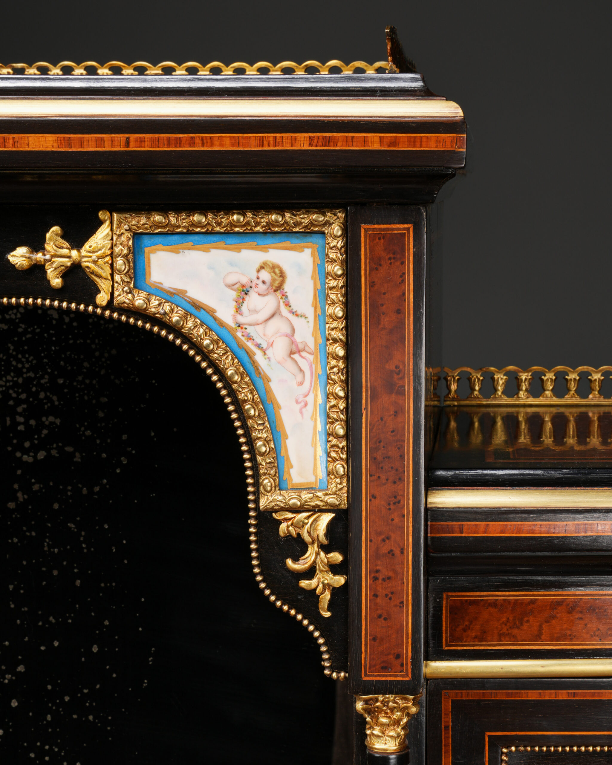 Parça, göz alıcı damarlara sahip amboyna kaplama ile zenginleştirilmiş; ince kakma işçiligi ve bronz detaylarla tamamlanmıştır. Kapak ve paneller üzerinde yer alan el boyaması porselen portreler, dönemin aristokrat zevkini yansıtan güçlü dekoratif unsurlar olarak öne çıkar.