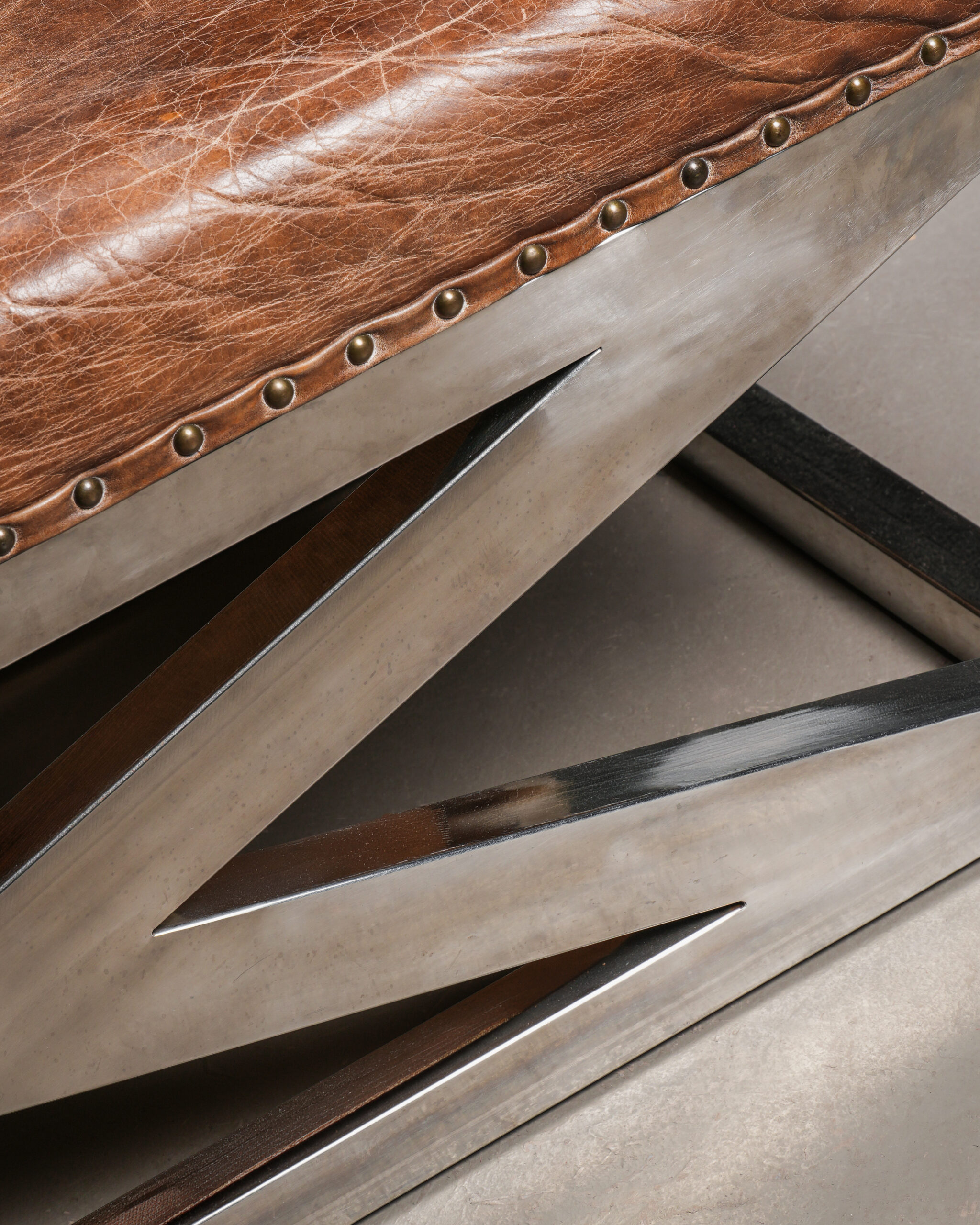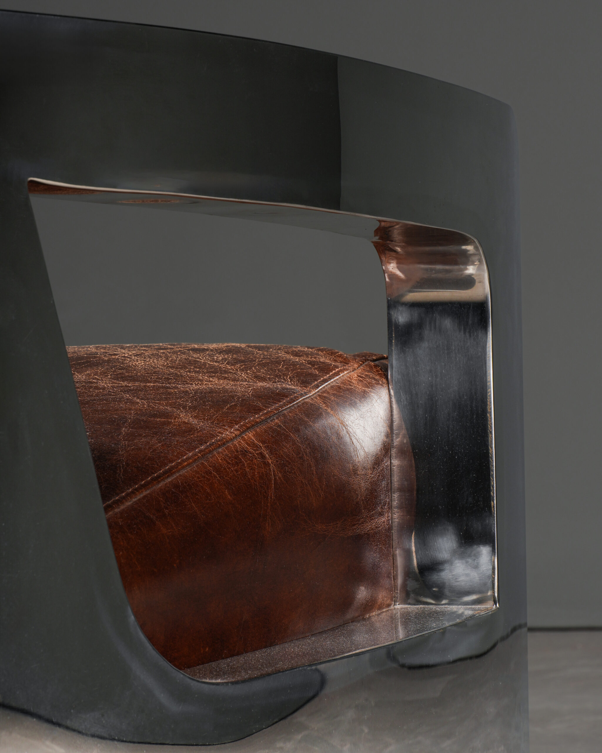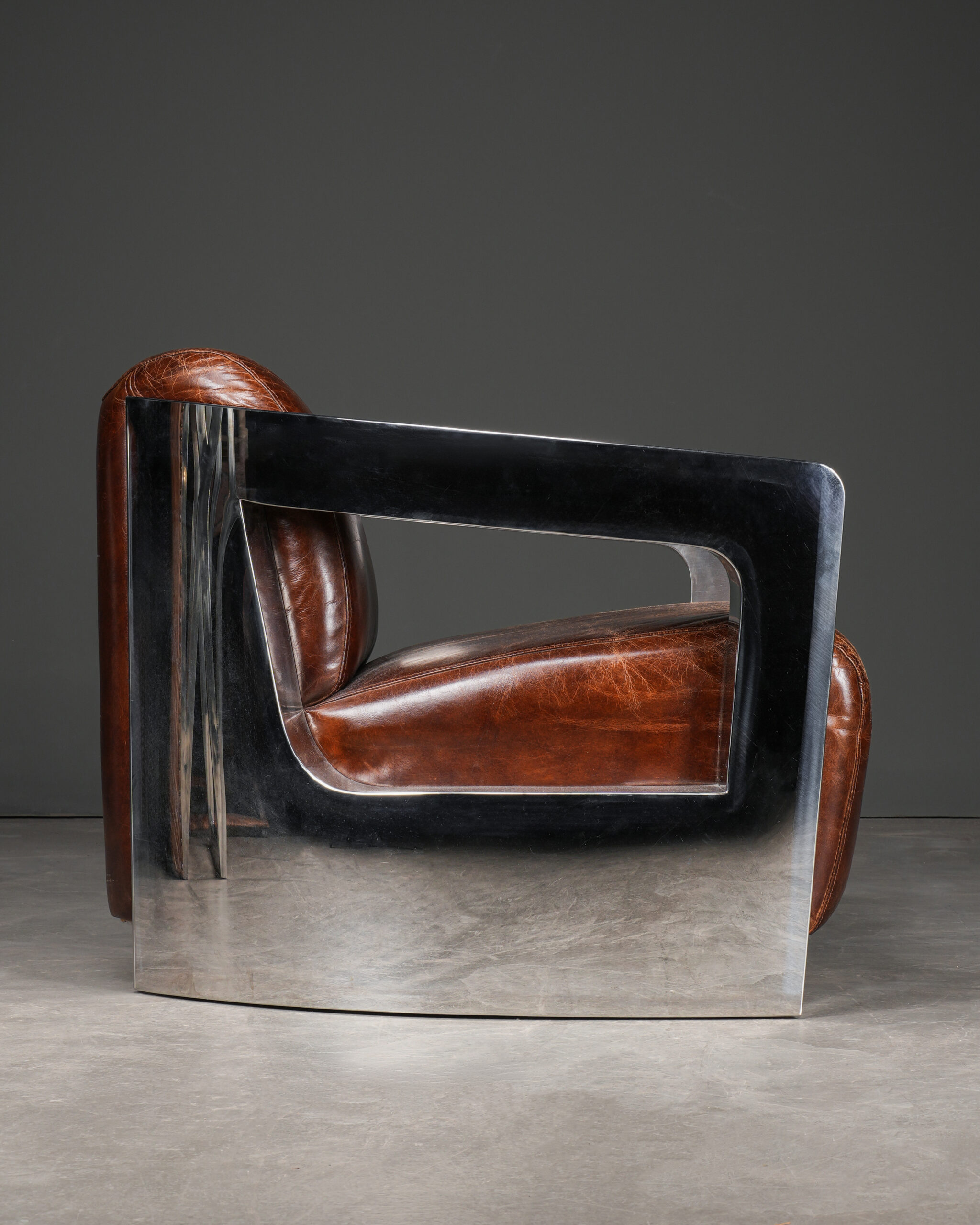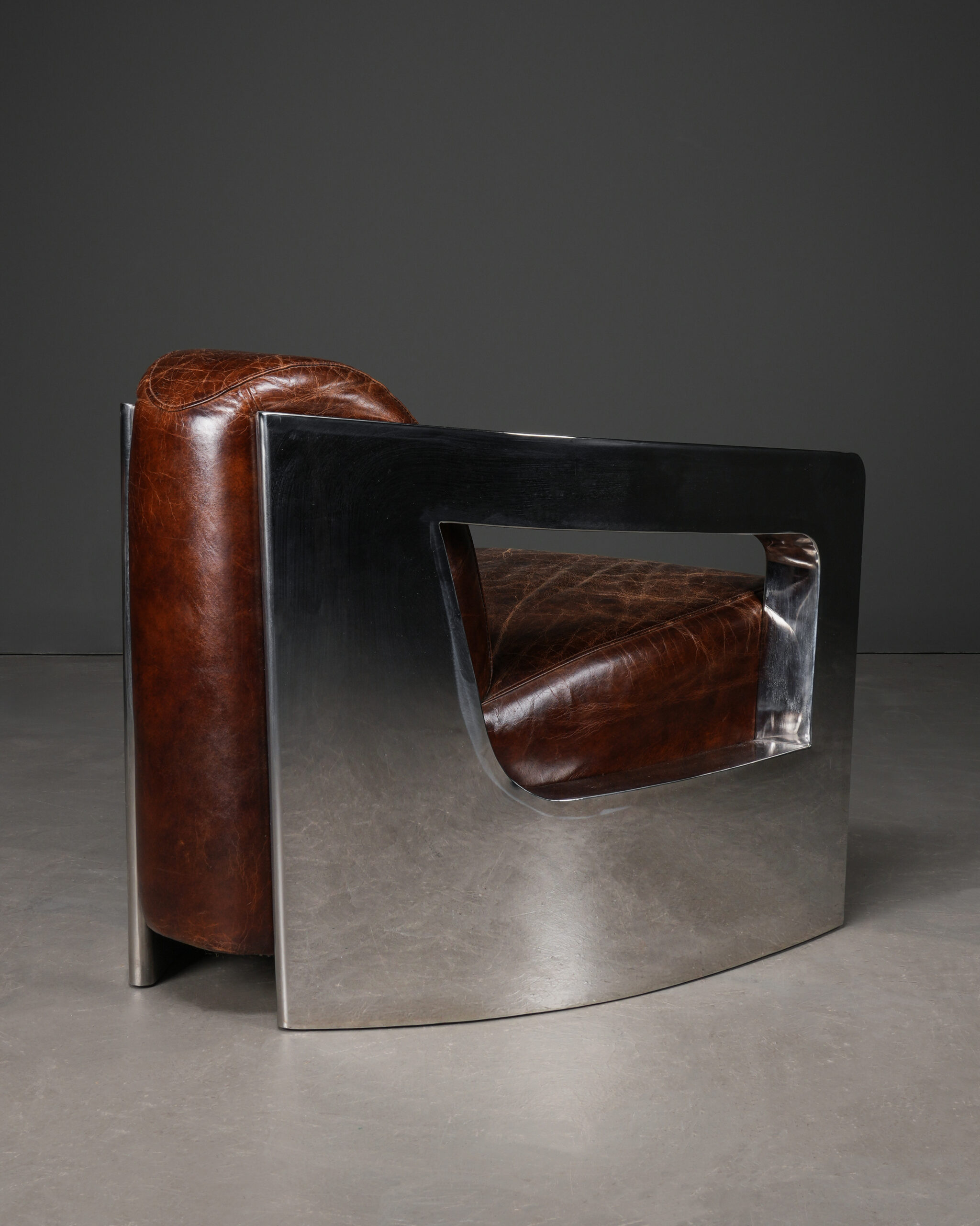 Bu fütüristik koltuk; bir yandan cilalı çelik iskeleti ile şeklen ve fikren modern görünürken bir yandan da eskitilmiş derisi sayesinde vintage bir etki bırakır.