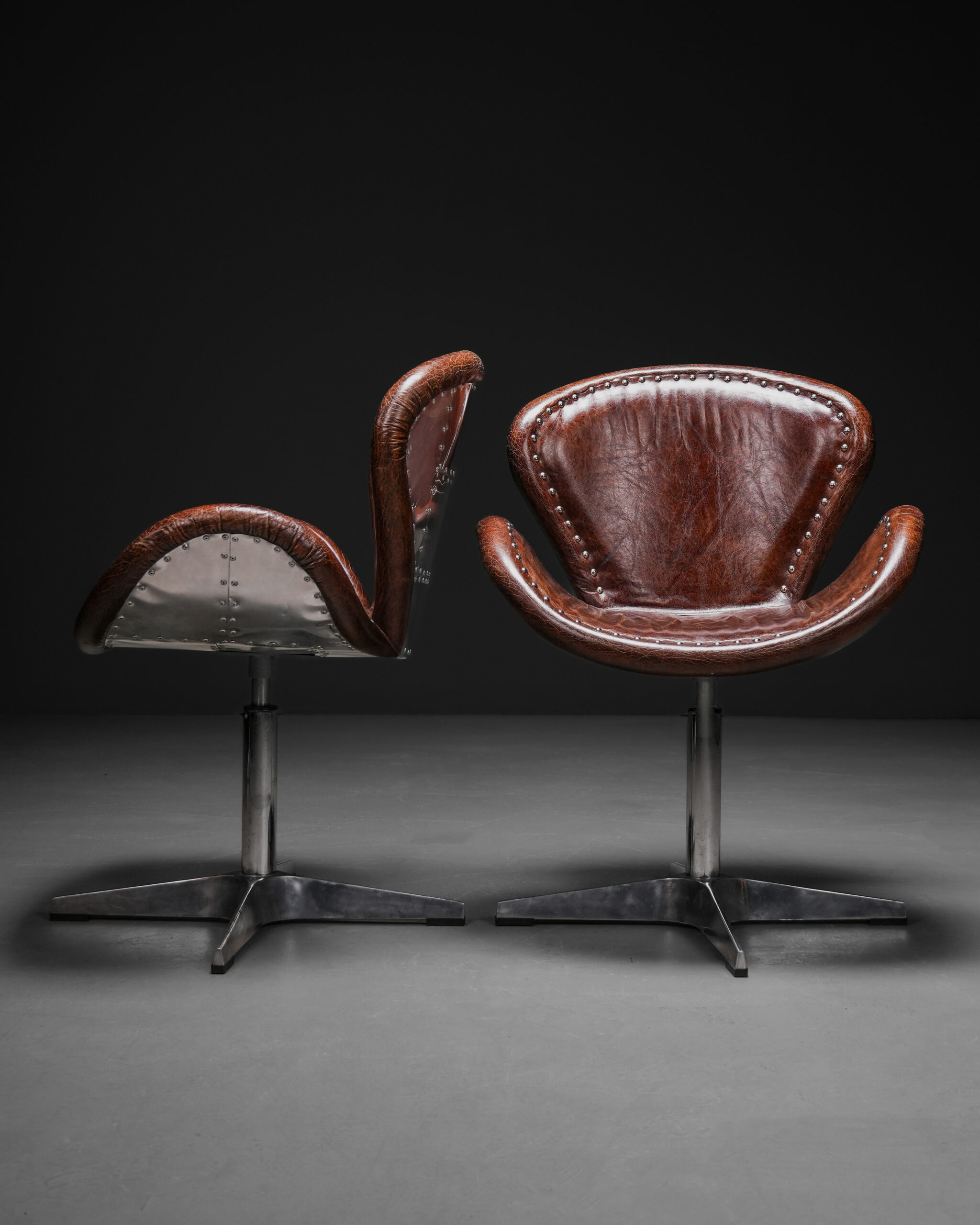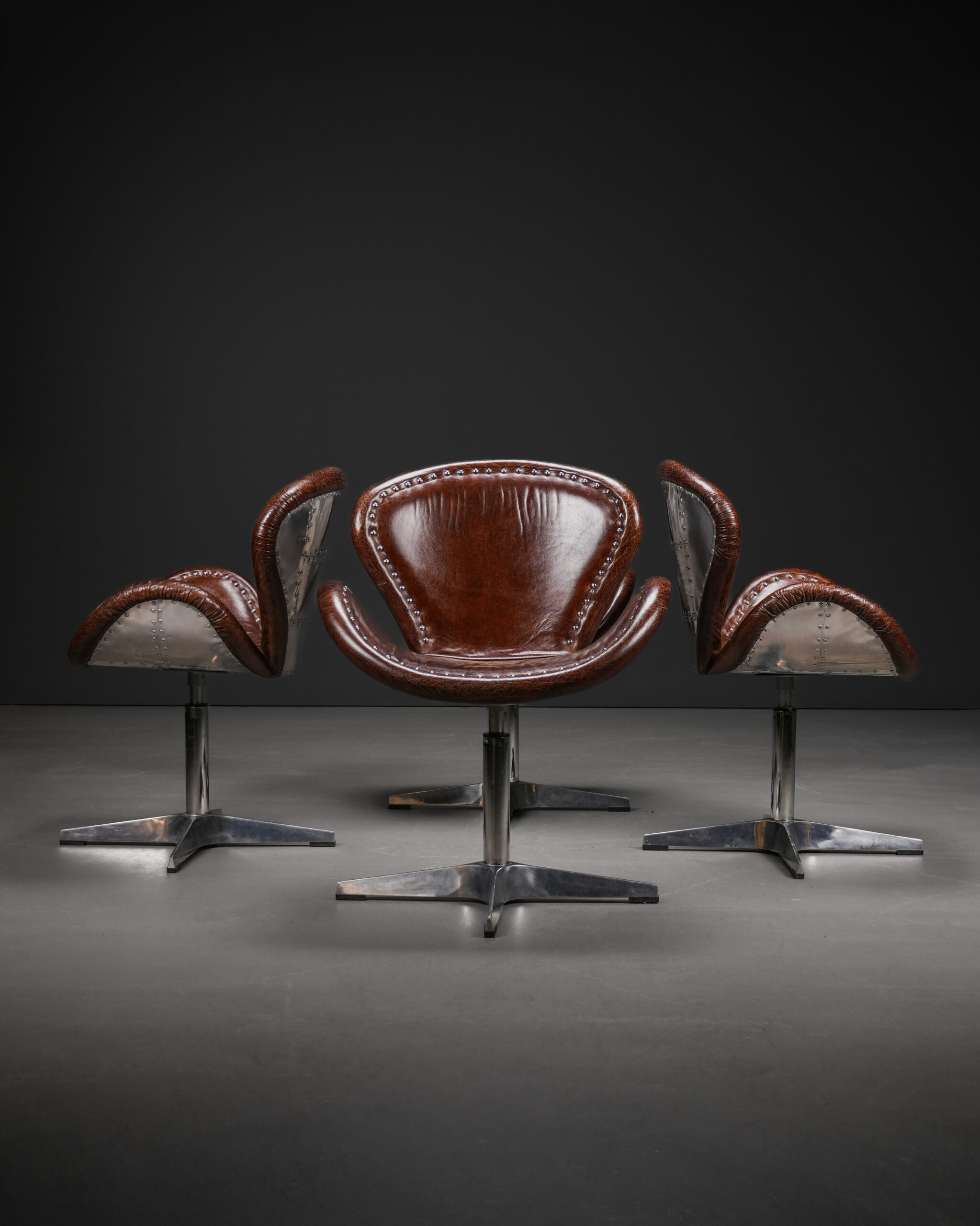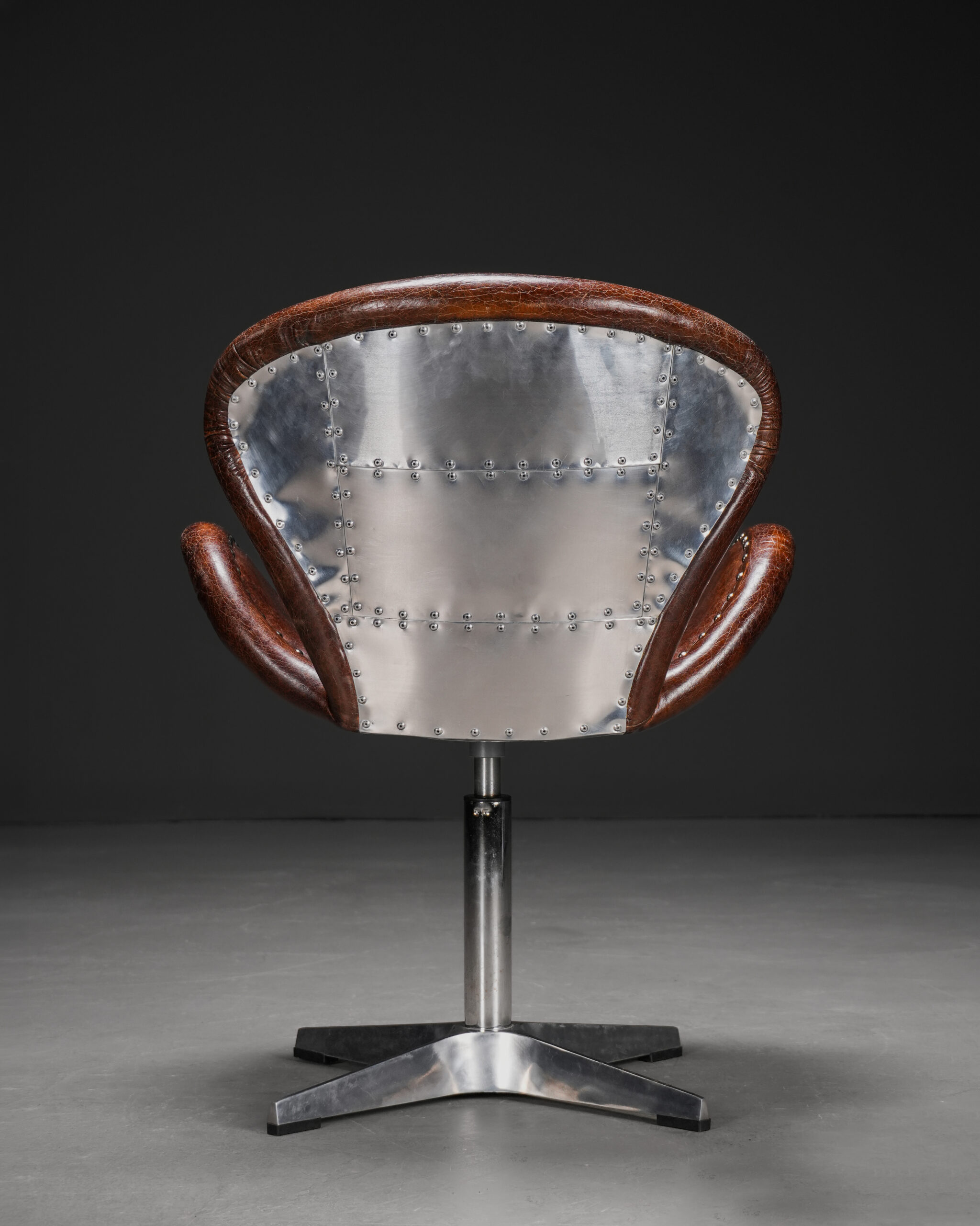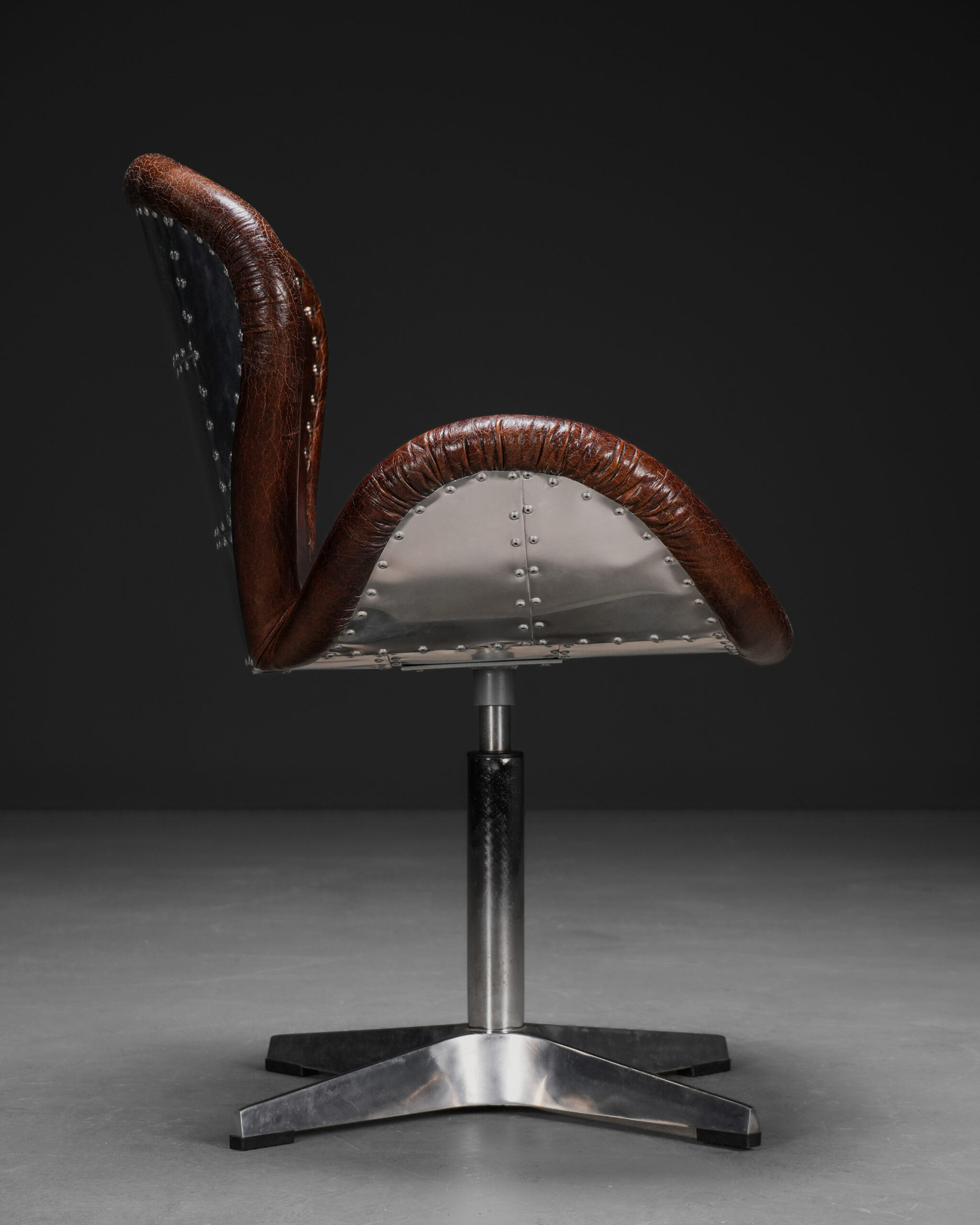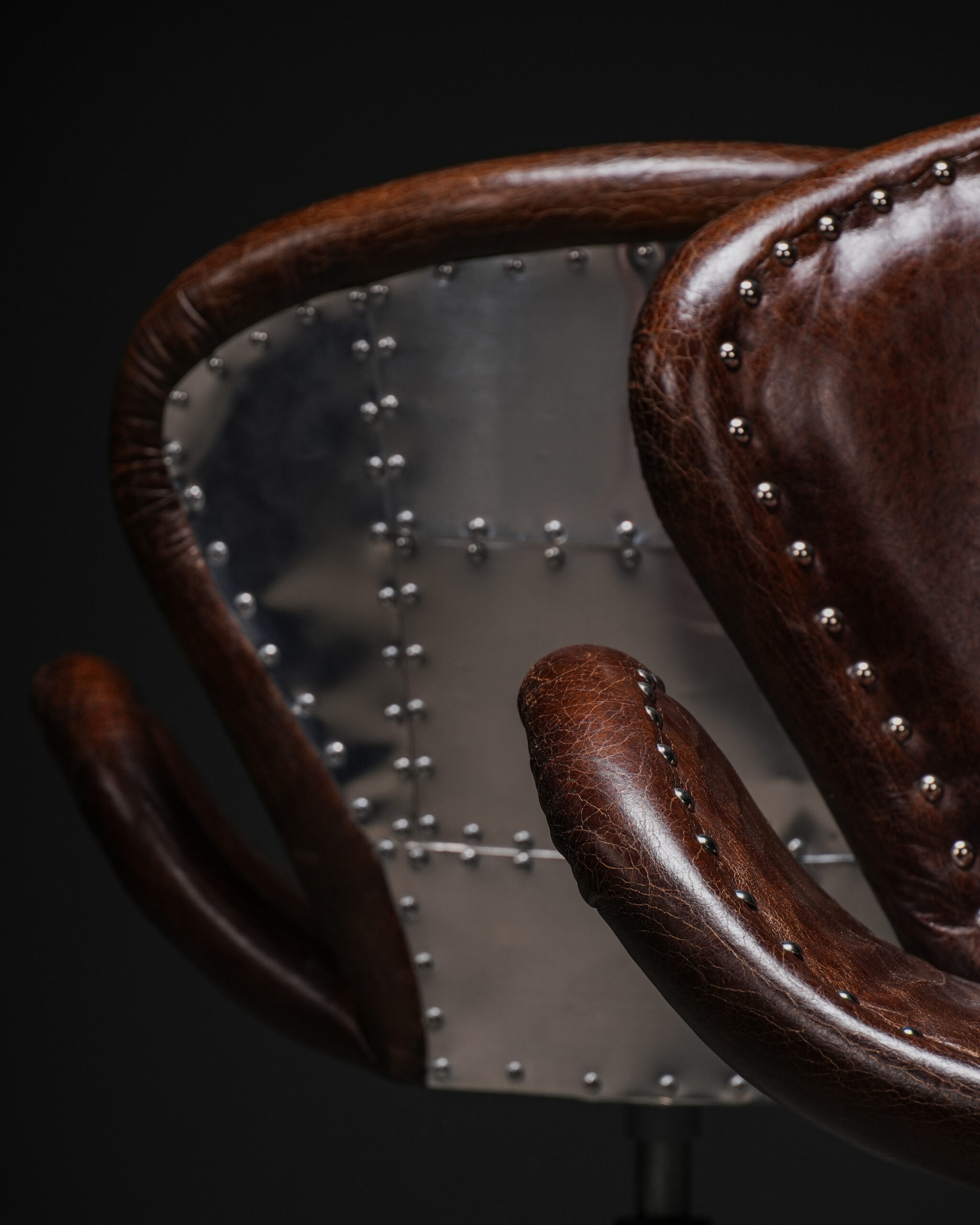 Aviator stili, 20. yüzyılın başlarında uçak gövdelerinde kullanılan alüminyum paneller ve görünür perçin detaylarından esinlenmiştir. Özellikle savaş uçaklarının gövde kaplamalarında görülen metal plakaların modüler yapısı, mobilya tasarımına taşınarak özgün bir kimlik oluşturmuştur. Bu sandalyede arka gövdede yer alan perçinli metal kaplama ve ön yüzde kullanılan eskitme tonlu deri, stilin karakteristik özelliklerini yansıtır.