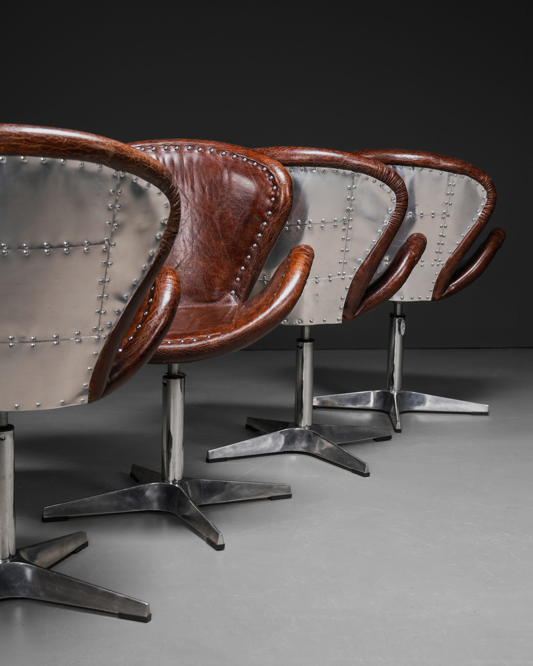Havacılık endüstrisinin endüstriyel estetiğinden ilham alan bu Aviator stil sandalyeler, metal perçin detayları ve deri döşemesiyle güçlü bir karakter sunar. Almanya üretimi olan bu model, modern loft ve endüstriyel dekorasyon anlayışını klasik konforla birleştirir.