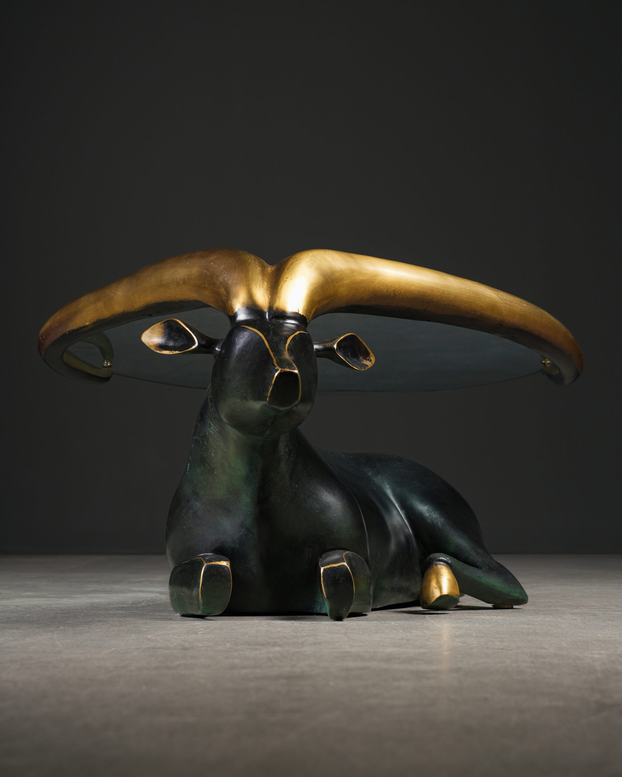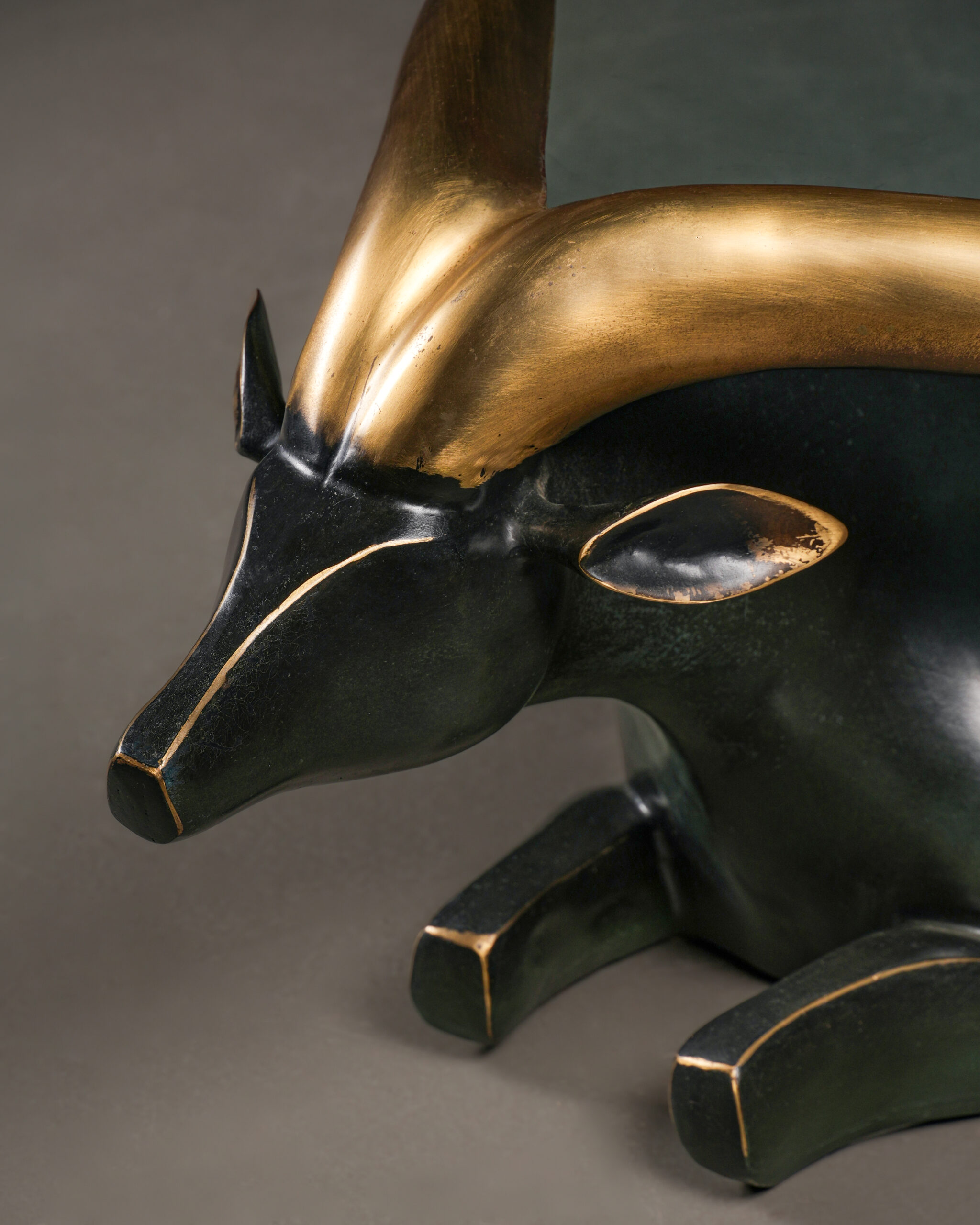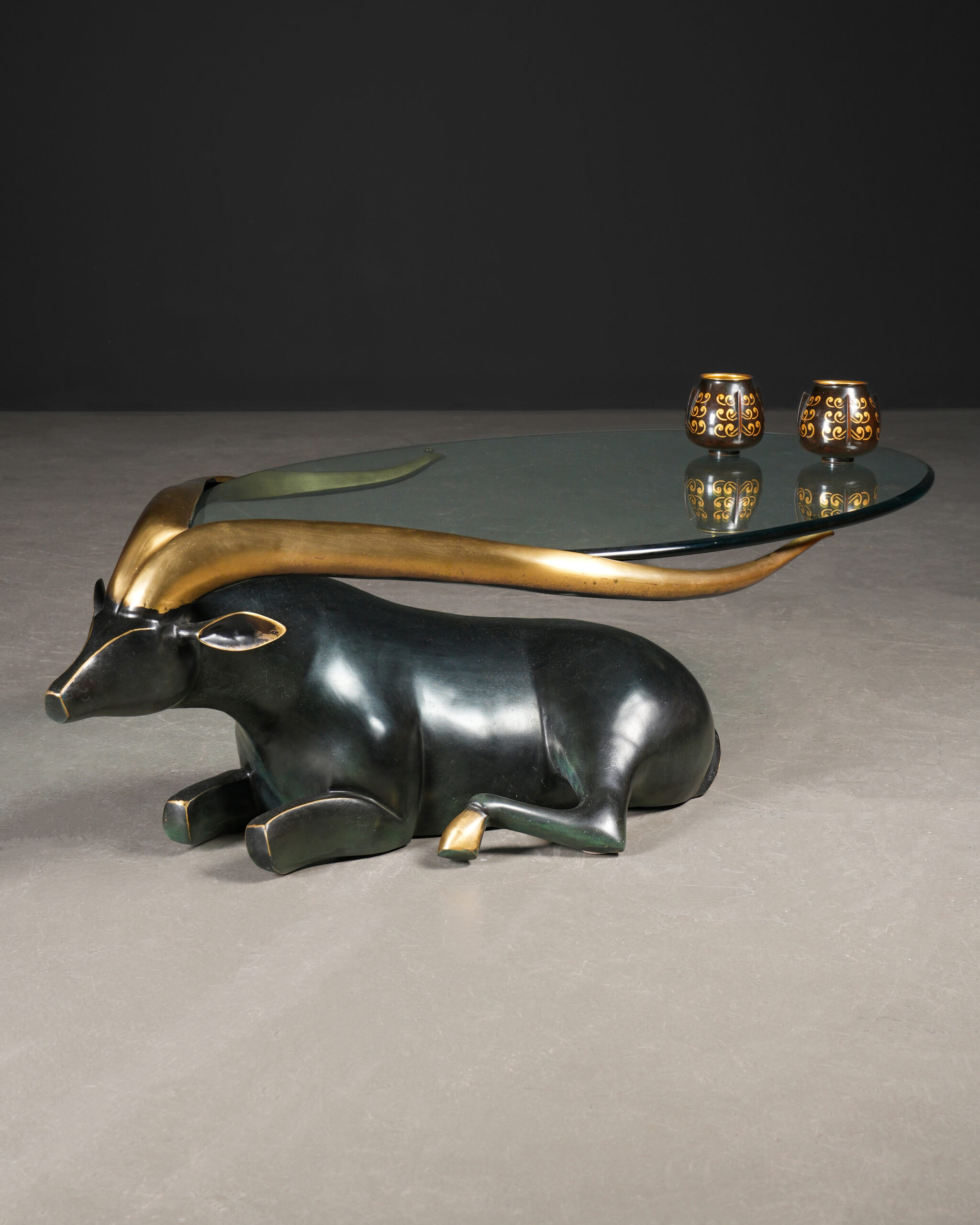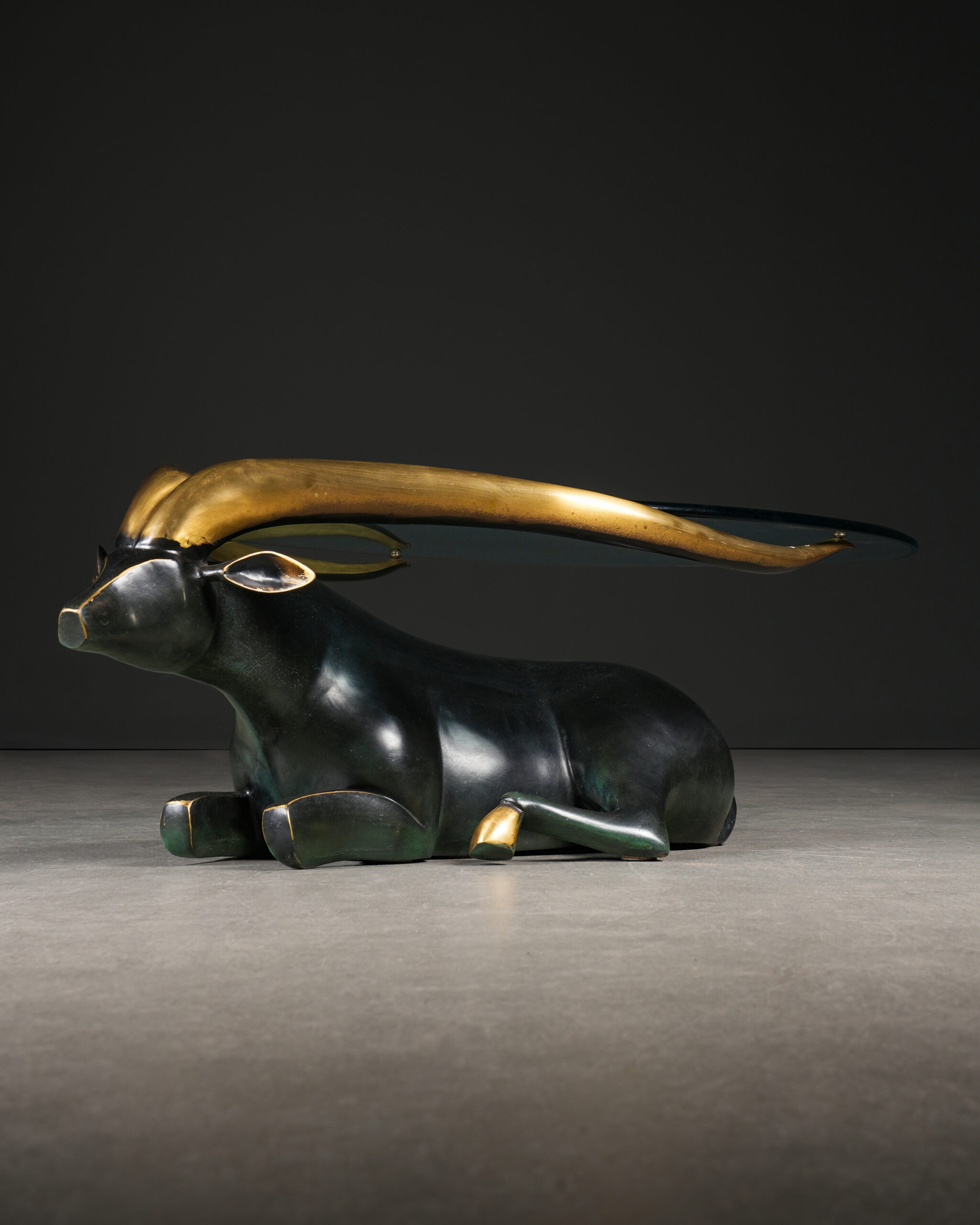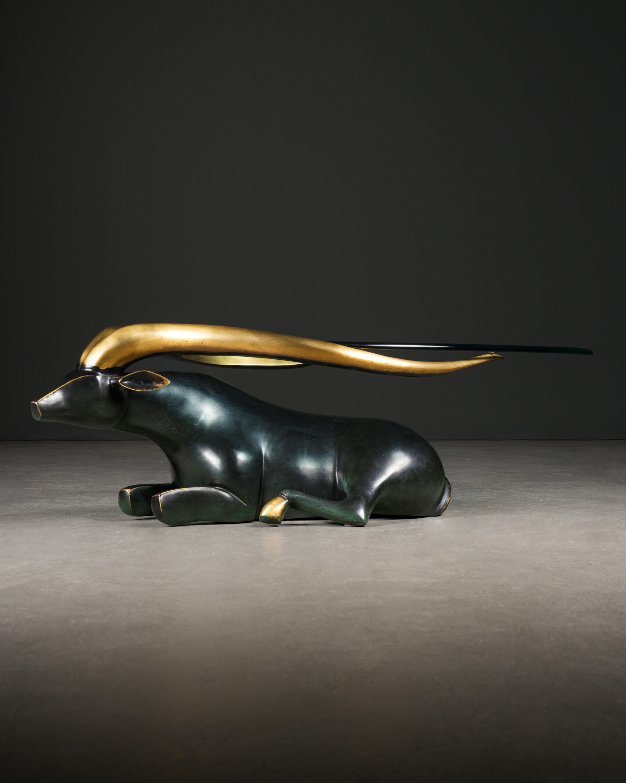 Siyah ve dore tonların kontrastıyla öne çıkan bu etkileyici sehpa, stilize edilmiş antilop formu ile hem dekoratif hem de işlevsel bir tasarım sunar. Gövde, koyu (siyah patinalı) bronzdan şekillendirilmiş olup, zarif ve akıcı hatlarıyla güçlü bir plastik etki yaratır.