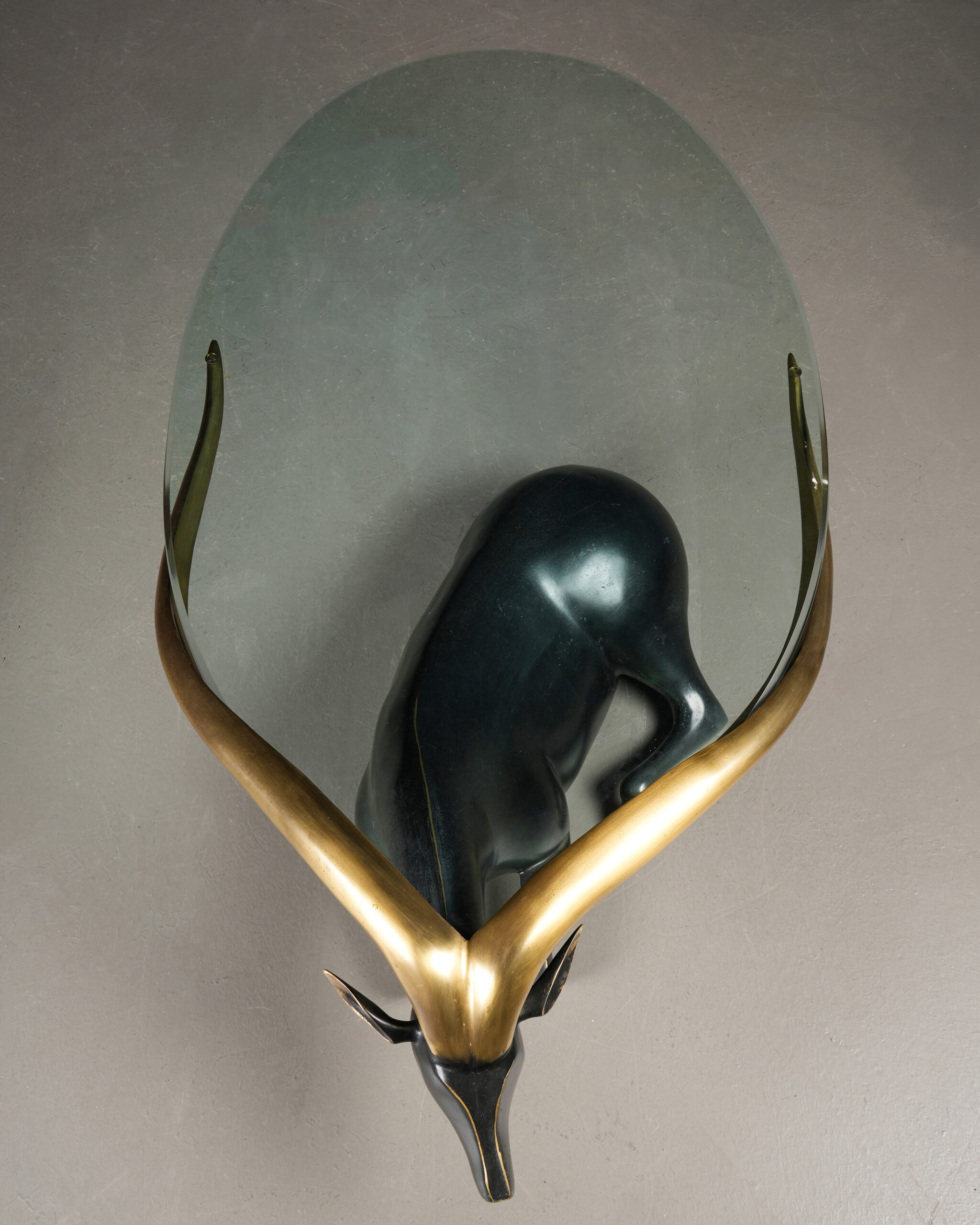 Antilopun sırtı üzerinden geriye doğru uzanan ve altın (dore) tonlarda vurgulanan uzun boynuzları, sehpanın en karakteristik unsurudur. Bu boynuzlar, üstte yer alan oval formdaki cam tablayı taşıyarak tasarımı tamamlar. Form ile fonksiyonun dengeli birleşimi, objeyi bulunduğu mekânda dikkat çekici bir merkez haline getirir.