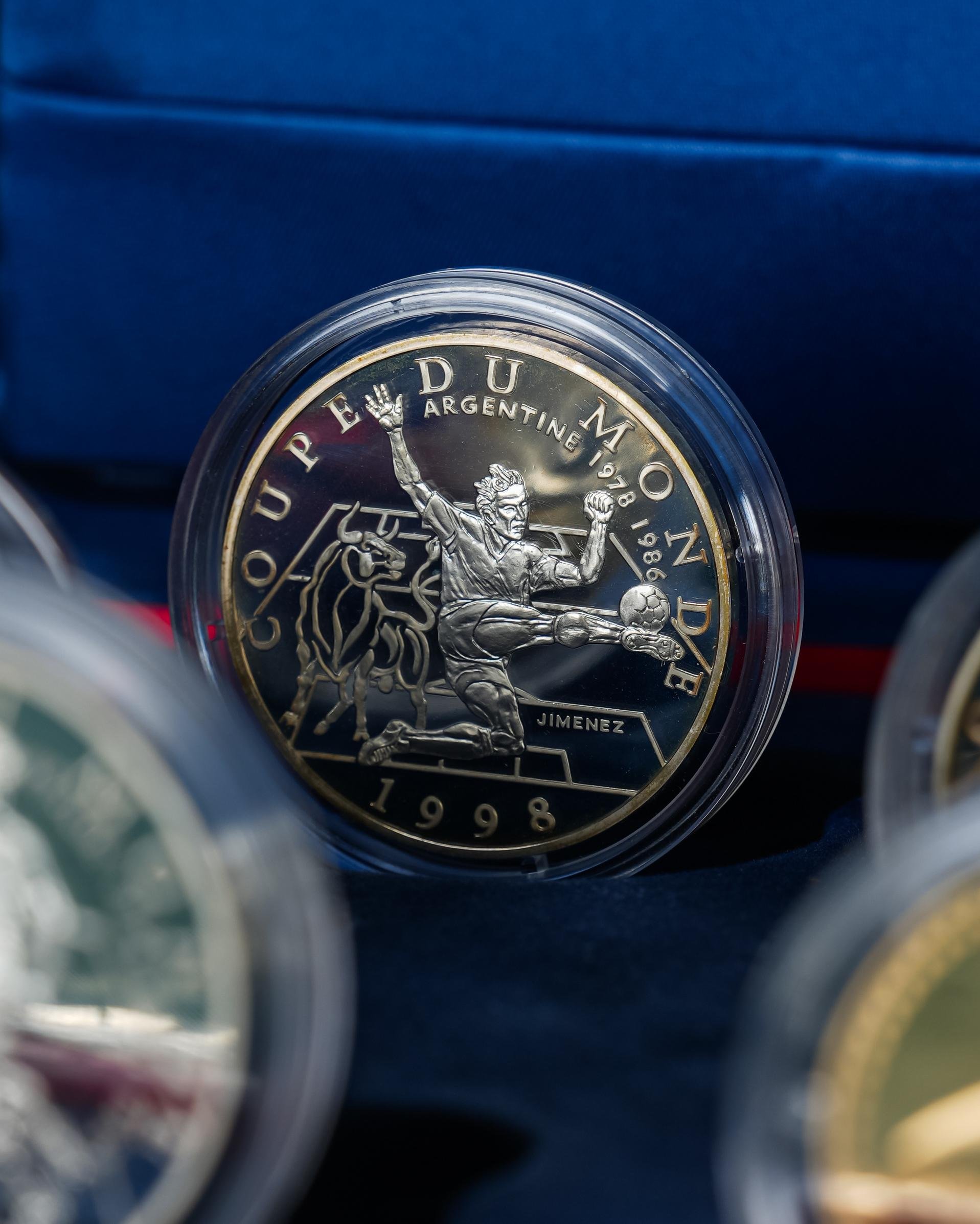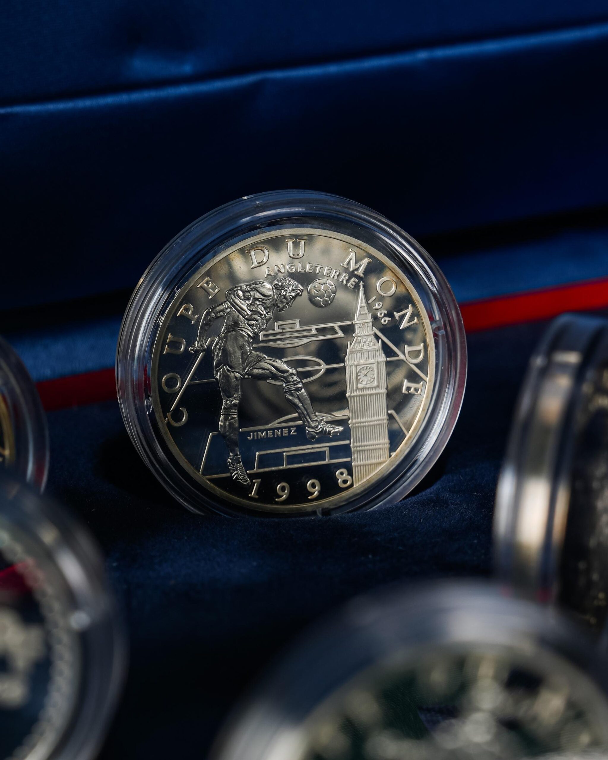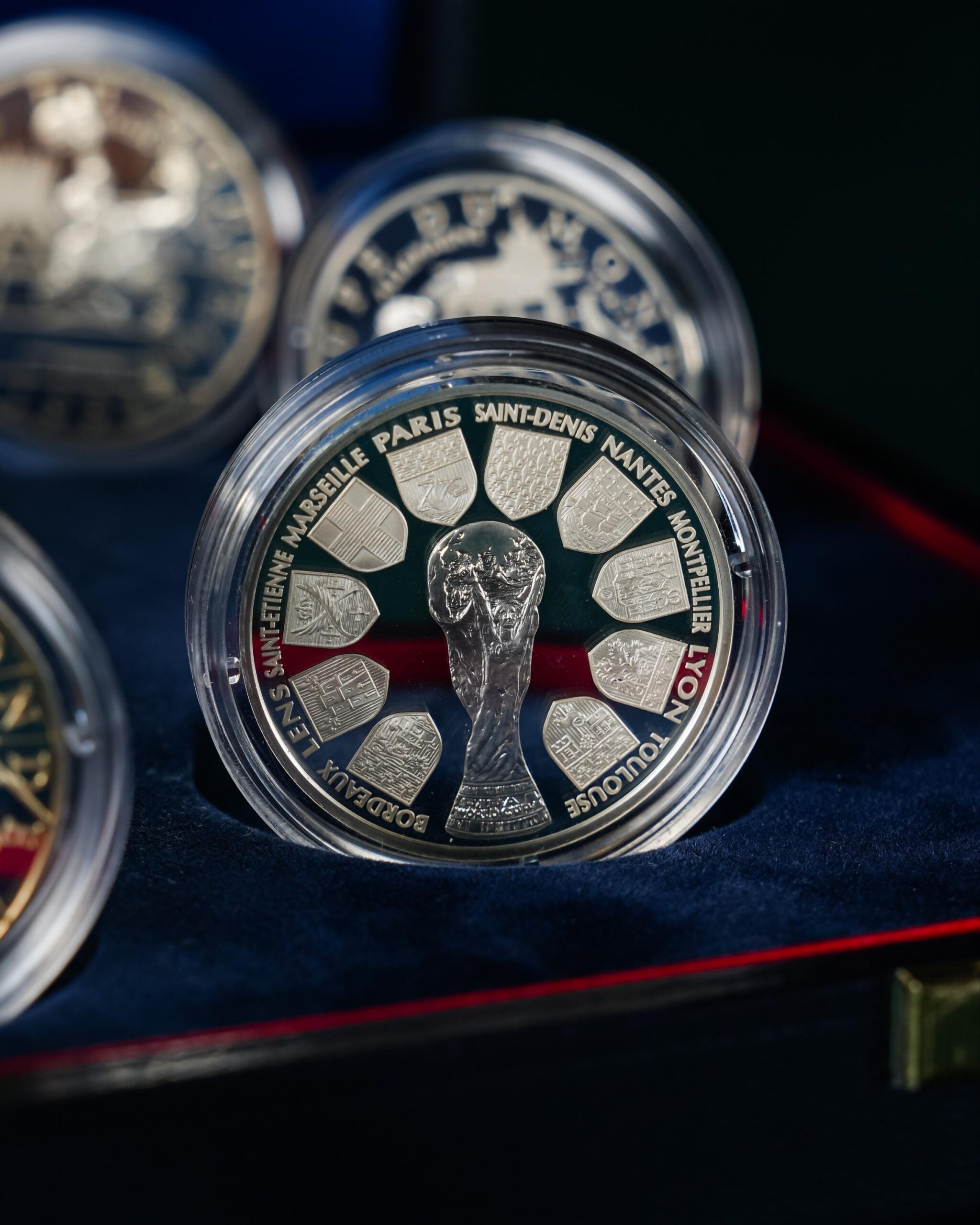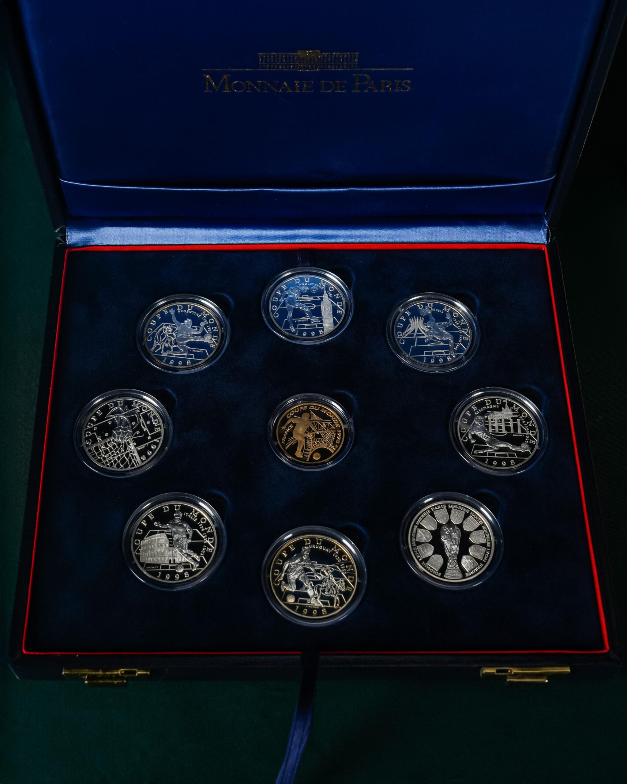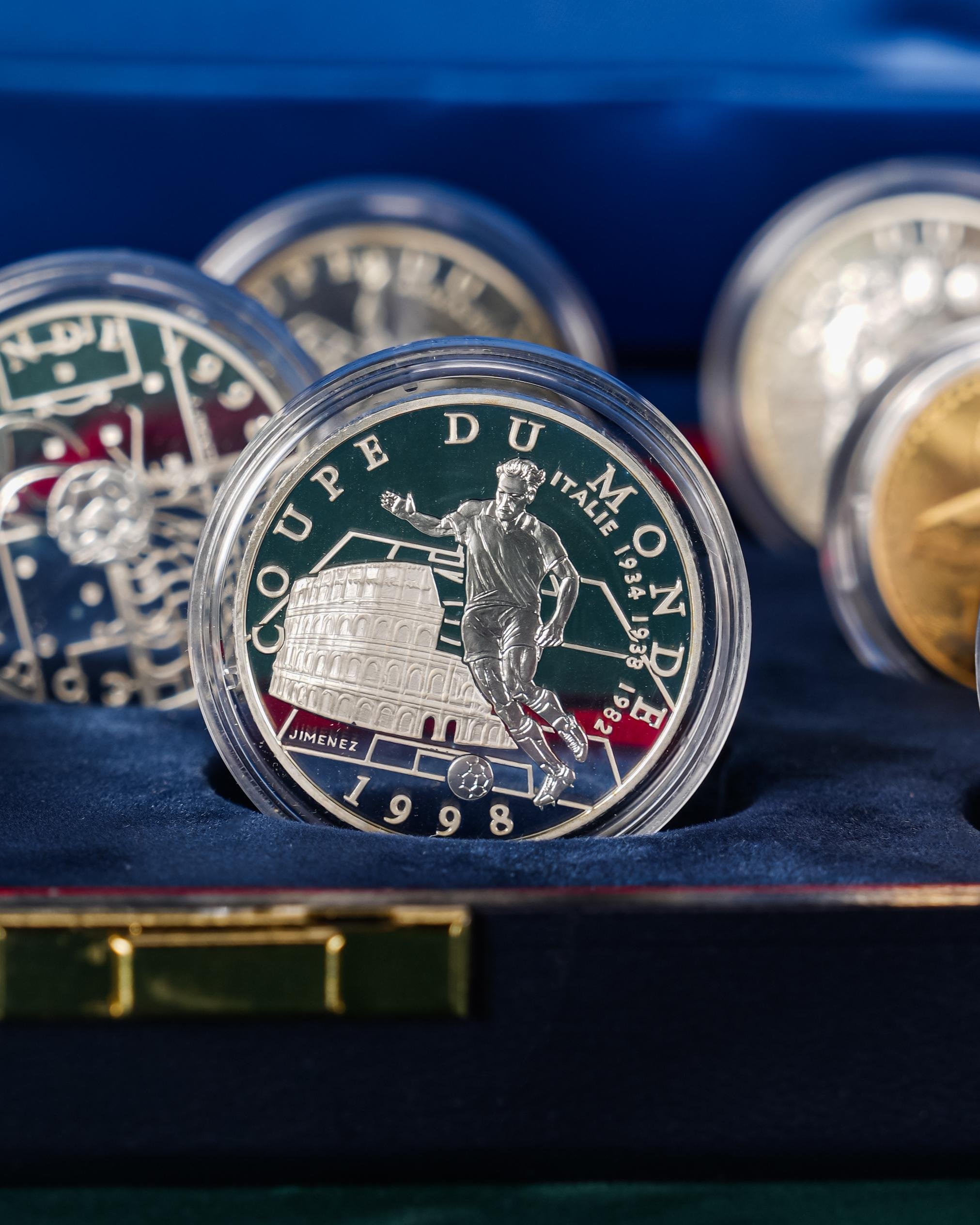 Fransa’da düzenlenen 1998 FIFA Dünya Kupası anısına hazırlanmış bu özel Belle Épreuve koleksiyon seti, her biri kapsülünde muhafaza edilen toplam dokuz adet gümüş hatıra paradan oluşur. Resmî nitelikte üretilmiş bu seri, hem nümismatik koleksiyoncuları hem de futbol tarihine ilgi duyanlar için özel bir hatıra niteliği taşır.