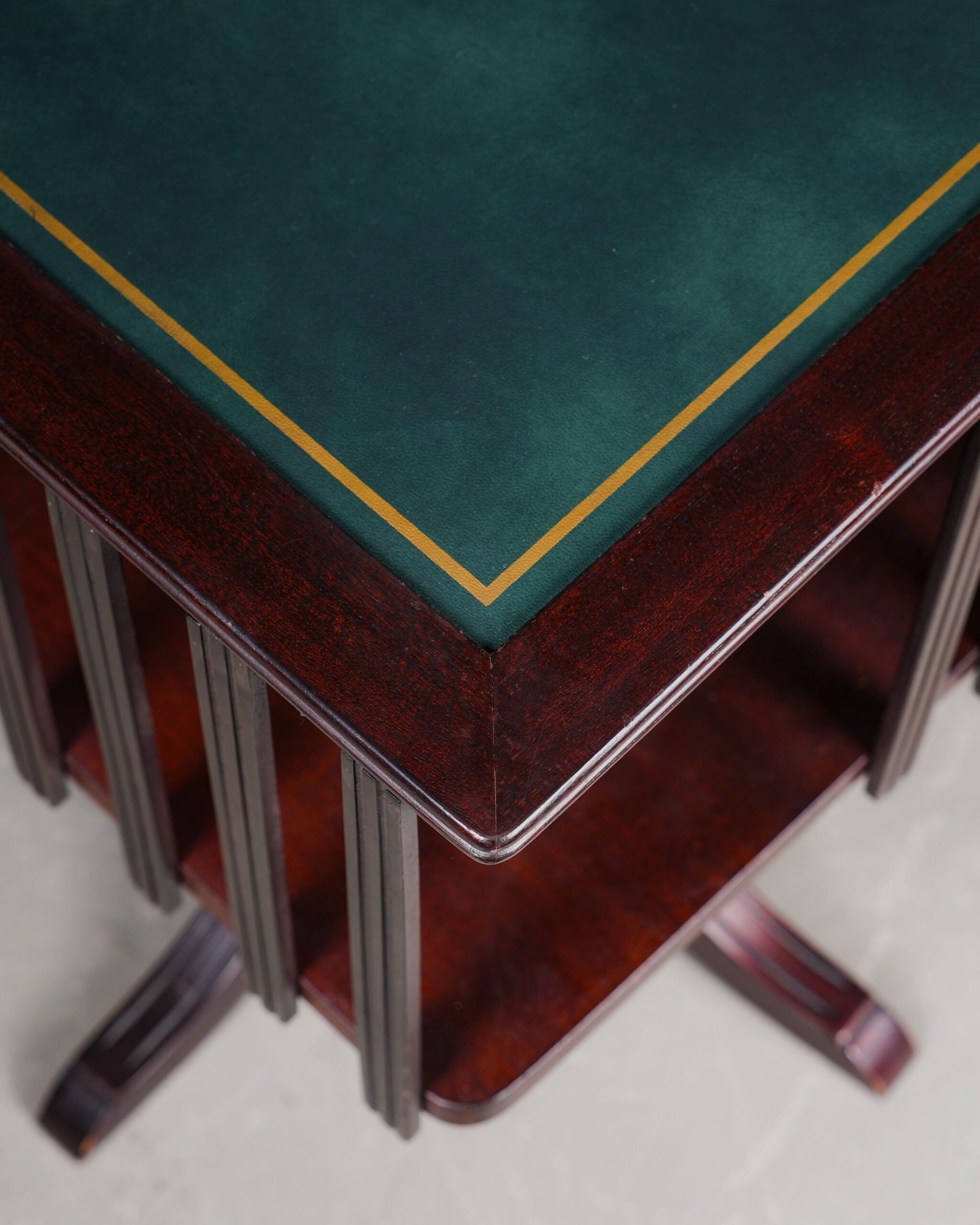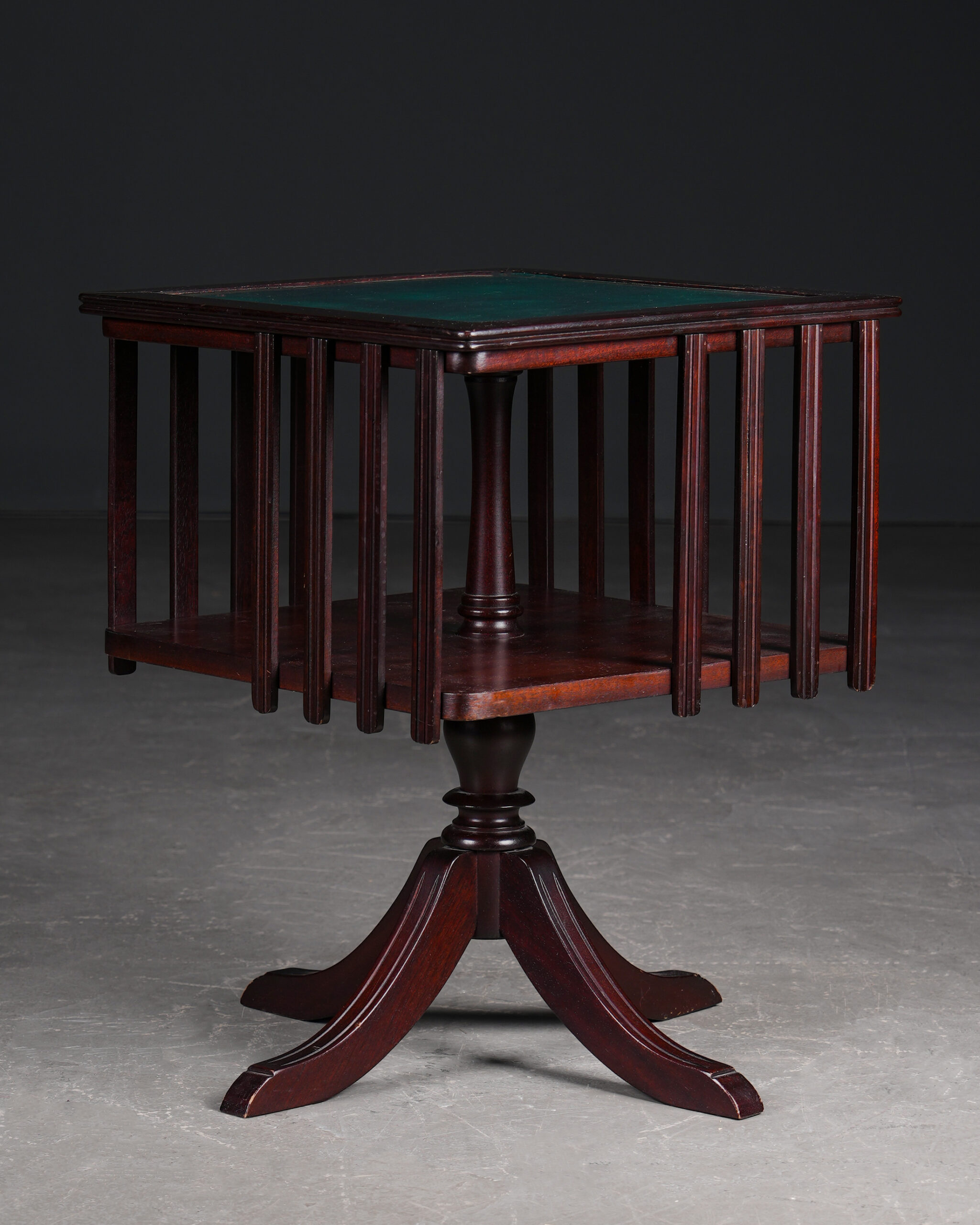 Maun ağacından üretilmiş bu zarif döner kitaplık, üst yüzeyindeki deri tabla ve dört yana açılan ayak formu ile erken 20. yüzyıl İngiliz mobilya anlayışının karakteristik bir örneğidir.
