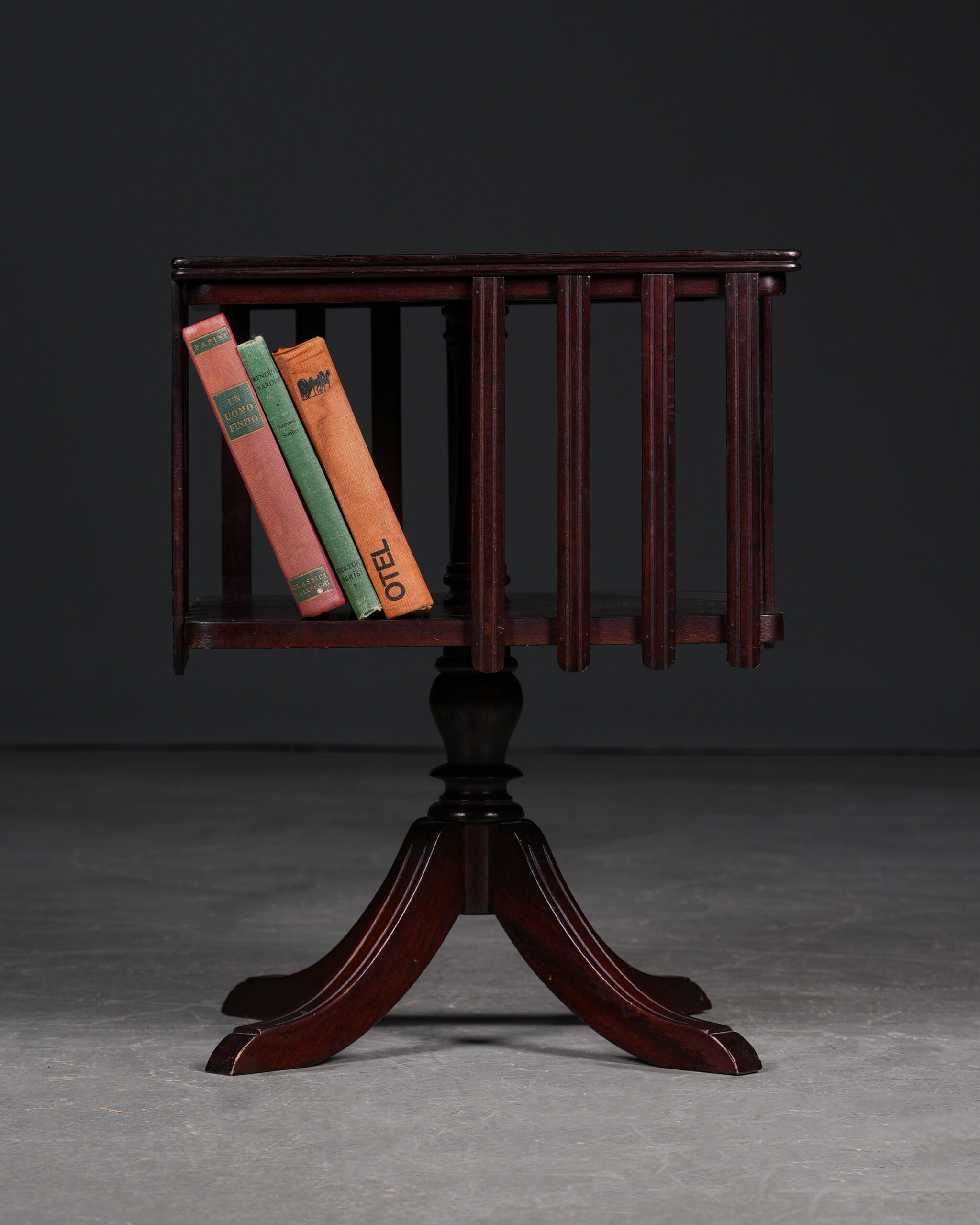 Okuma köşeleri, çalışma odaları ve klasik iç mekânlar için ideal, koleksiyon değeri taşıyan özgün bir İngiliz döner kitaplıktır.