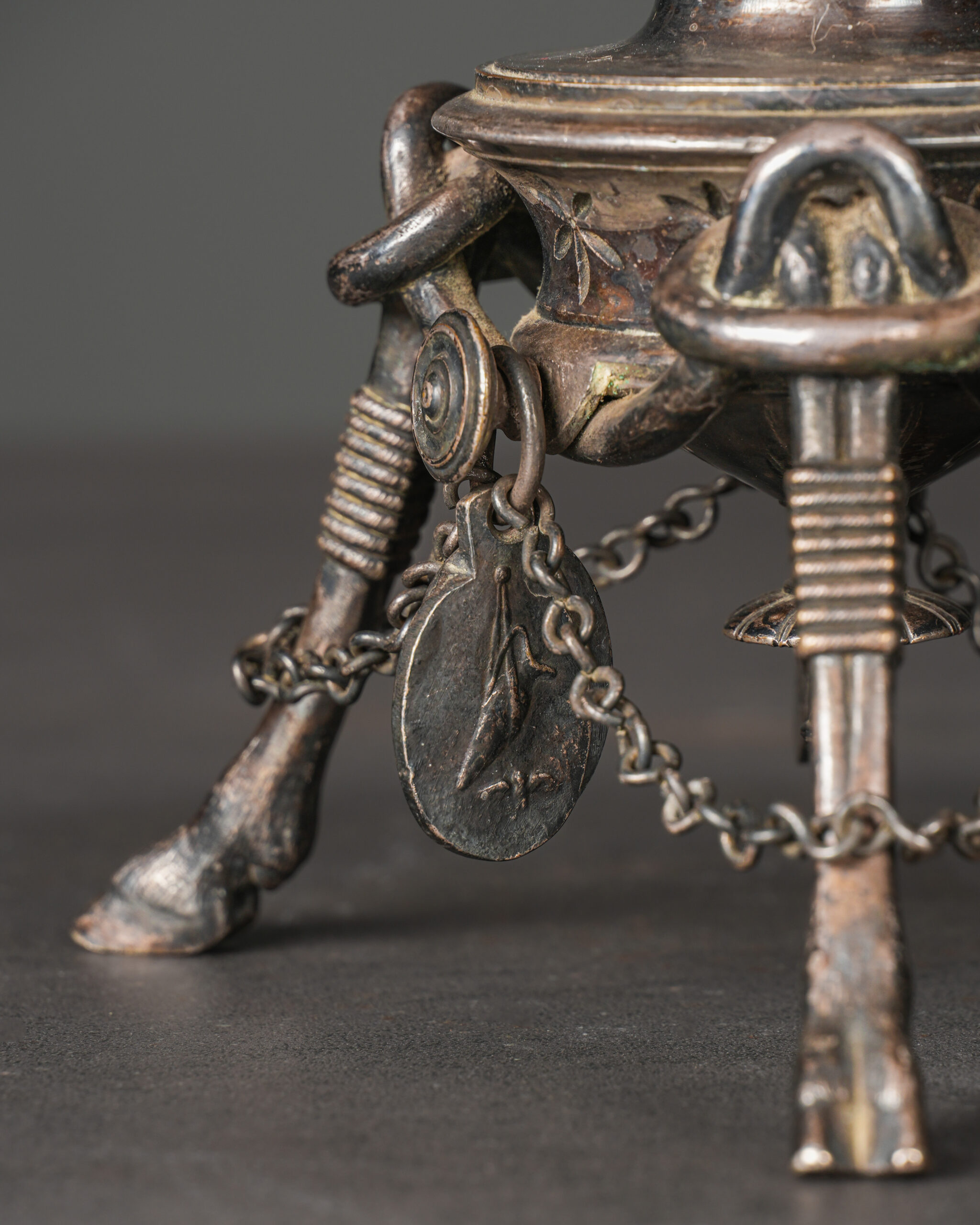 Objenin bordüründe yer alan Greek key (Meander) motifi, antik Yunan ve Roma sanatının karakteristik geometrik süslemelerinden biridir. Üç adet at ayağı formunda kaide üzerine oturan tabak, ayaklar arasında bulunan zincirli ve at motifli dekoratif medalyonlarla zenginleştirilmiştir. Tabağın dönebilen yapısı ve ağır pirinç dökümü, objeyi hem işlevsel bir servis tabağı hem de güçlü bir dekoratif merkez parçası haline getirir. Üzerinde yer alan “Et Roma Fvit” ibaresi Latince olup “Roma da vardı / Roma’dan doğdu” anlamına gelen klasik bir ifadeyle Roma’nın kökenine ve mitolojik kuruluşuna gönderme yapar.