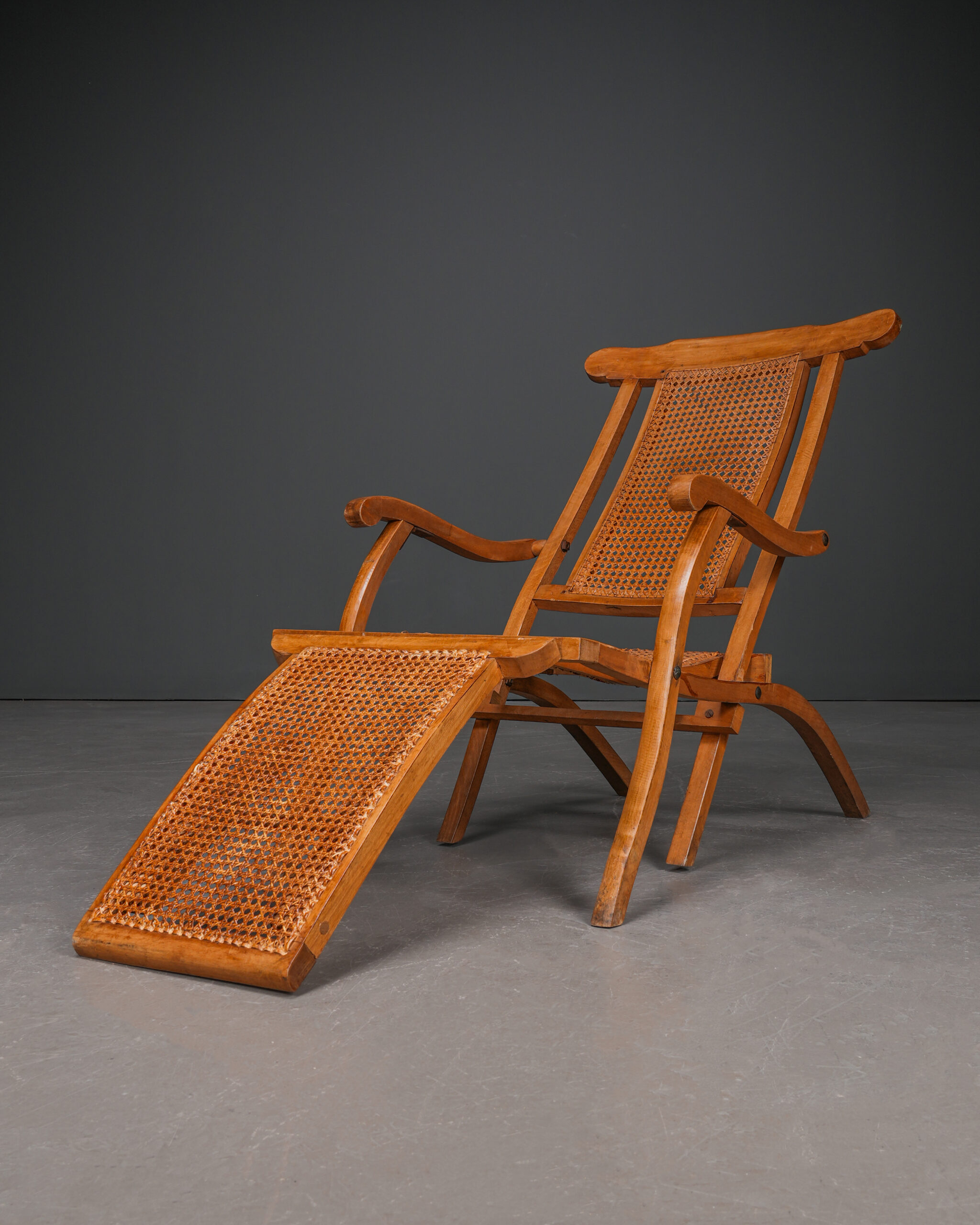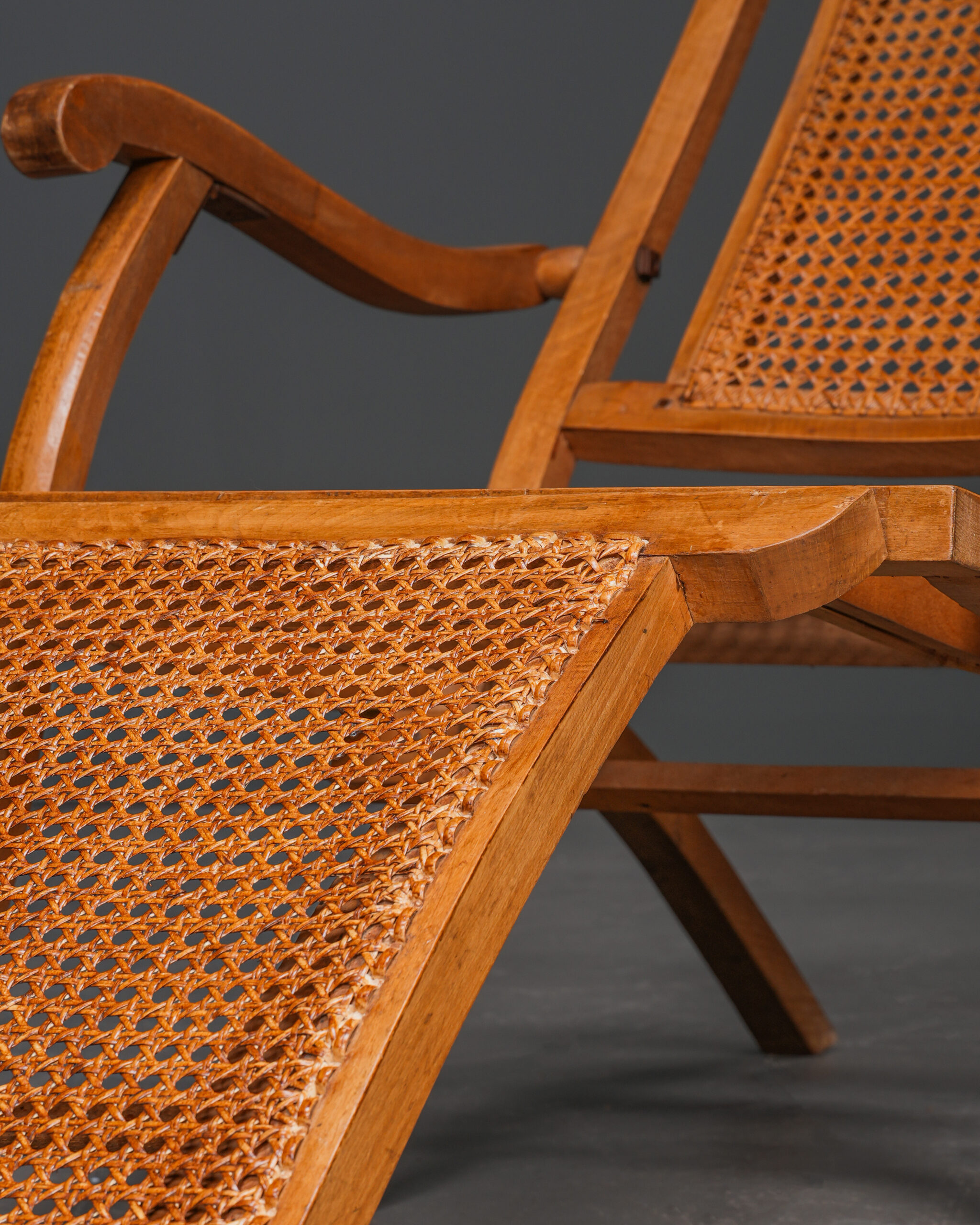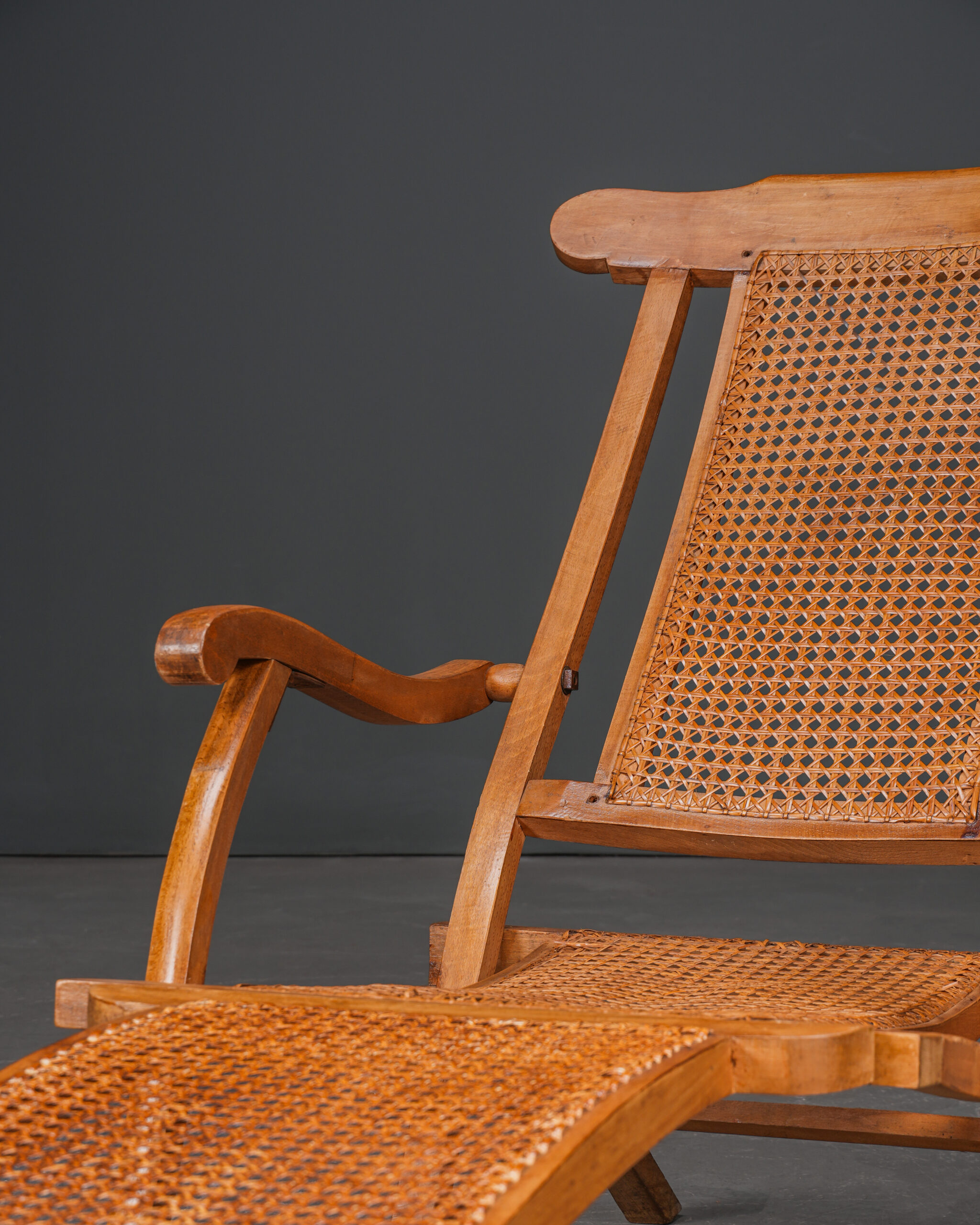Fransız yolcu gemilerinde güvertelerde kullanılmış, katlanabilen, hazeranlı, kayın ağacı antika şezlonglar.