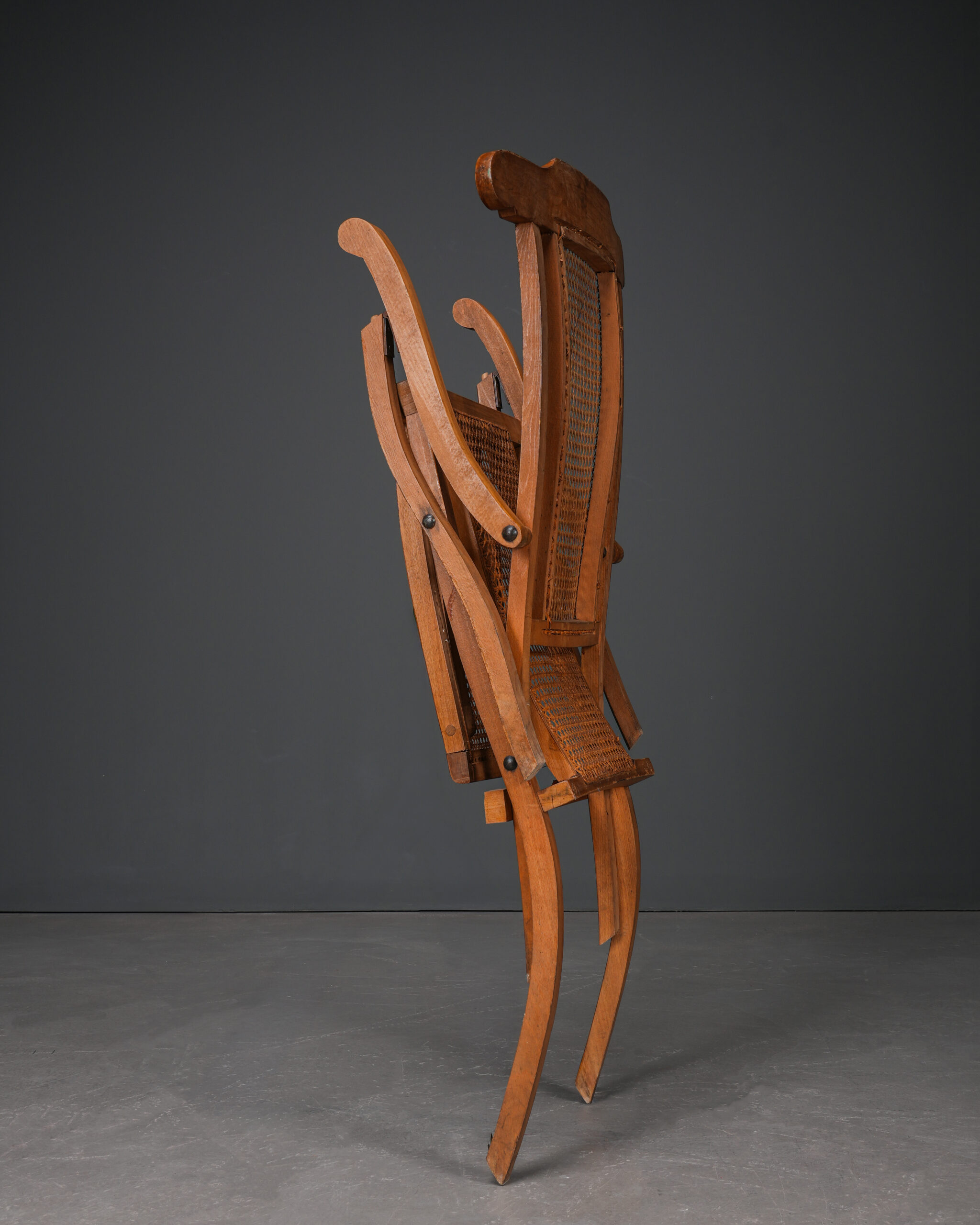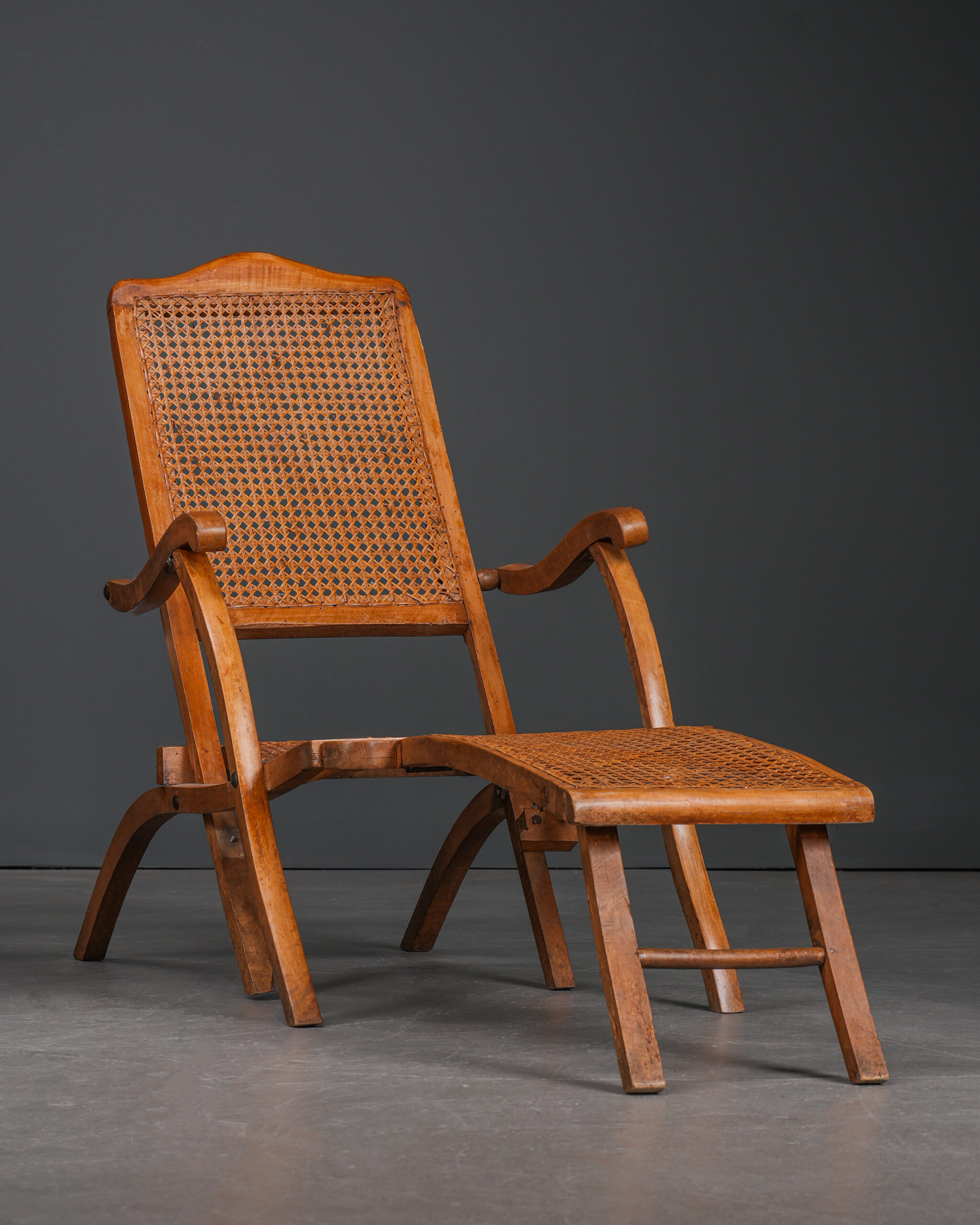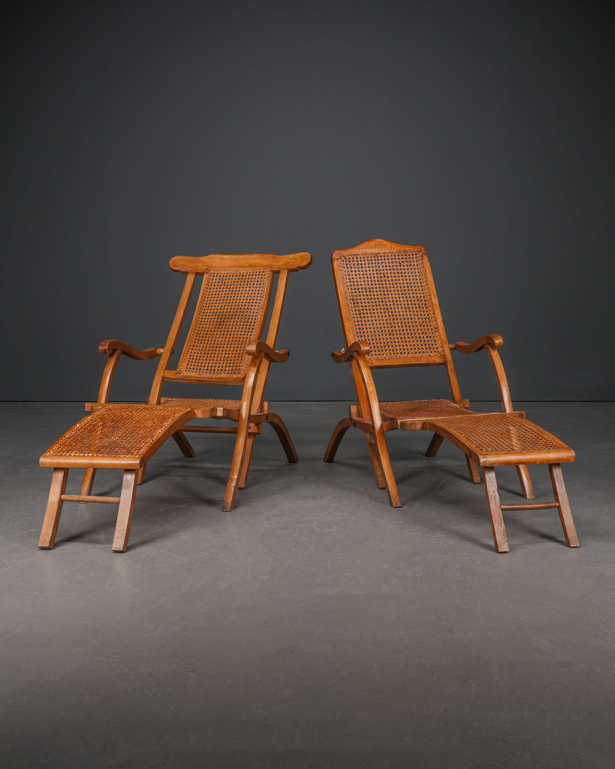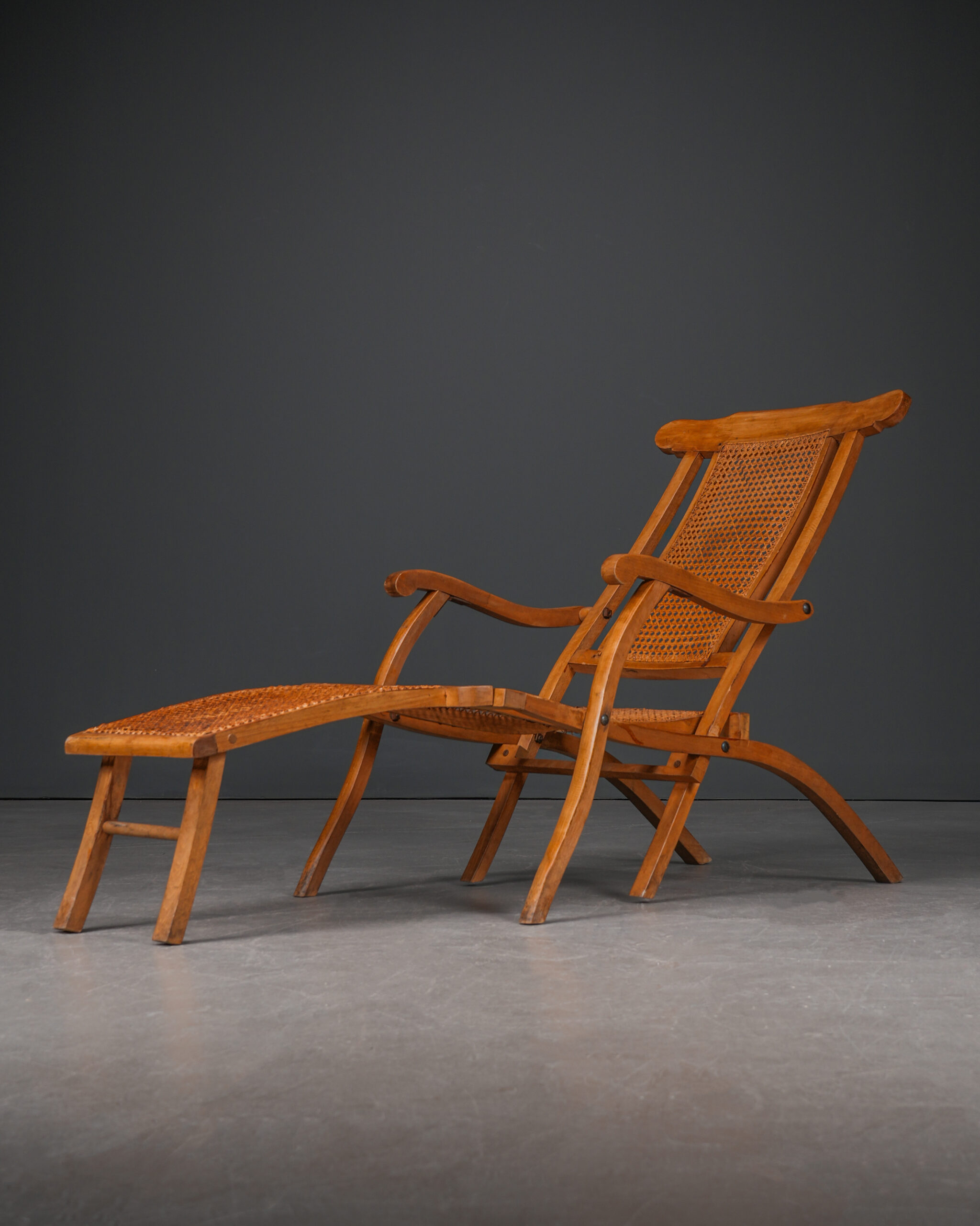 Fransız yolcu gemilerinde güvertelerde kullanılmış, katlanabilen, hazeranlı, kayın ağacı antika şezlonglar.
