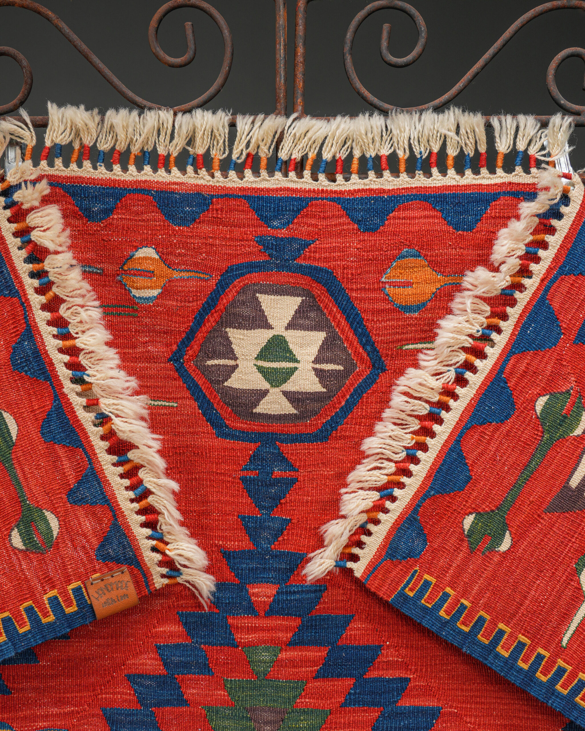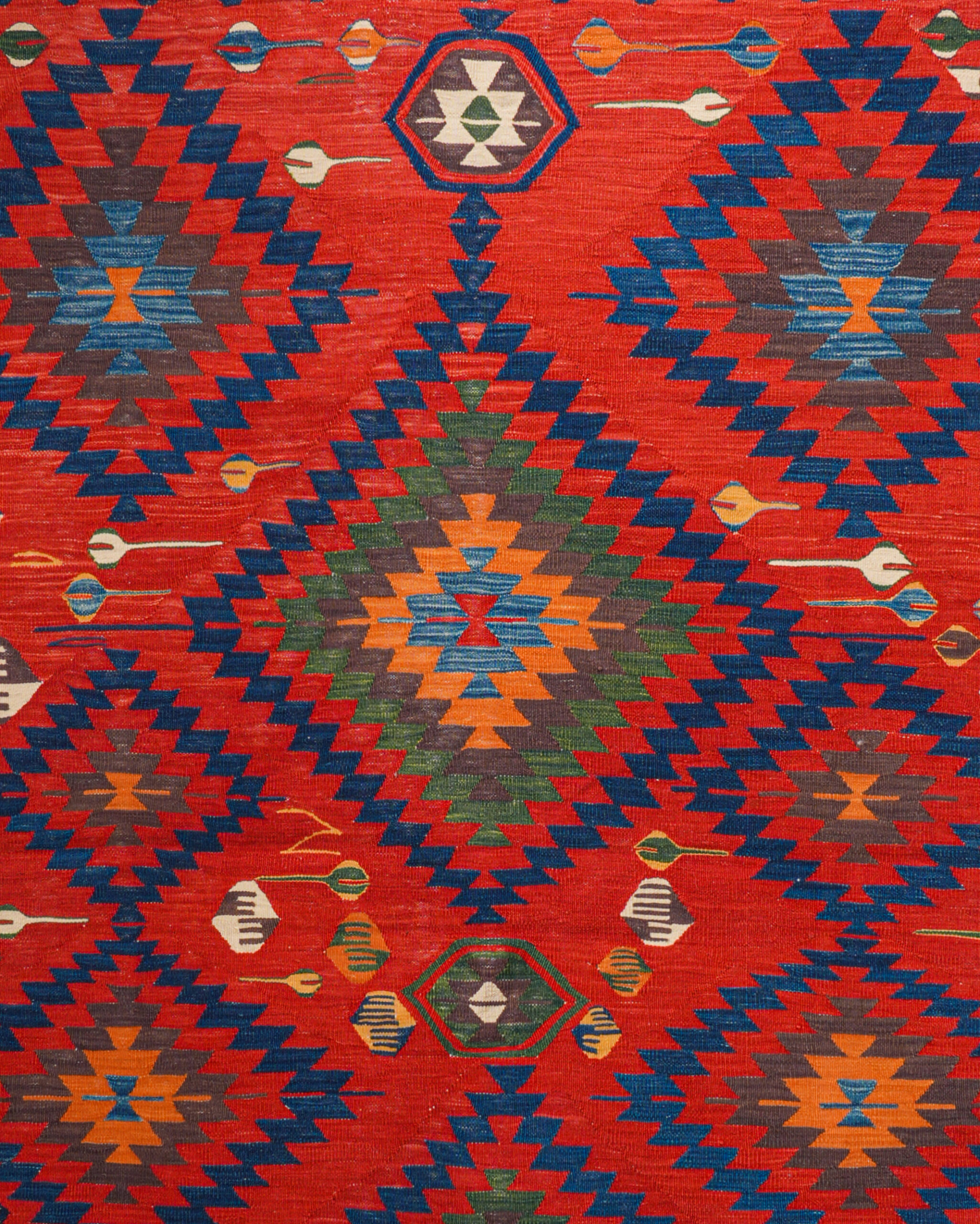Tamamen yün ipliklerle dokunmuş ve kök boyalarla renklendirilmiş olan bu kilim, doğal malzeme ve geleneksel tekniklerin uyumunu sergiler. El dokuması olması sayesinde her bir motifte küçük farklılıklar görülür; bu da parçaya özgünlük kazandırır. Salon, antre veya çalışma alanlarında güçlü bir odak noktası oluşturabilecek bu kilim, aynı zamanda koleksiyonluk Anadolu tekstil örnekleri arasında yer alır.