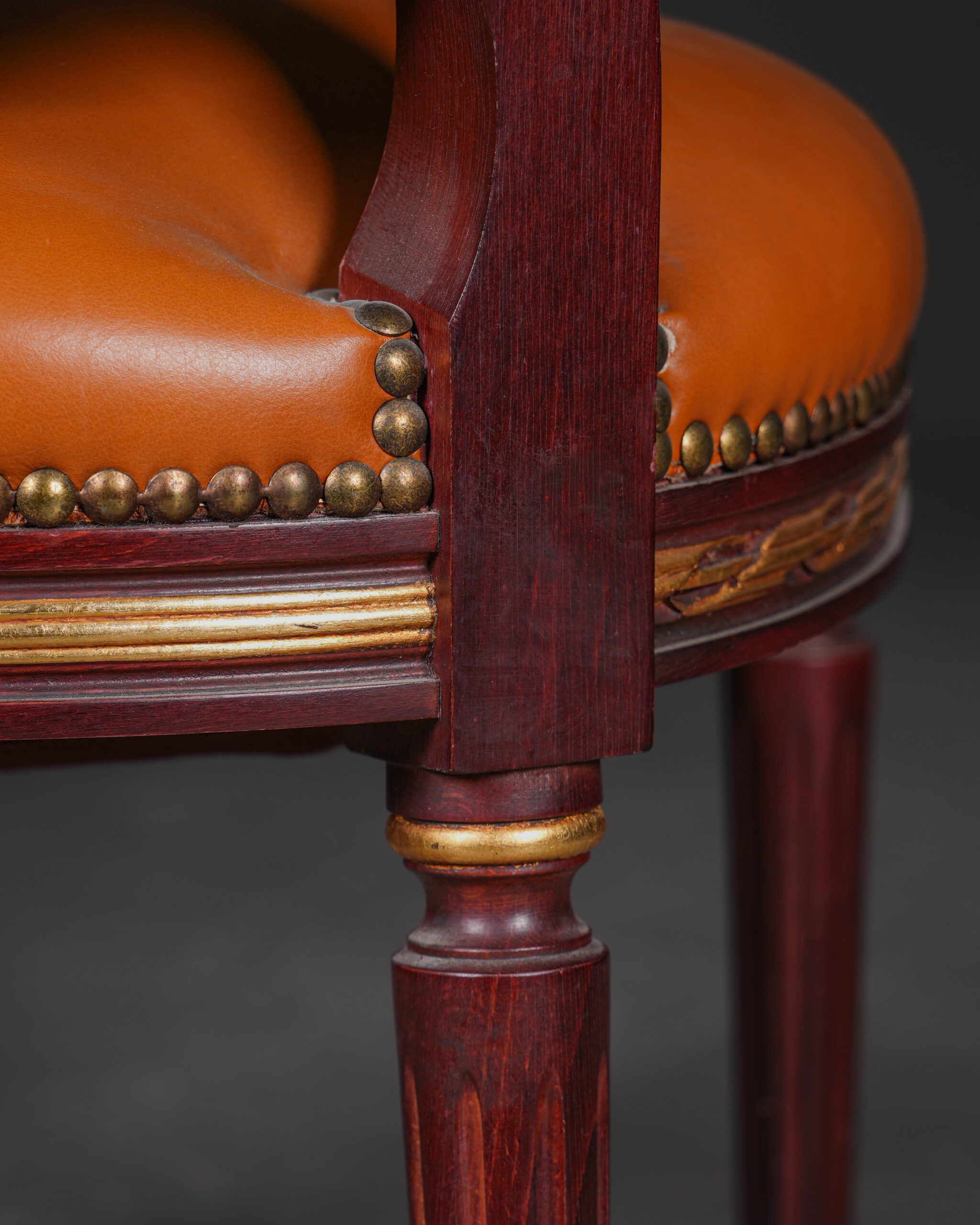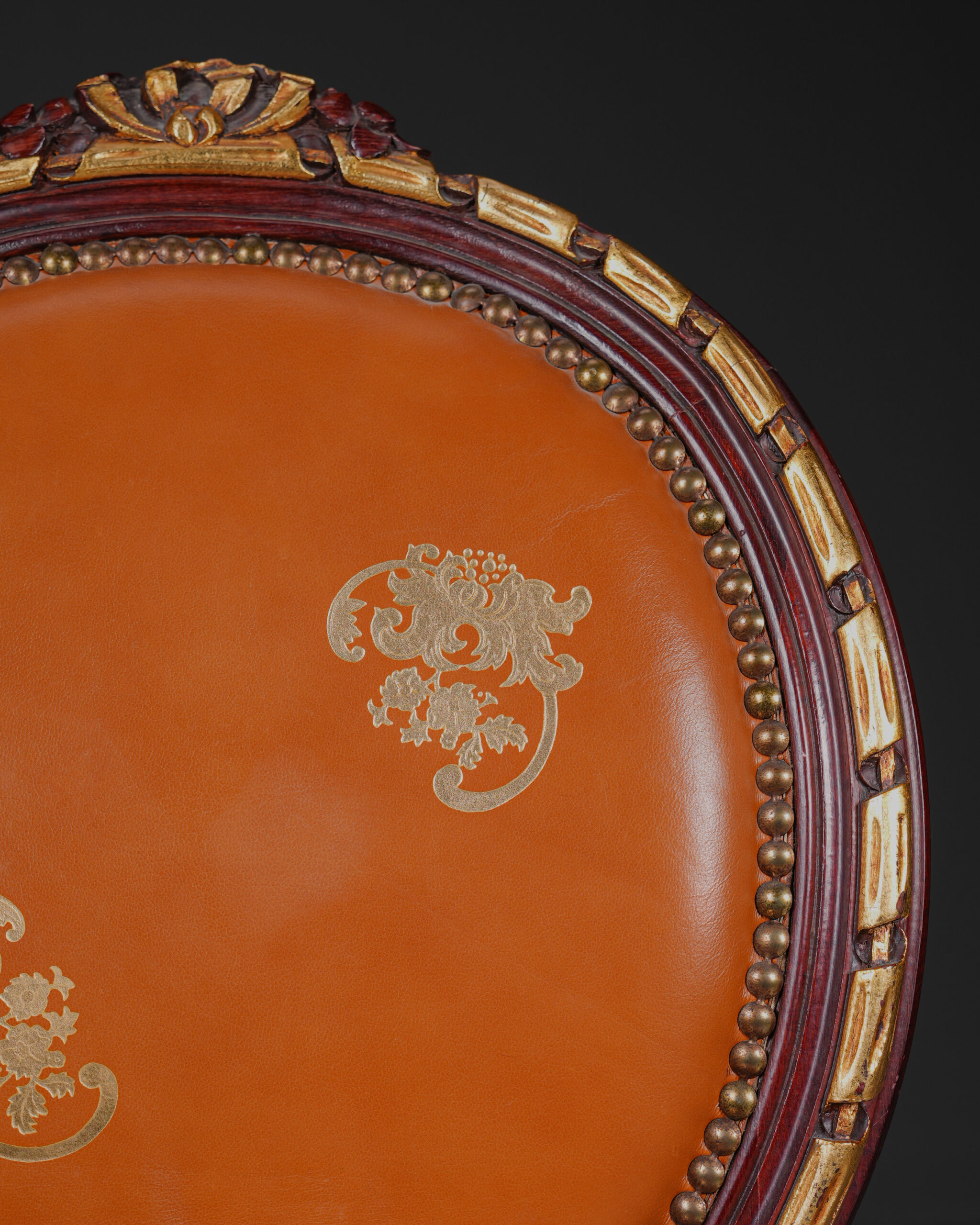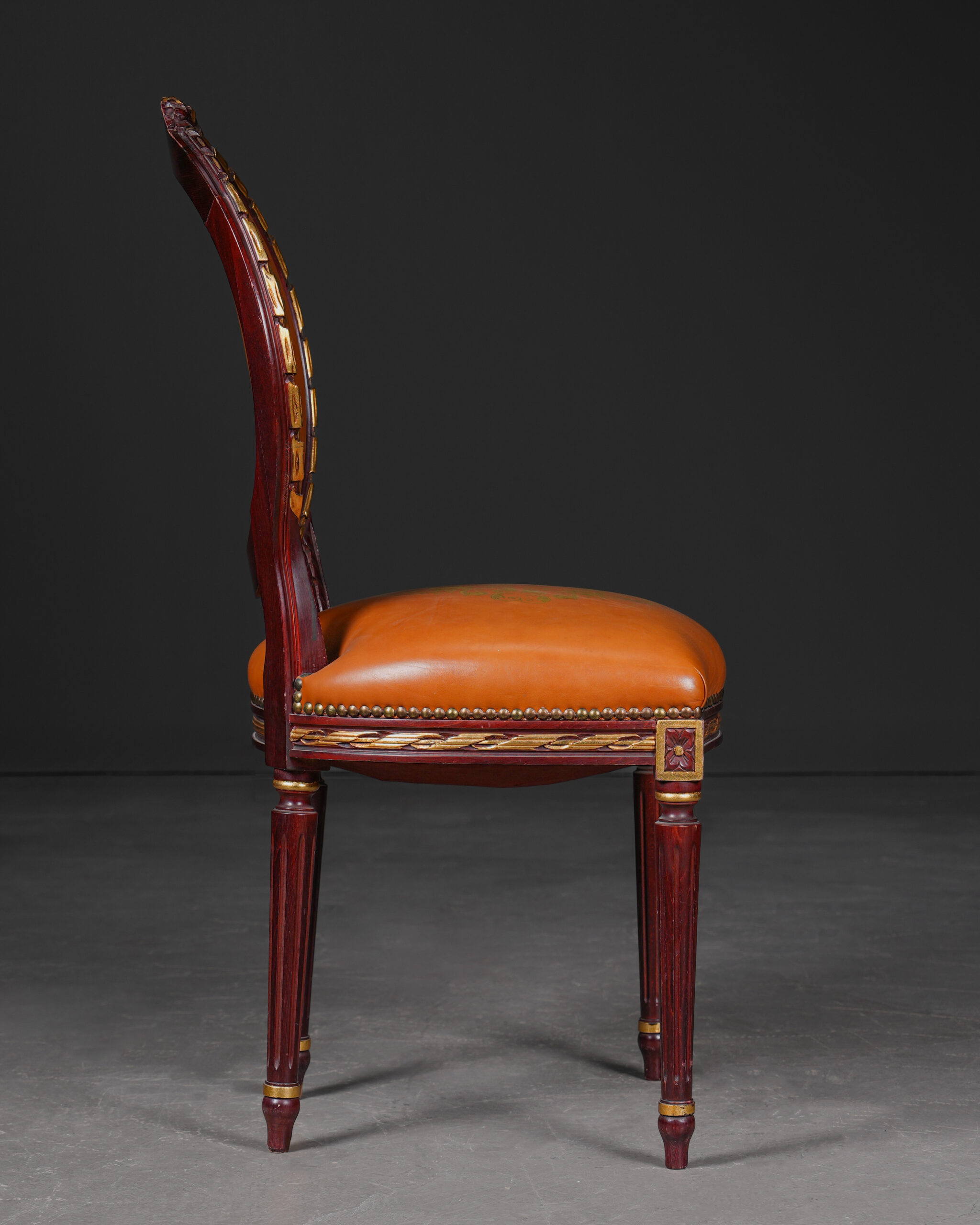 Zarif formu ve ince işçilik detaylarıyla öne çıkan bu Louis XVI stilinde sandalye, klasik Fransız mobilya geleneğinin dengeli ve simetrik estetiğini yansıtır. Oval formdaki sırtlık yapısı, dönemin karakteristik tasarım anlayışını ortaya koyarken çevresini saran dekoratif çerçeve ve çivili döşeme detayı sandalyeye zarif bir vurgu kazandırır.