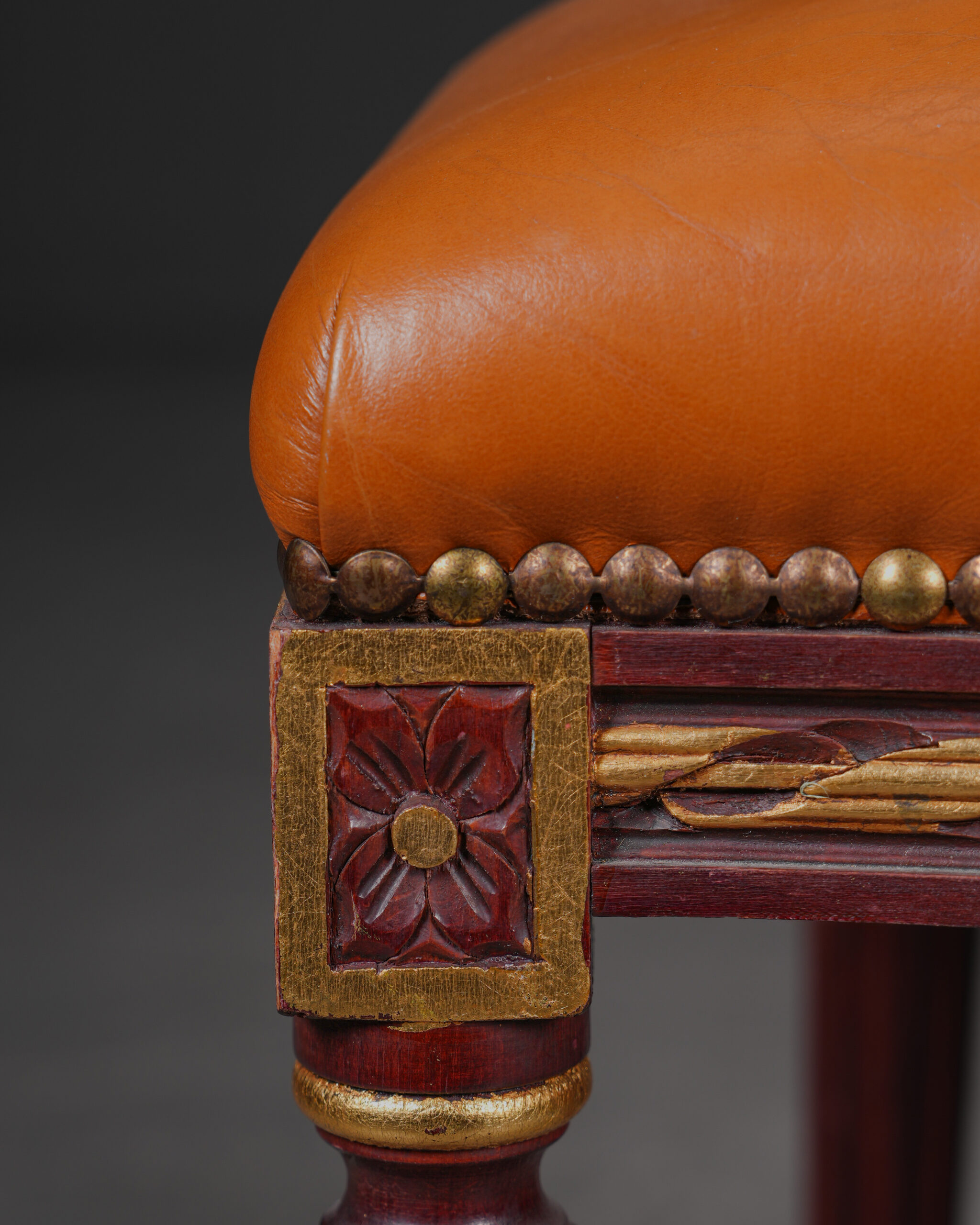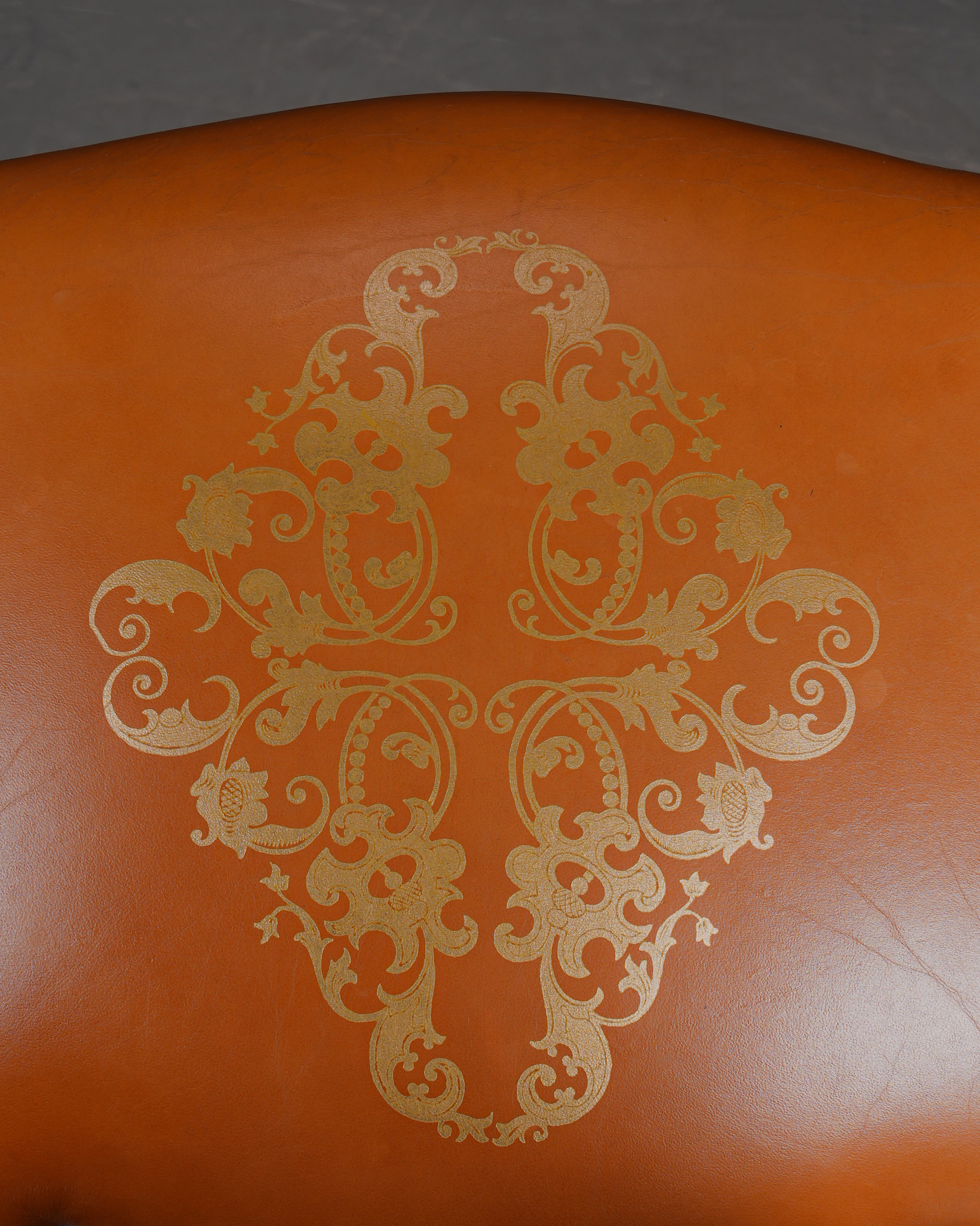 Sırtlık ve oturma bölümünde kullanılan turuncu tonlu döşeme, üzerindeki dekoratif motiflerle birlikte sandalyeye sıcak ve karakterli bir görünüm sunar. Oyma detaylara sahip ahşap gövde ve ince, yivli ayaklar ise tasarımın klasik zarafetini tamamlar.