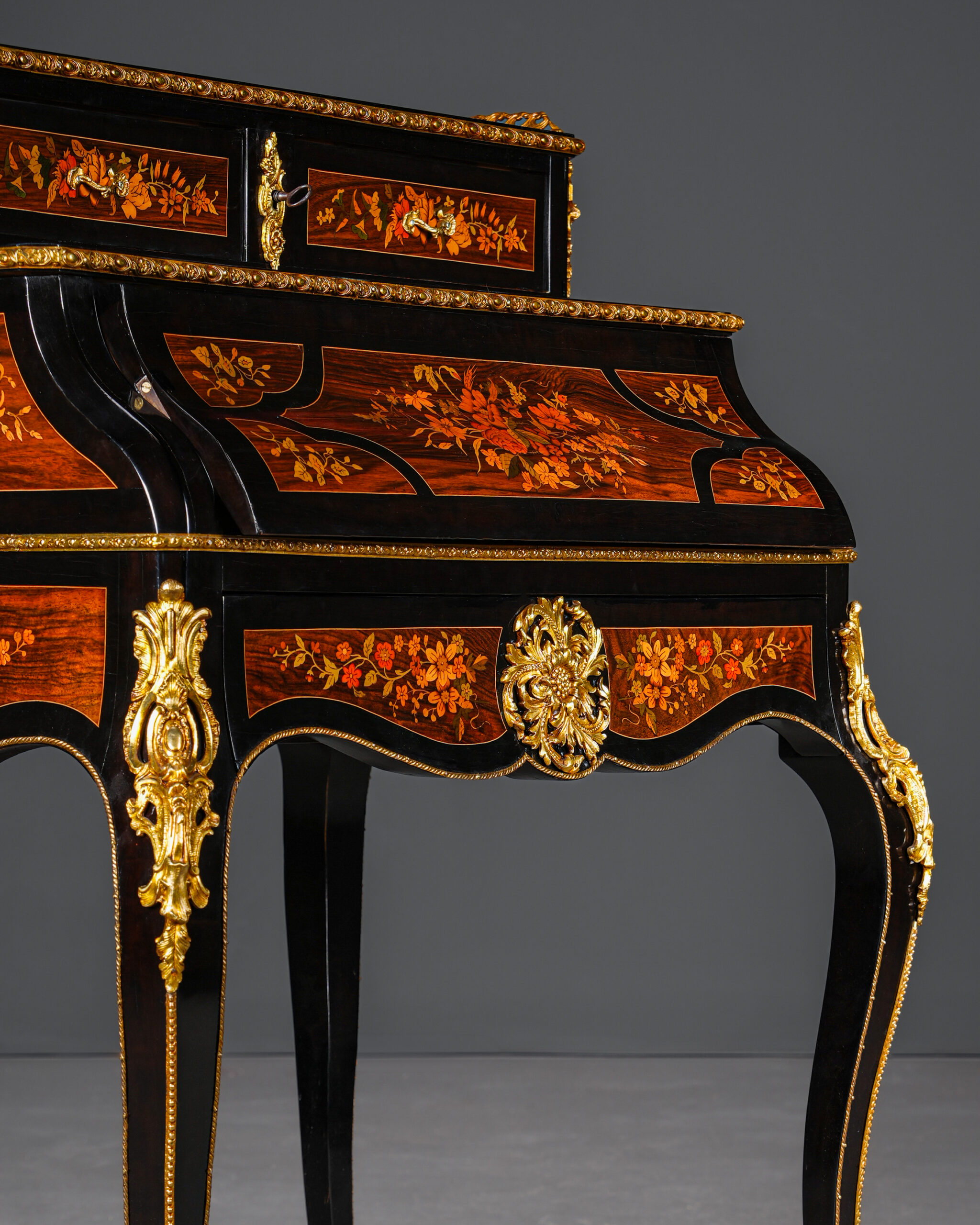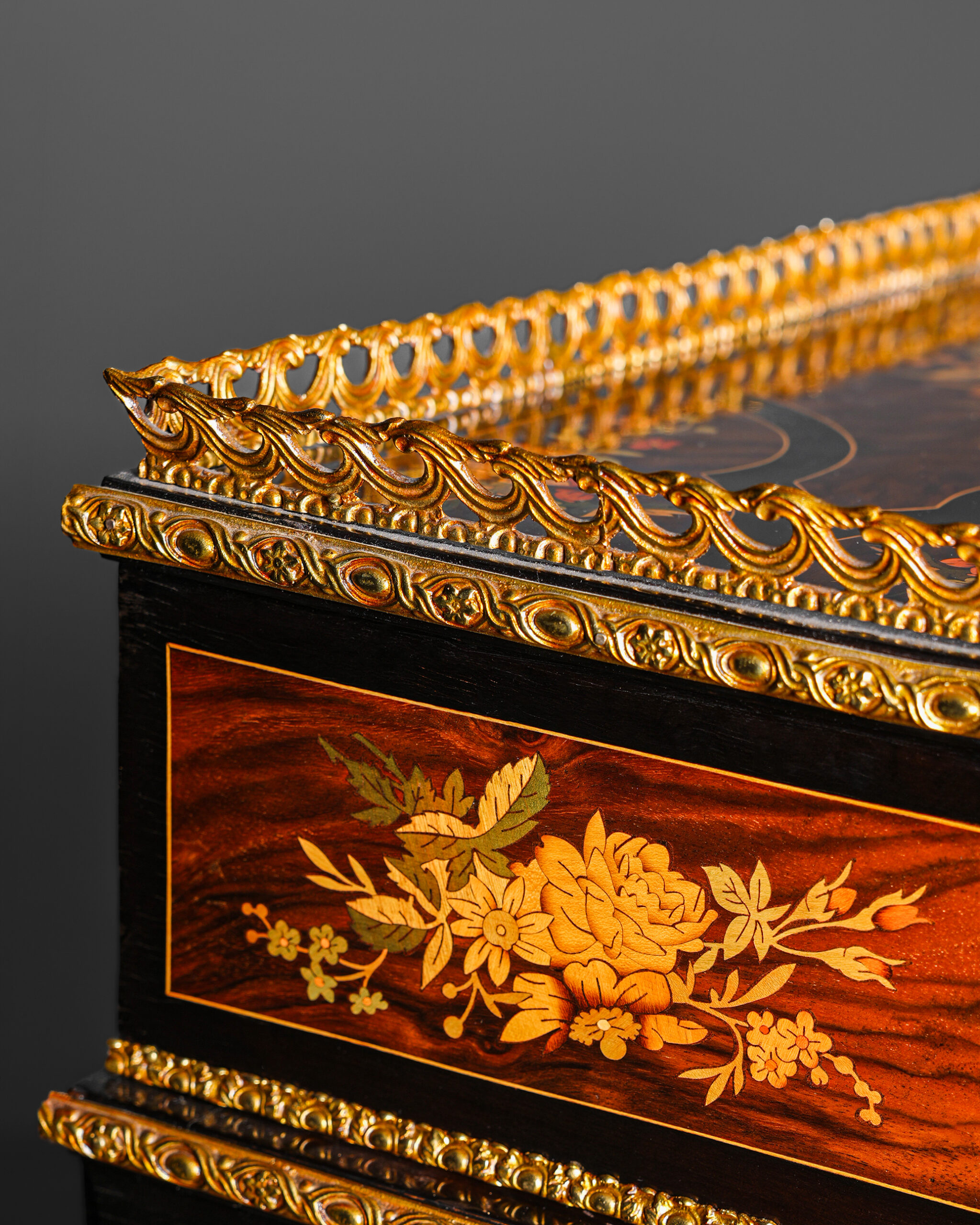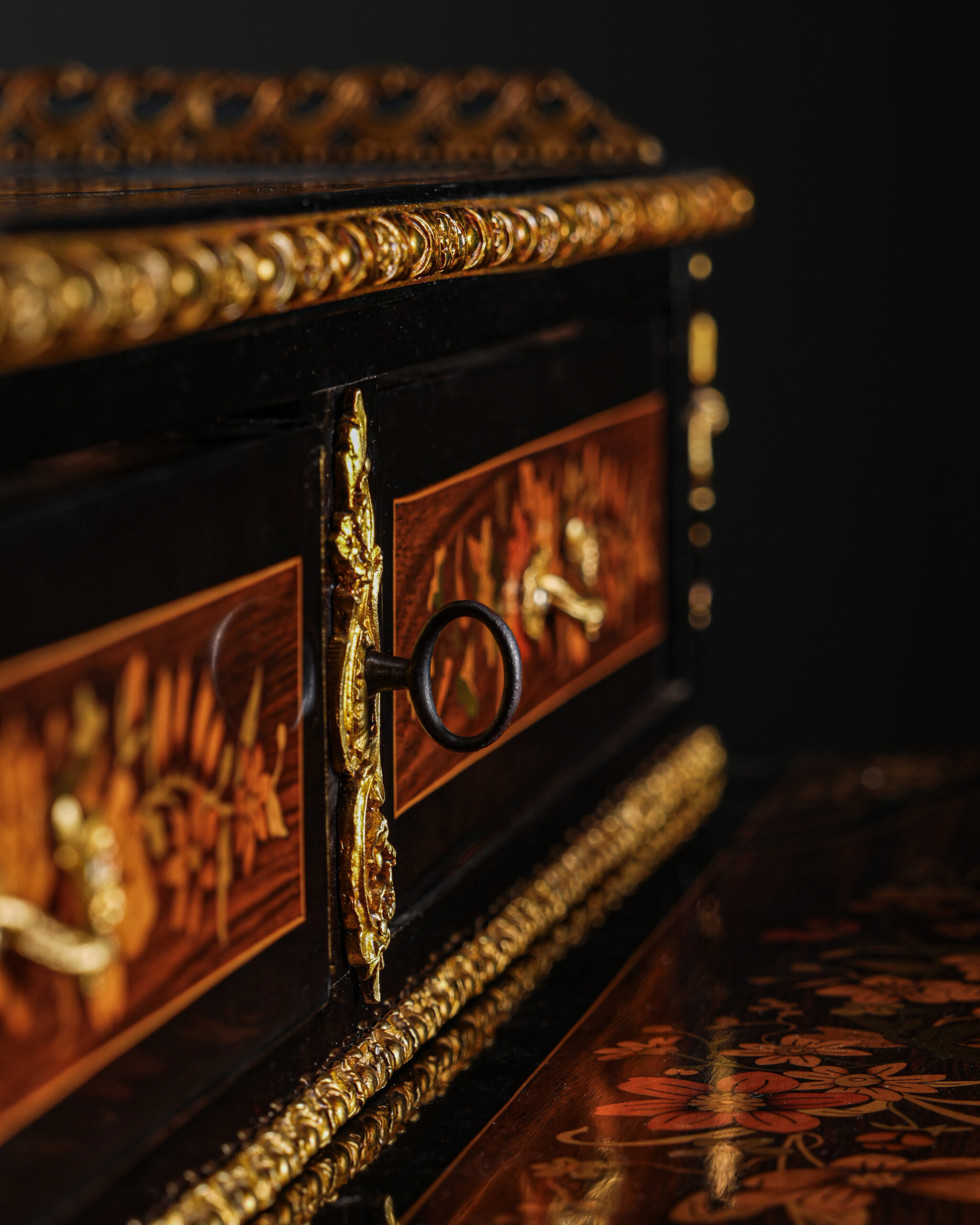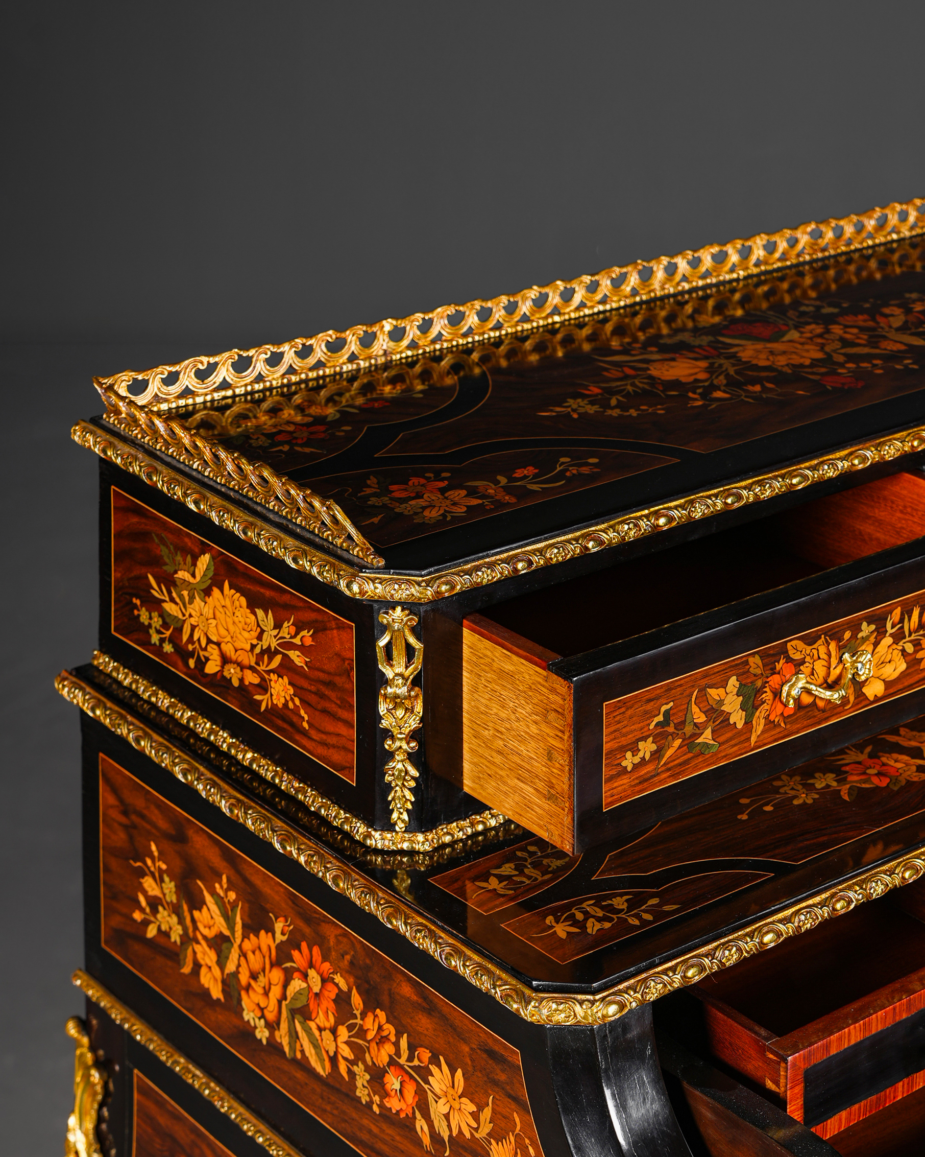 Zarif işçiliği ve zengin detaylarıyla öne çıkan bu marküterili sekreter, klasik Avrupa mobilya sanatının en seçkin örneklerinden biridir. Kavisli hatları, yoğun marküteri süslemeleri ve altın tonlu bronz aplikeleri ile güçlü bir görsel ihtişam sunar.