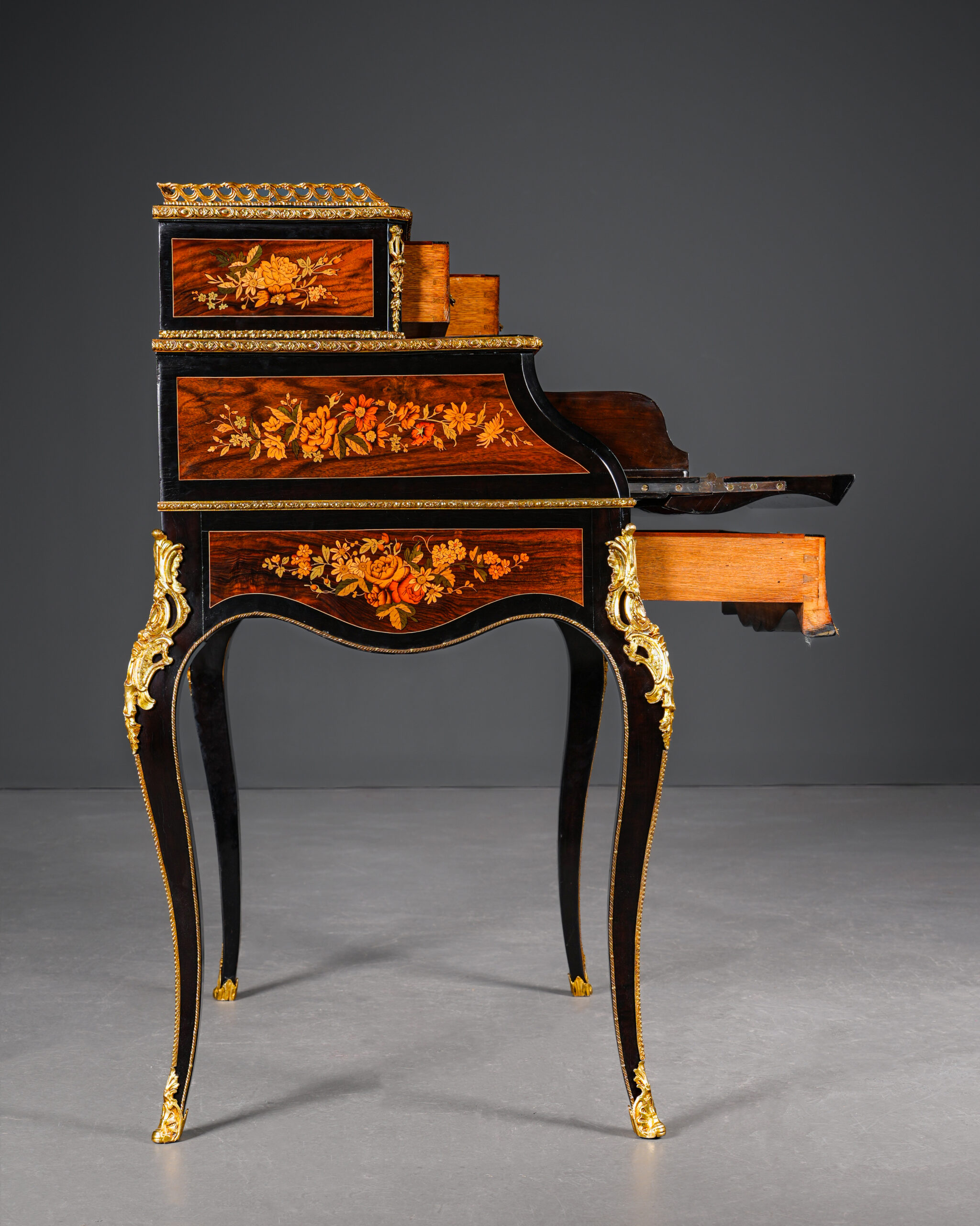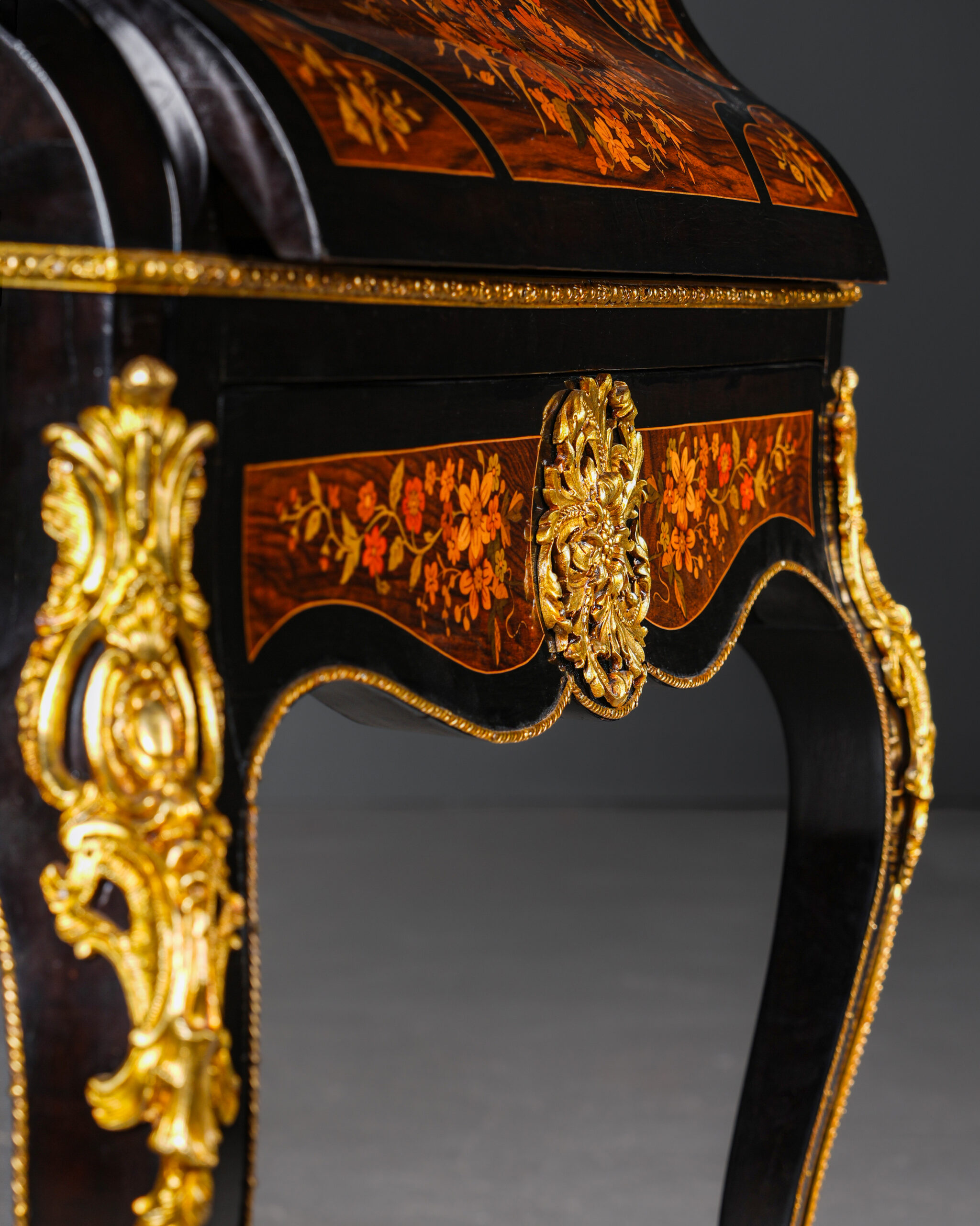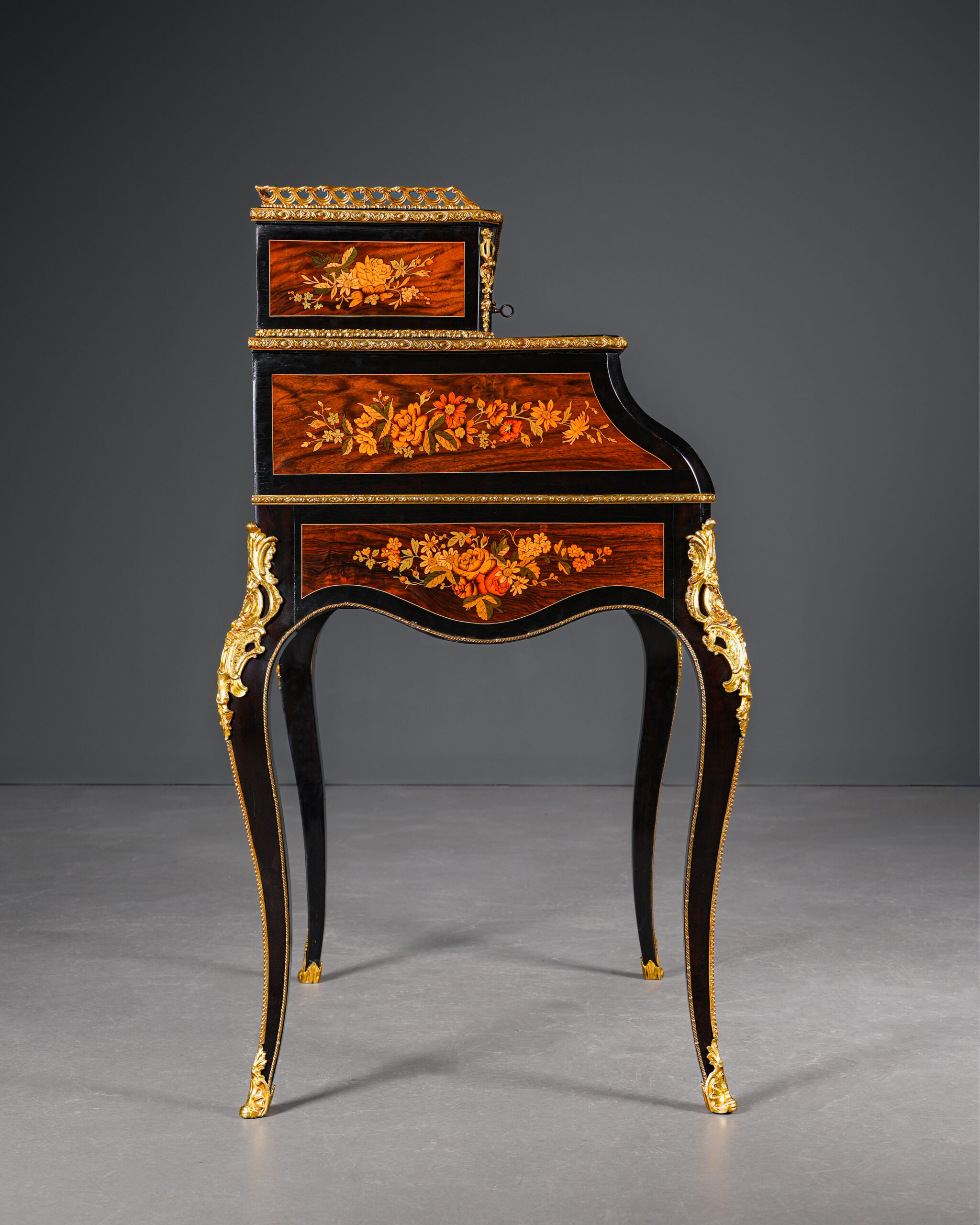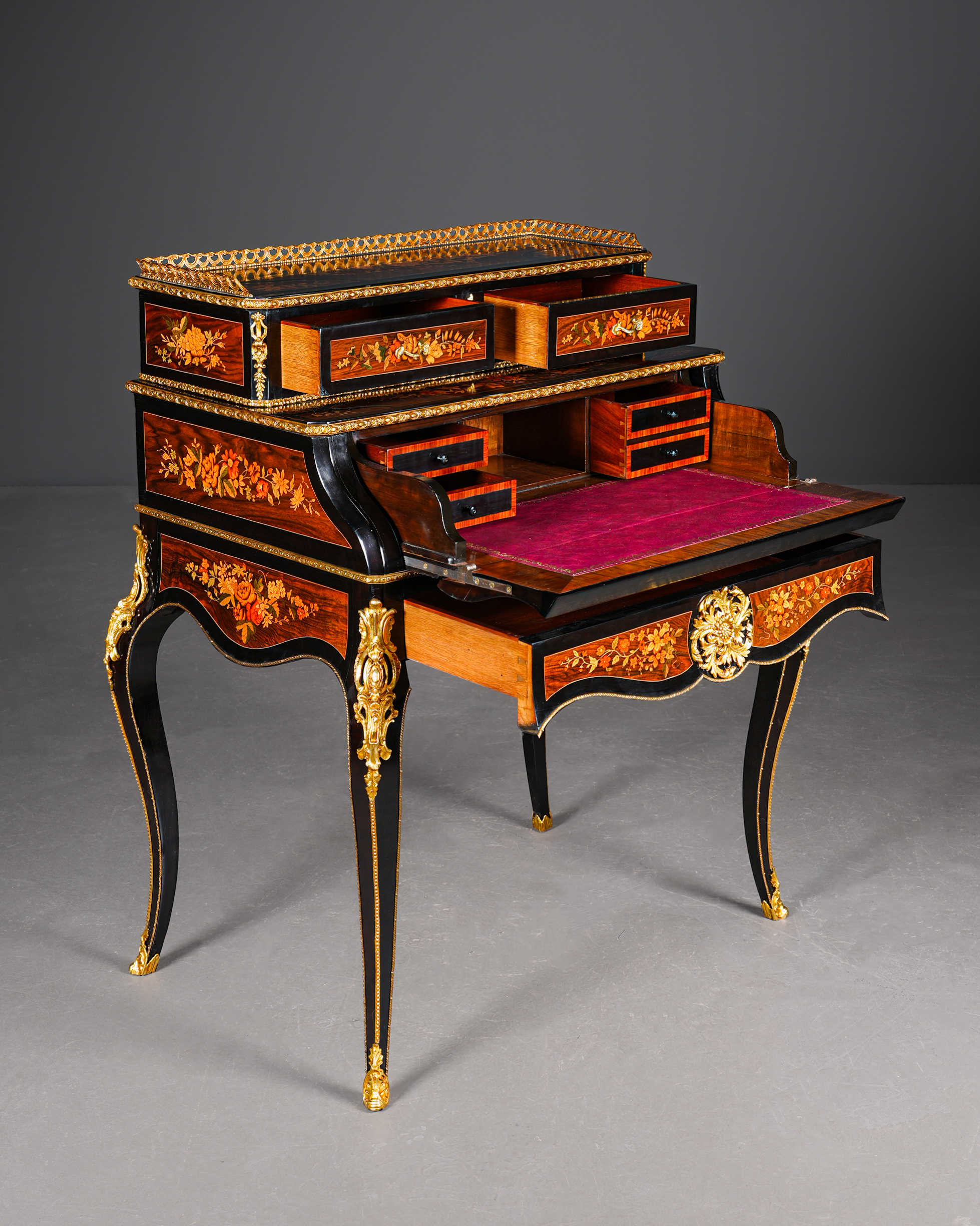 Zarif işçiliği ve zengin detaylarıyla öne çıkan bu marküterili sekreter, klasik Avrupa mobilya sanatının en seçkin örneklerinden biridir. Kavisli hatları, yoğun marküteri süslemeleri ve altın tonlu bronz aplikeleri ile güçlü bir görsel ihtişam sunar.