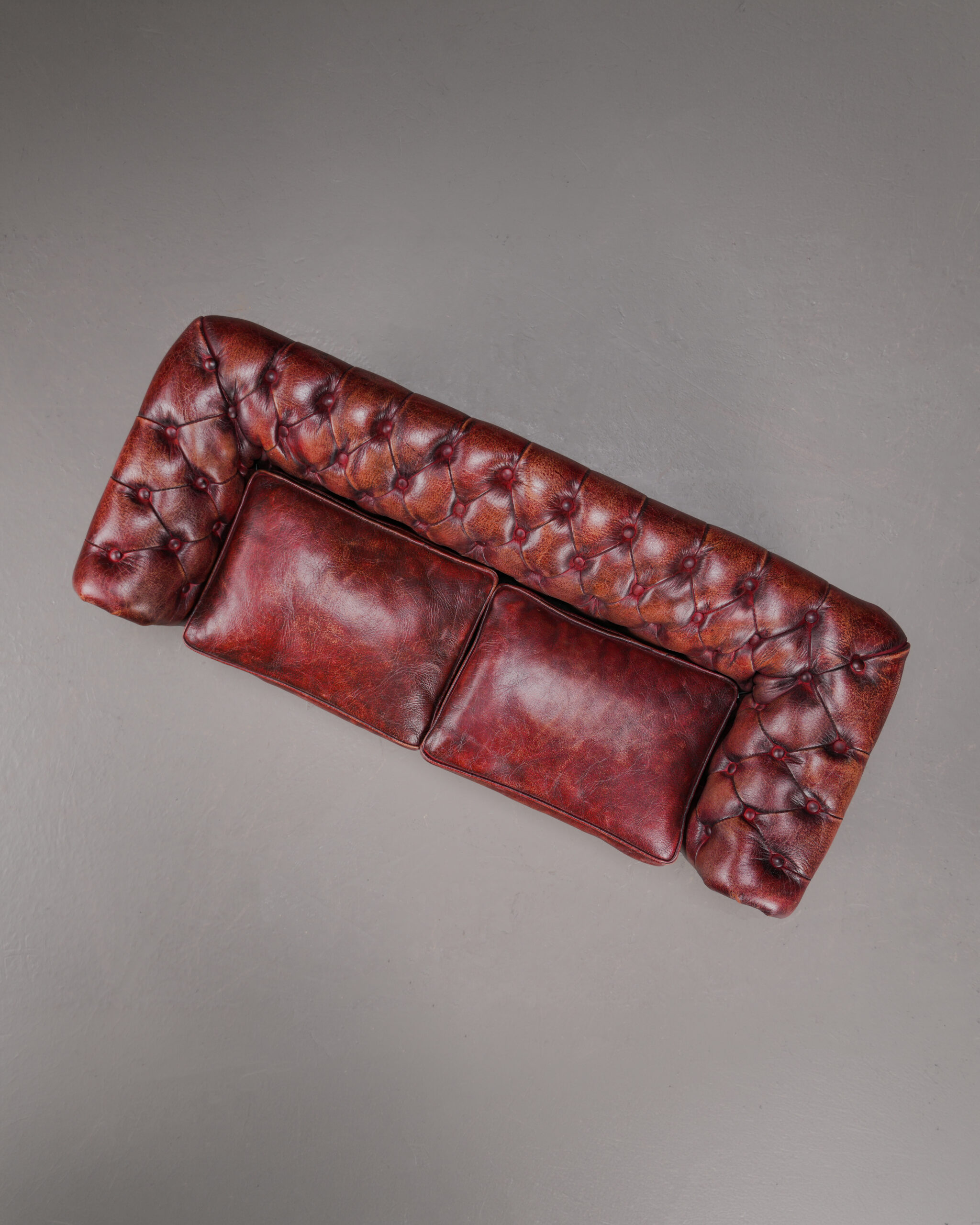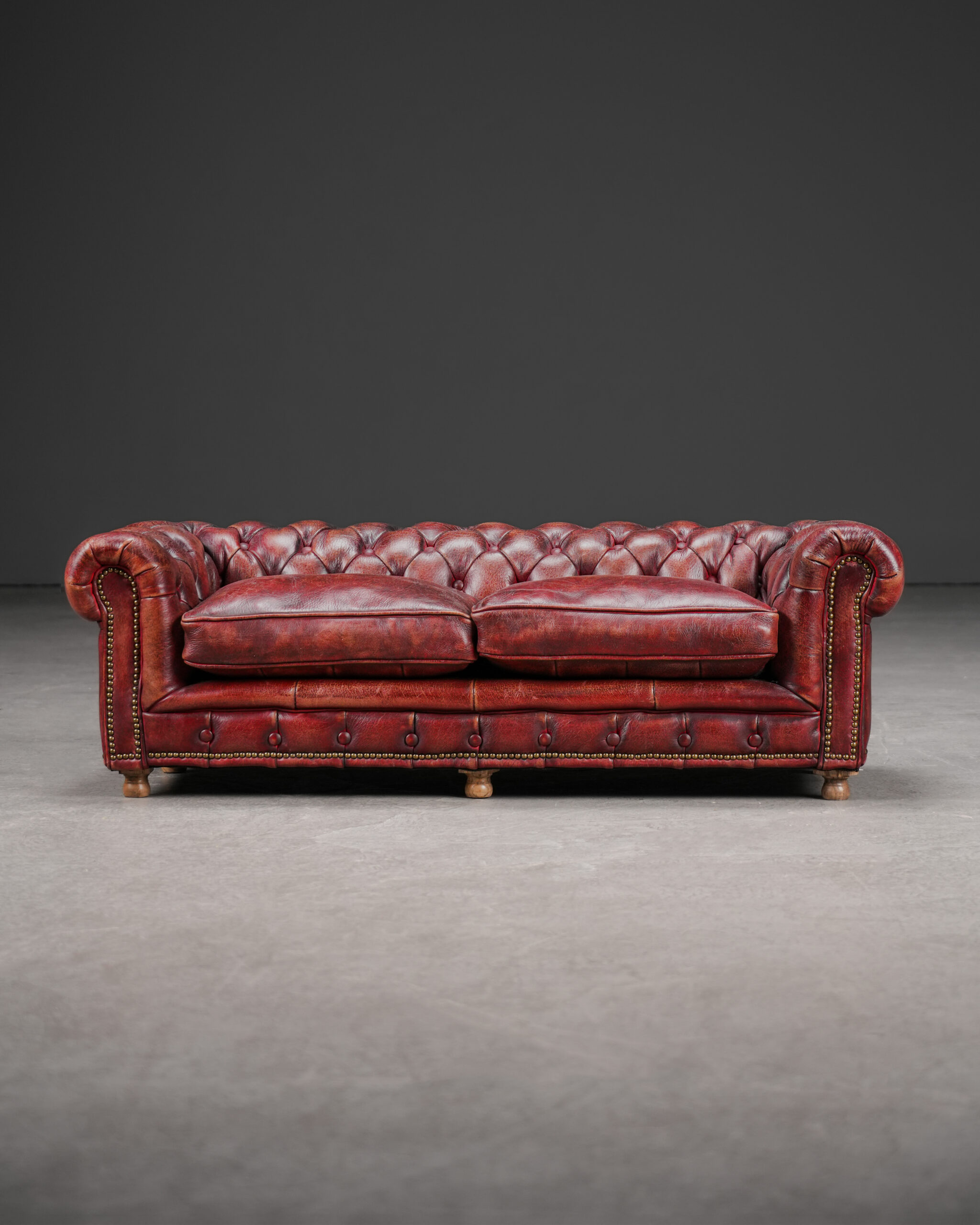 Derin kapitone düğmeli yüzeyi, yuvarlatılmış kol formları ve pirinç çivi detayları, 19. yüzyıl İngiliz Chesterfield kanepelerinin tanınan tasarım dilini korur. Kırmızı tonlu deri döşemesi ve zengin patina etkisi, parçaya hem vintage bir karakter hem de güçlü bir görsel etki kazandırır.