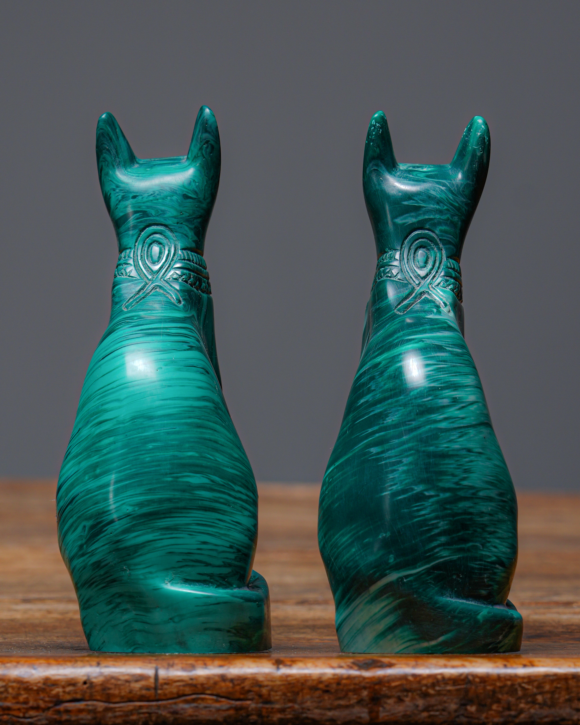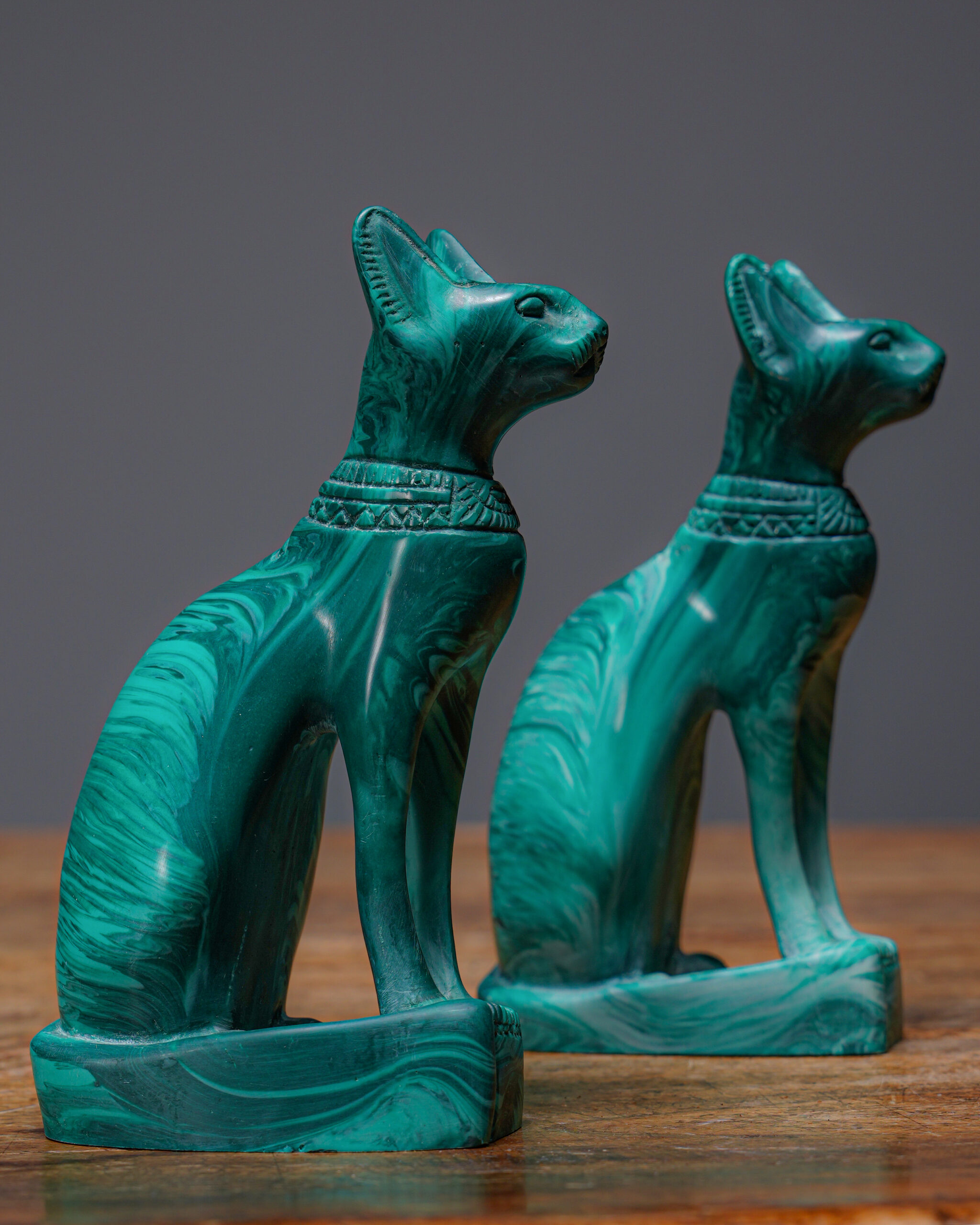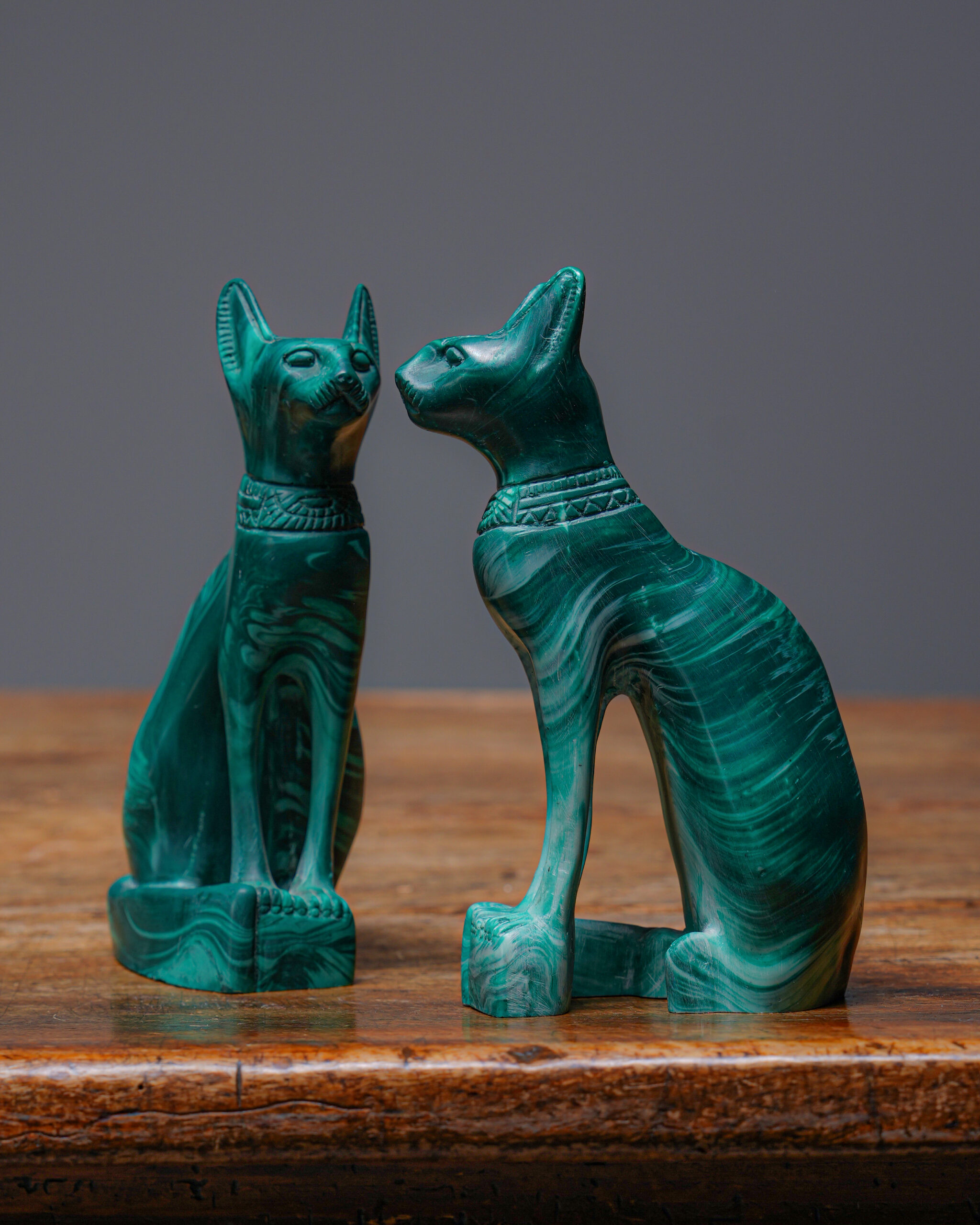 Çift olarak sunulan bu Bastet heykelleri; konsol, sehpa, kitaplık veya çalışma alanlarında dekoratif bir vurgu oluştururken, aynı zamanda bulunduğu ortama kültürel ve spiritüel bir derinlik katar.