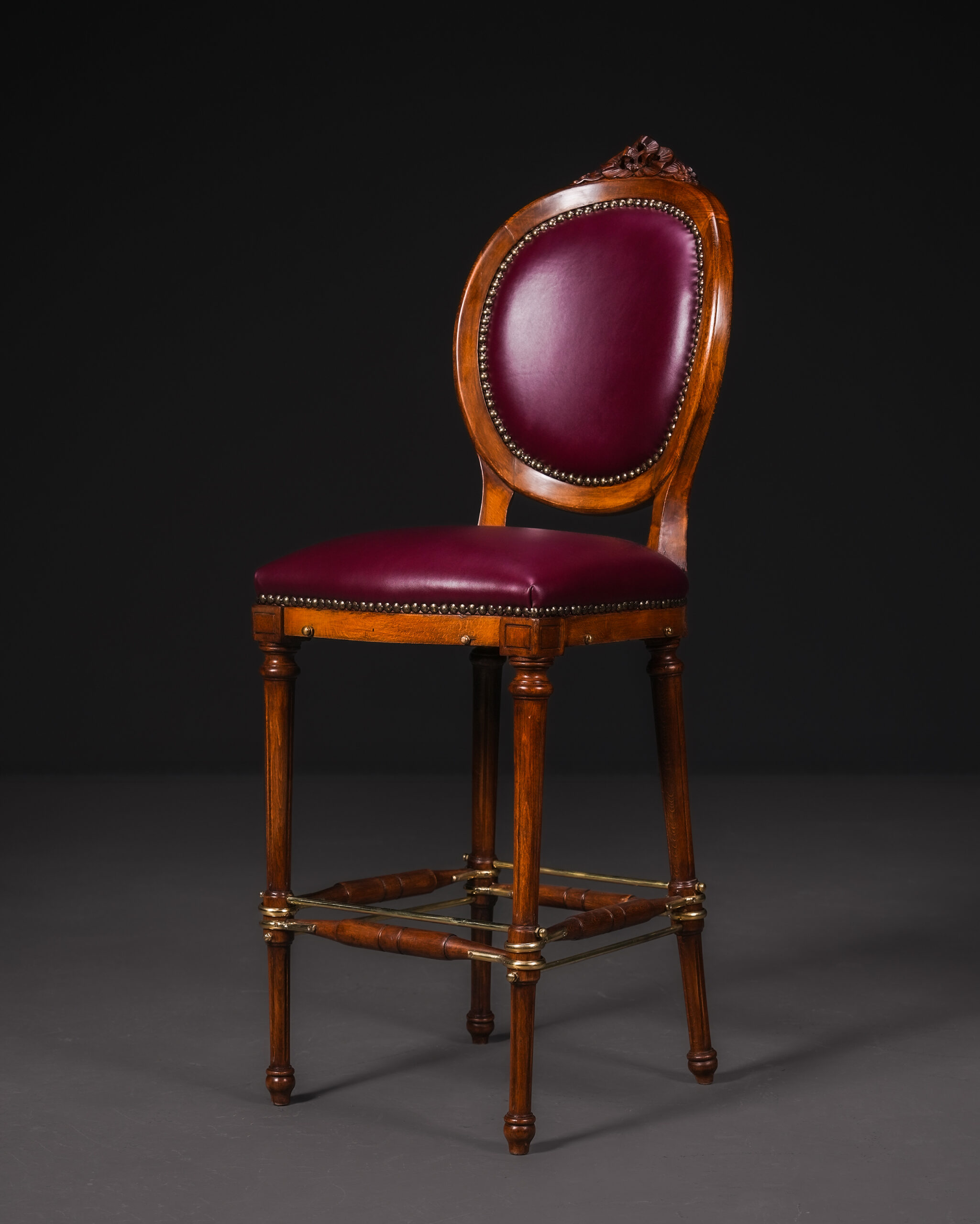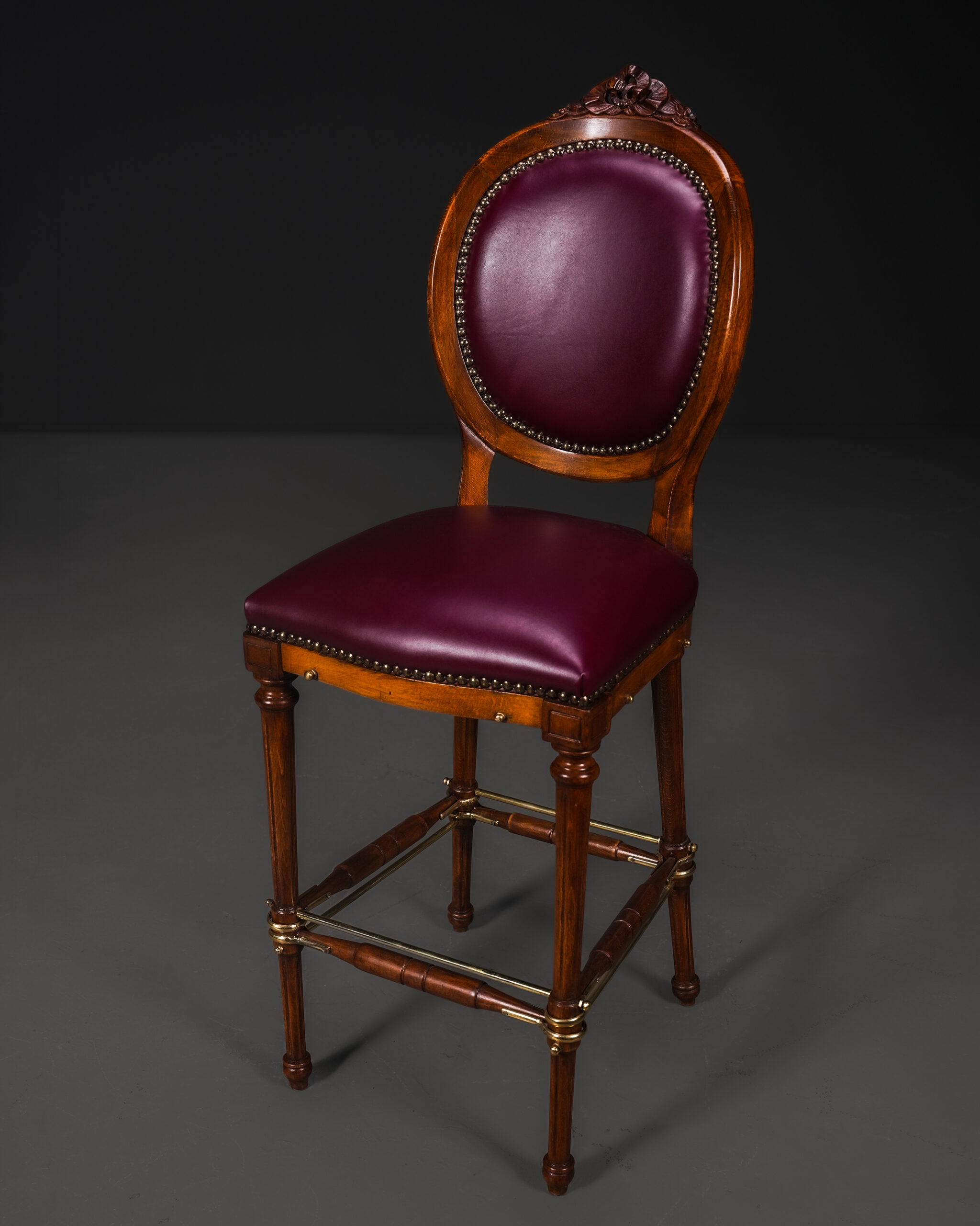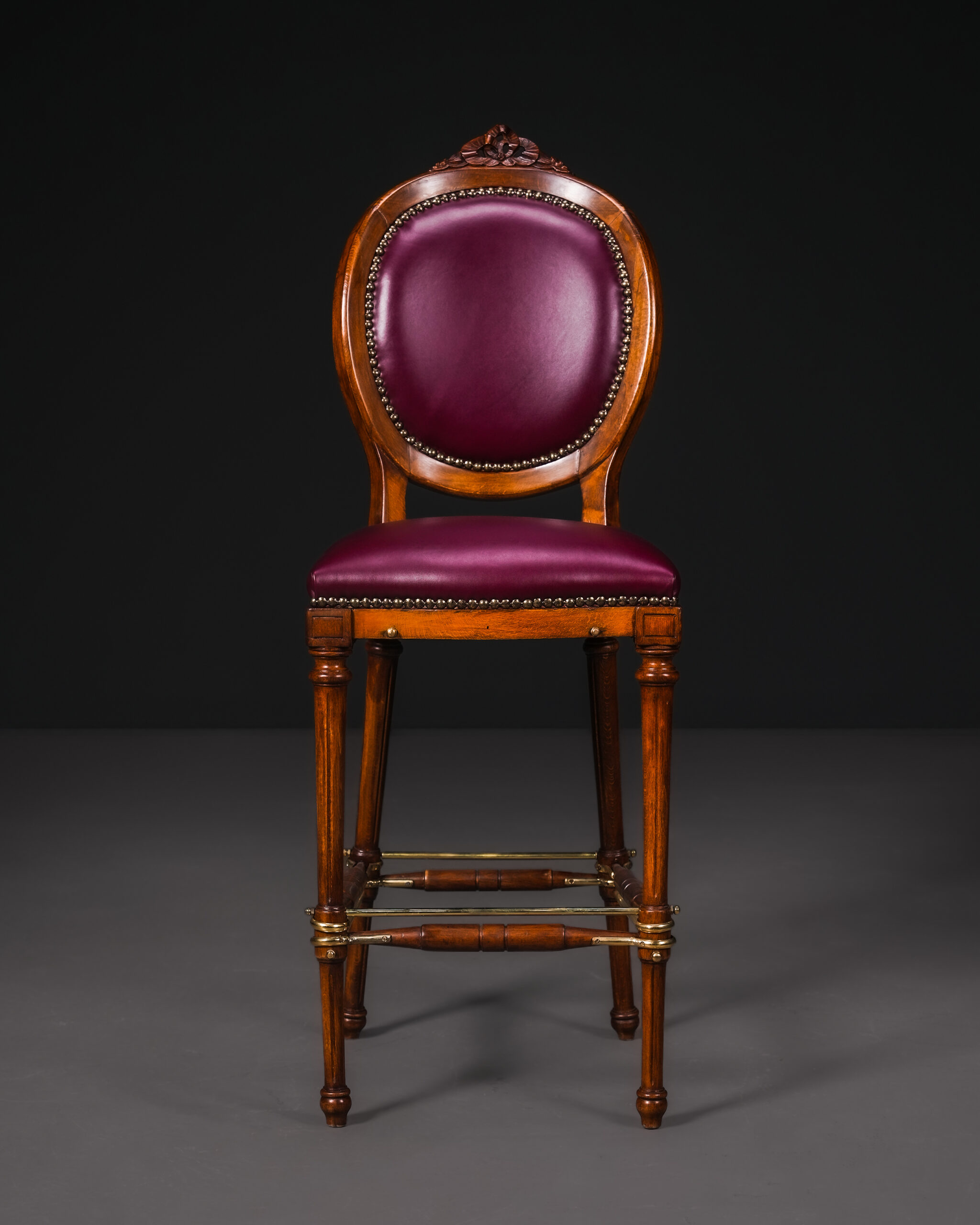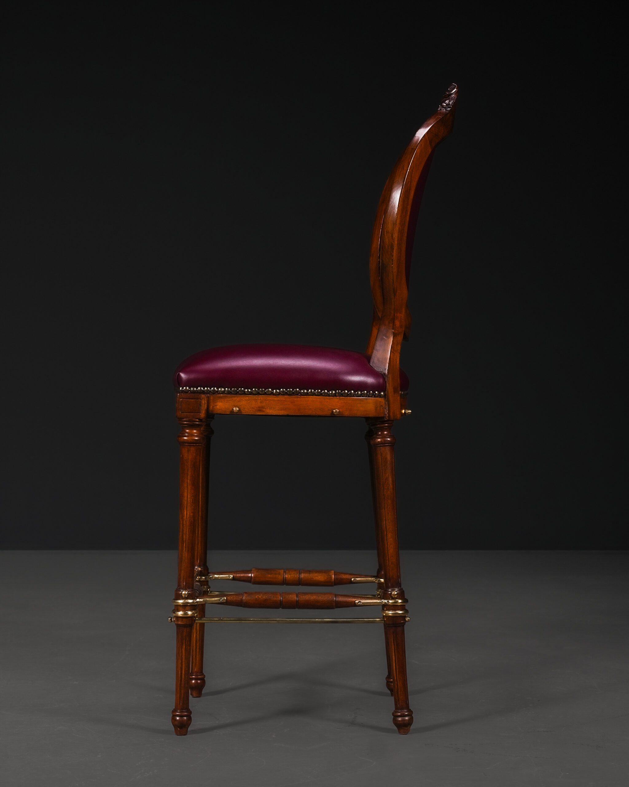 Formu, gövde kalınlığı ve pirinç konstrüksiyon detayları; bu tip sandalyelerin genellikle otel barları ve profesyonel mekânlar için üretilmiş modellerle örtüştüğünü gösterir. Klasik çizgileri, deri–ahşap–pirinç üçlüsüyle oluşturduğu katmanlı malzeme dili ve yüksek sırtlı yapısı sayesinde mekânda güçlü ve sofistike bir odak noktası oluşturur.