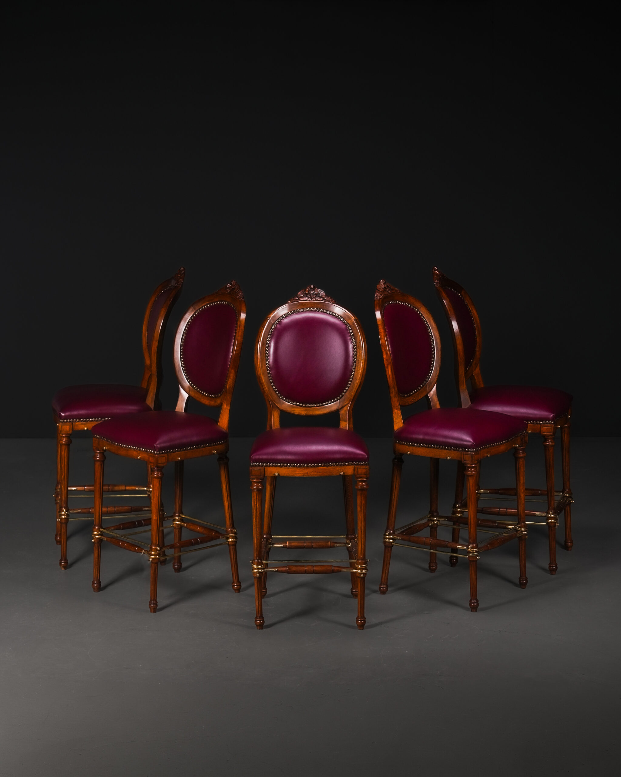 Deri oturum ve sırt yüzeyi, masif ahşap gövdesi ve pirinç kuşak–ayak dayama detaylarıyla öne çıkan bu vintage bar sandalyeleri, yüksek sırtlı ve dengeli oranları sayesinde özellikle bar, lounge ve özel kulüp projelerinde tercih edilen “kontrat mobilya” karakterini yansıtır.
