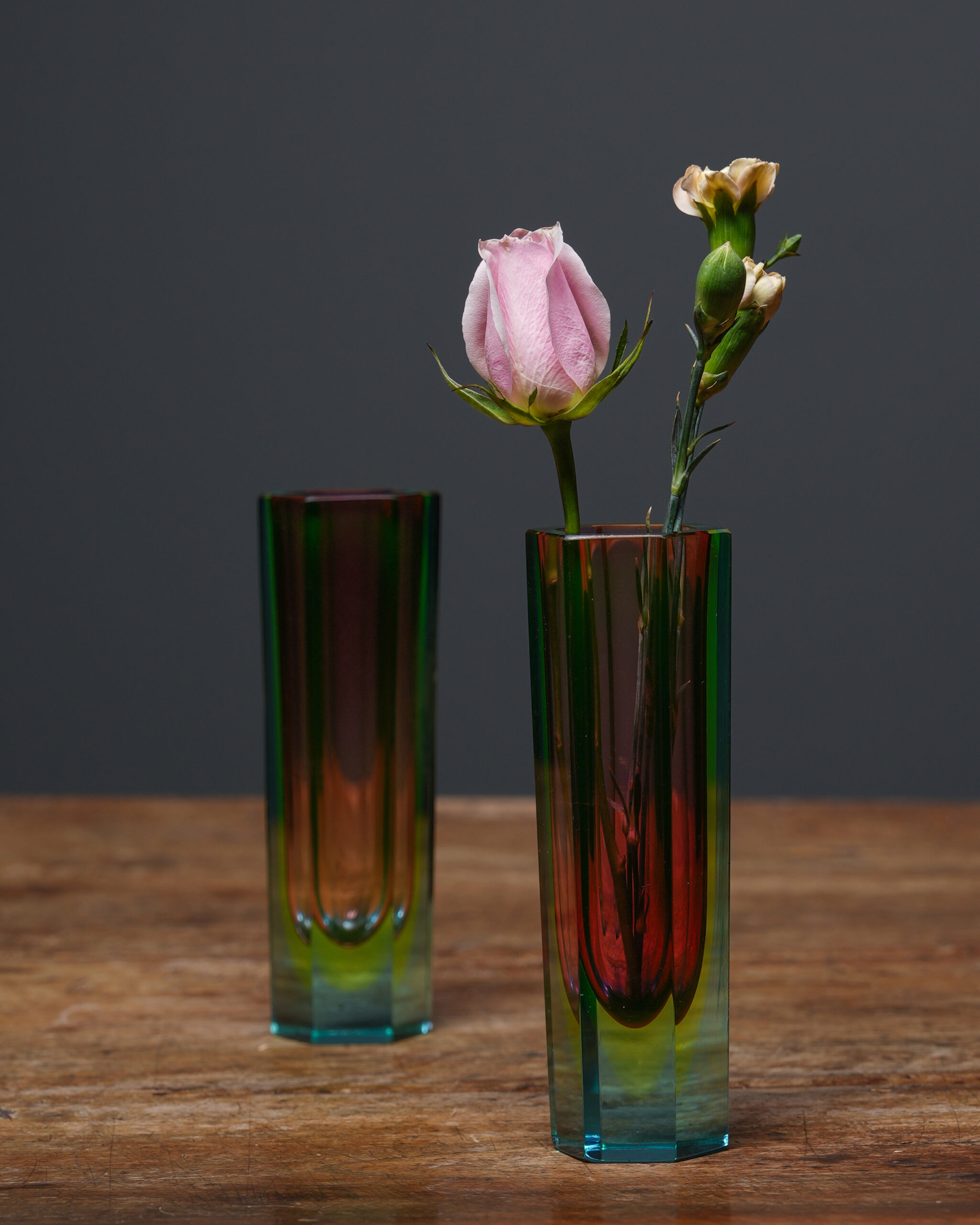 Canlı renk geçişleri ve modern formuyla öne çıkan bu cam vazolar, dekoratif objeler arasında zarif ve dikkat çekici bir etki yaratır. Şeffaf cam içinde katmanlı olarak görülen mor, mavi ve yeşil tonlar, ışığa göre değişen dinamik bir görünüm sunarak mekâna derinlik ve karakter katar.