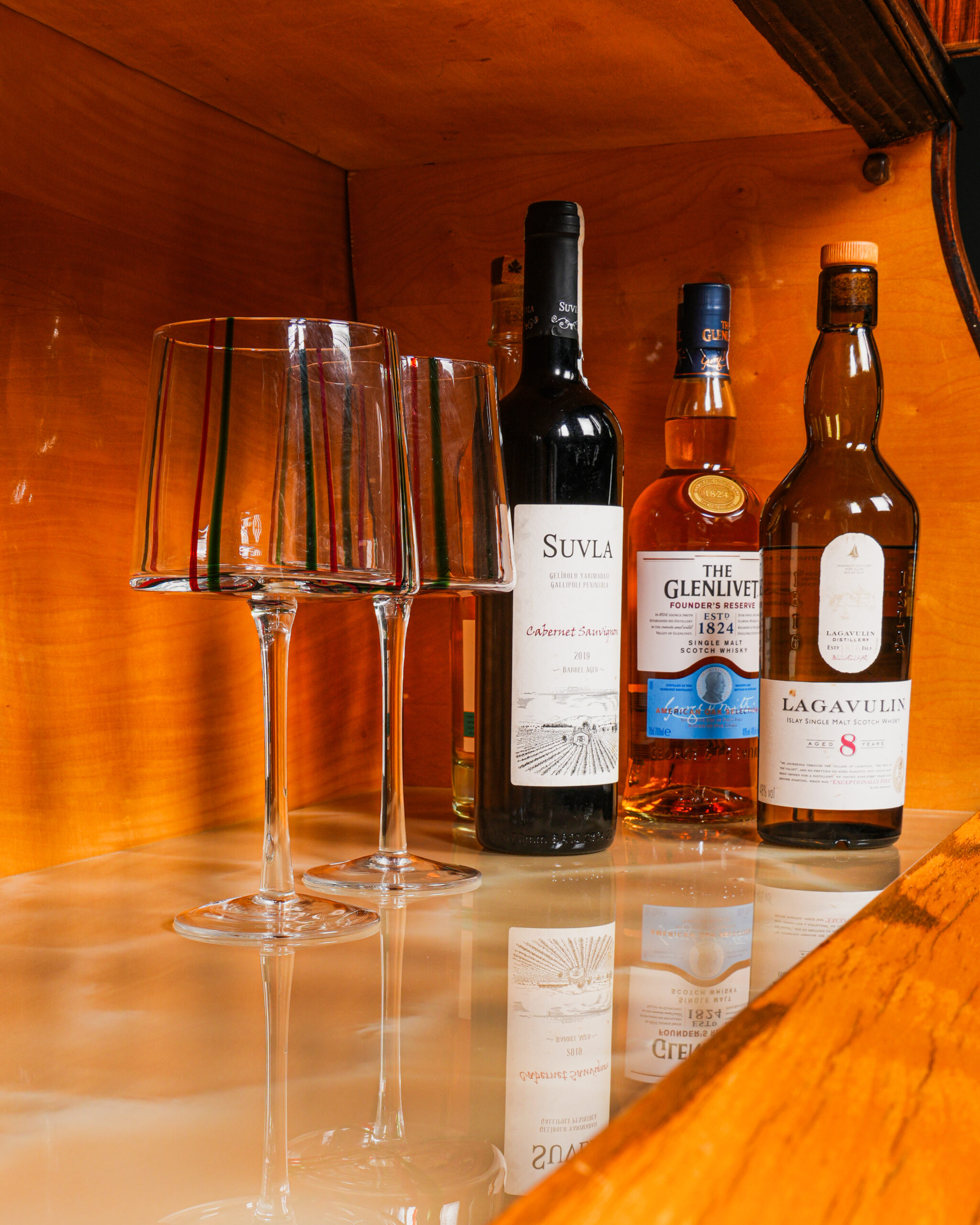 Zarif formu ve ince detaylarıyla öne çıkan bu cam kadehler, klasik cam işçiliğini modern bir yorumla buluşturur. Şeffaf yüzey üzerinde uzanan kırmızı ve yeşil çizgiler, sade formu hareketlendirerek sofralara canlı ve sofistike bir dokunuş katar.