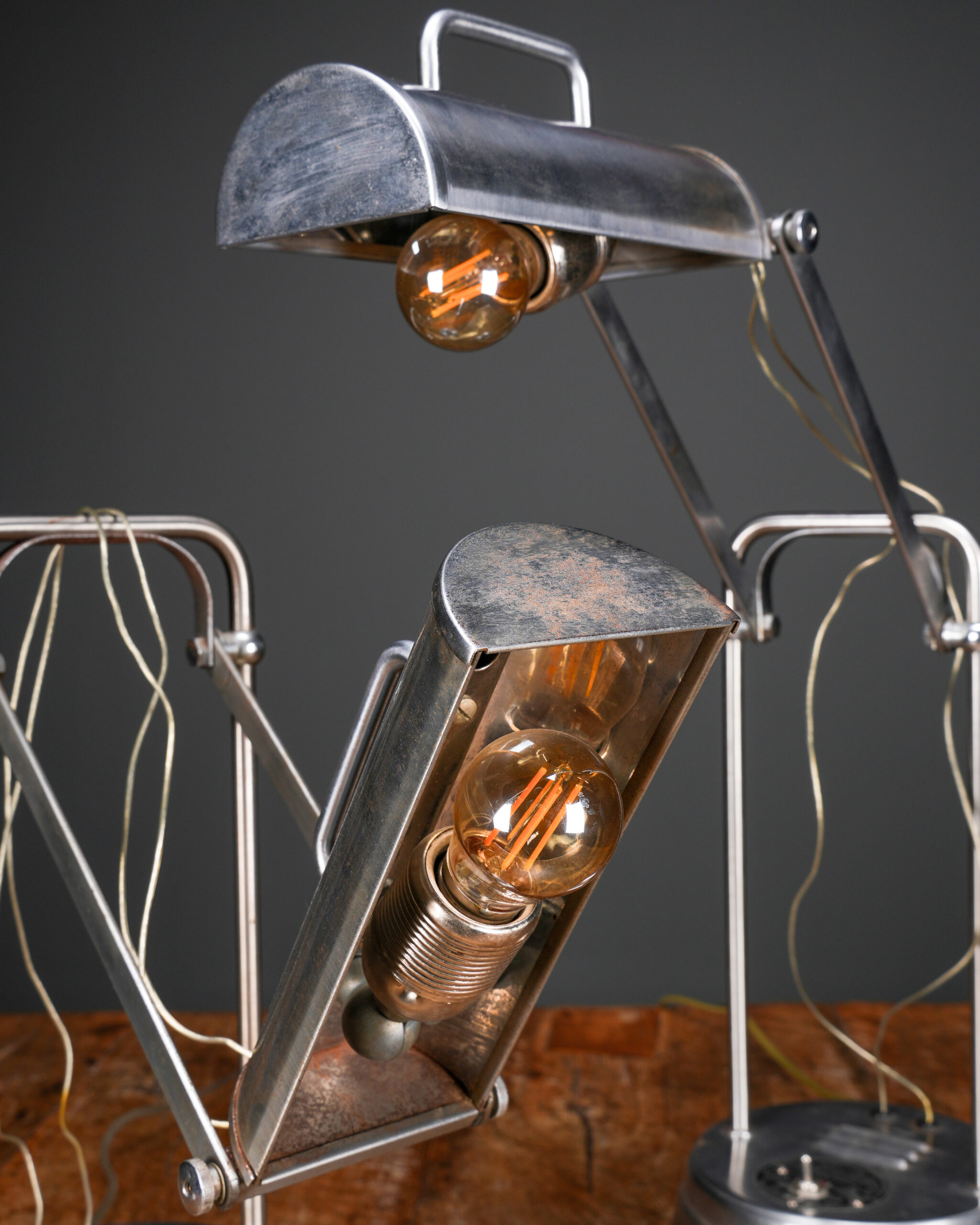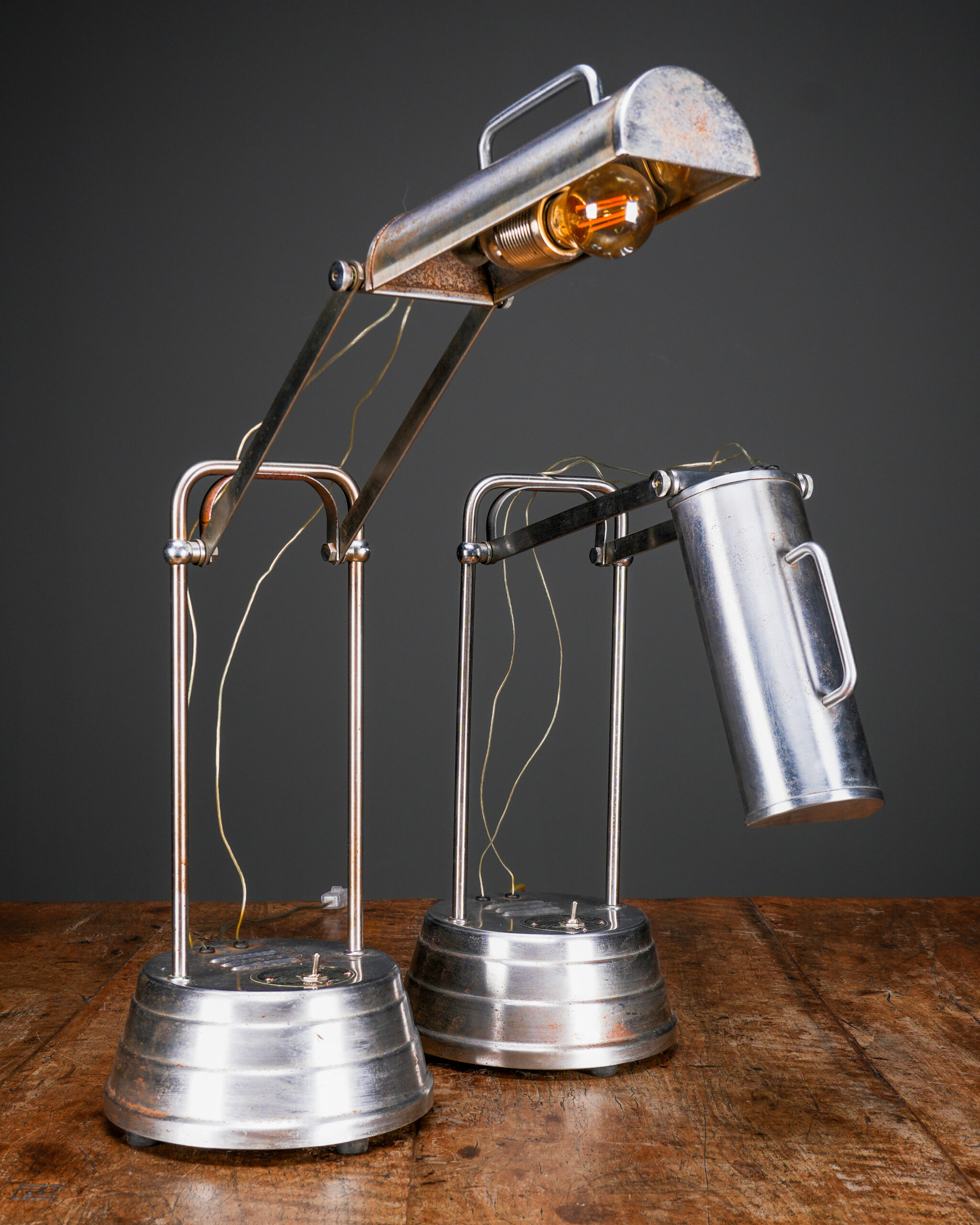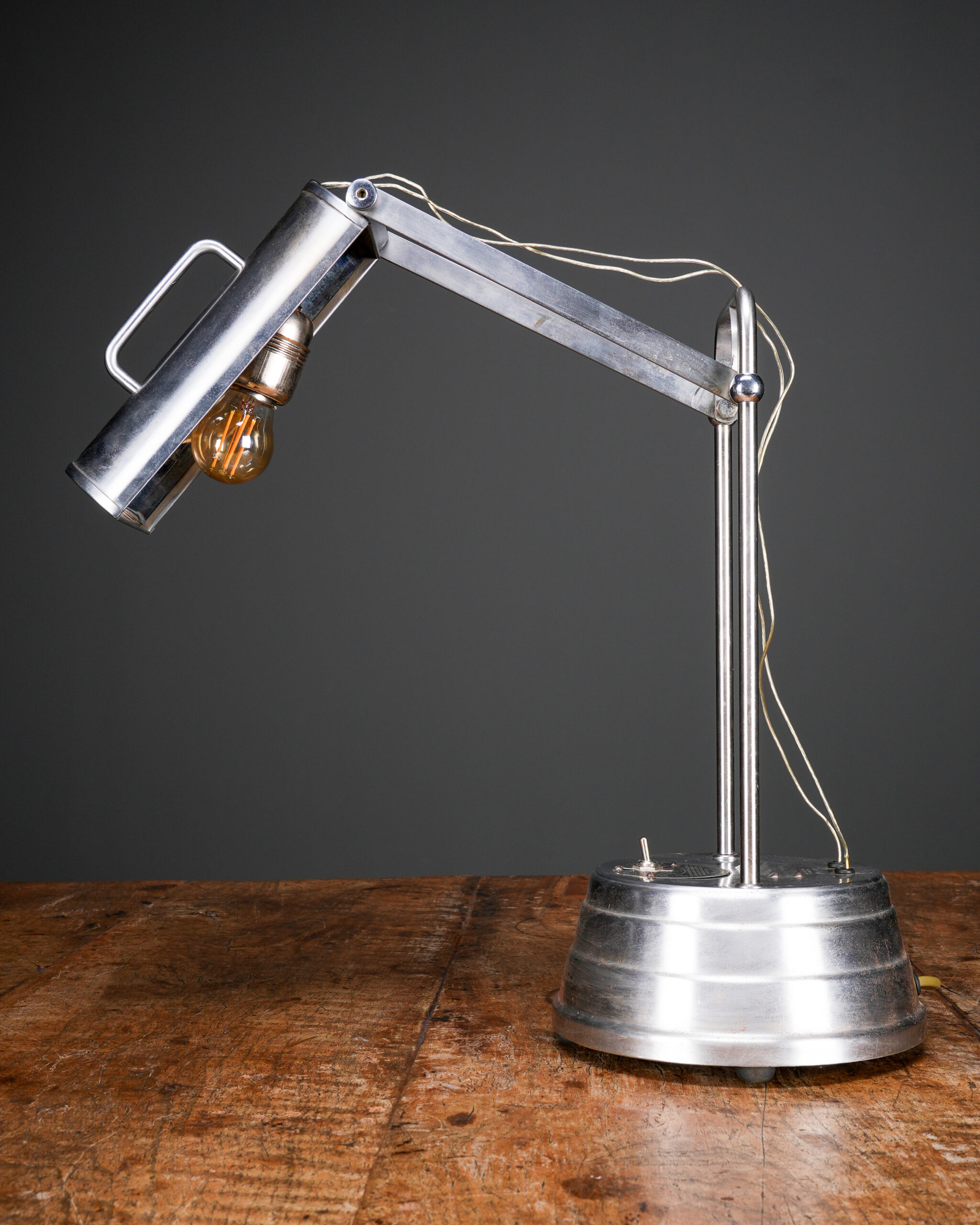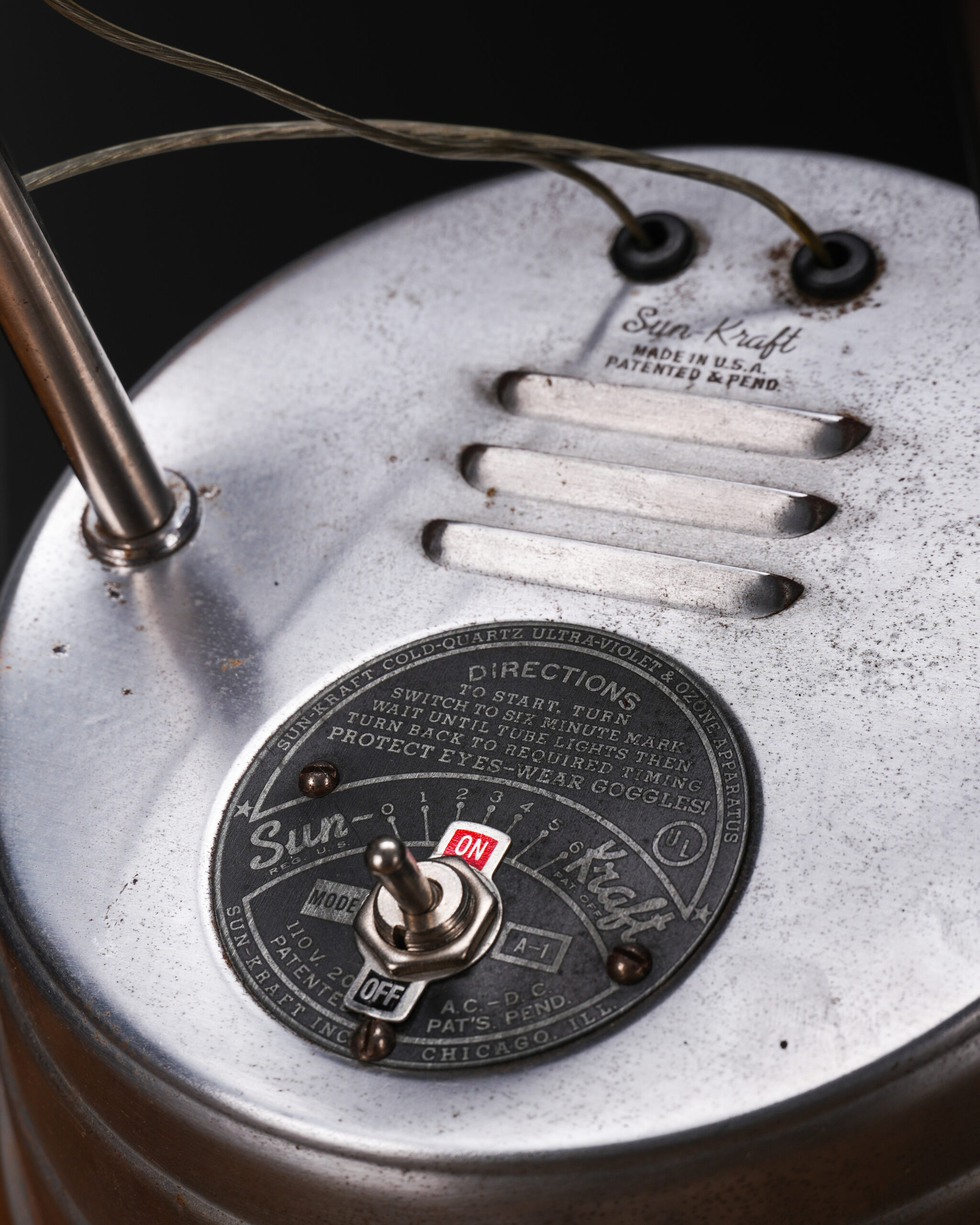 Bu sıra dışı vintage lamba, 1930–40’lı yıllarda Chicago’da üretilmiş orijinal bir Sun-Kraft Cold Quartz Ultraviolet Light Therapy Unit (ultraviyole ışık terapi cihazı) temel alınarak dönüştürülmüştür.