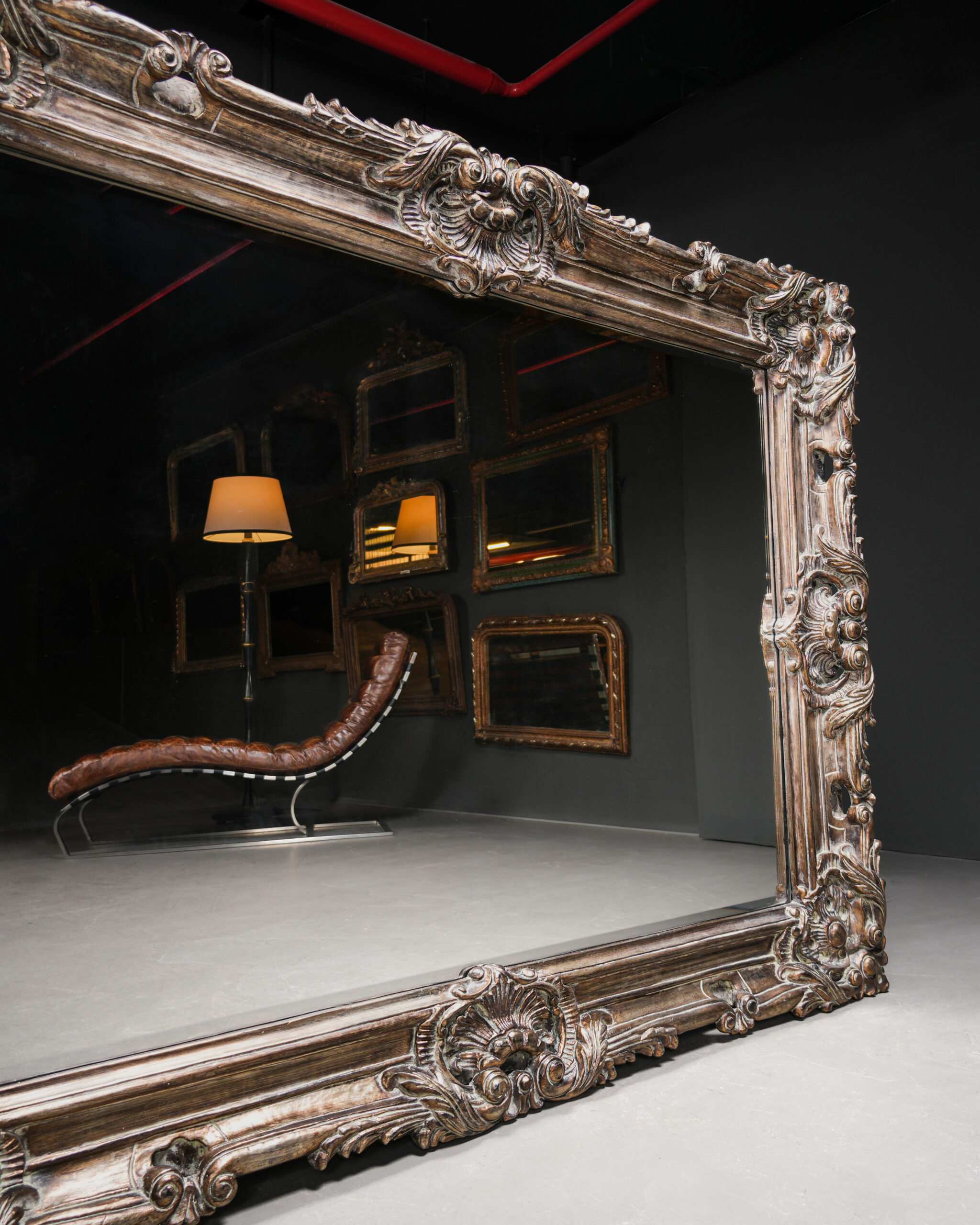 Dünyaca ünlü İngiliz kökenli mobilya markası Theodore Alexander tarafından üretilmiş bu büyük duvar aynası, zengin oyma detayları ve antik gümüş patinasıyla dikkat çeker. Derin kabartmalı akantus yaprakları, kıvrımlı scroll formlar ve köşelerde yer alan rozet motifleri, aynaya güçlü bir mimari karakter kazandırır.