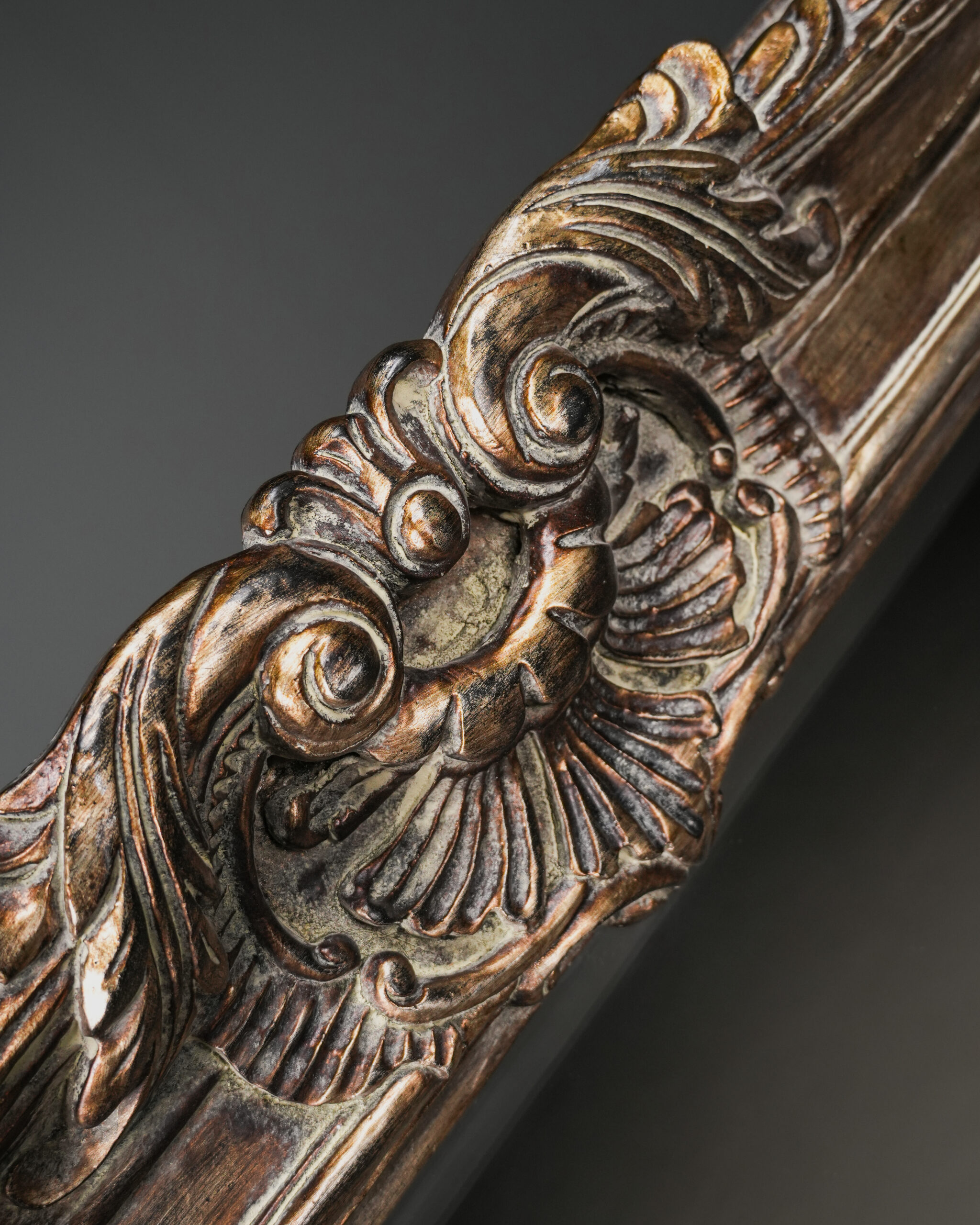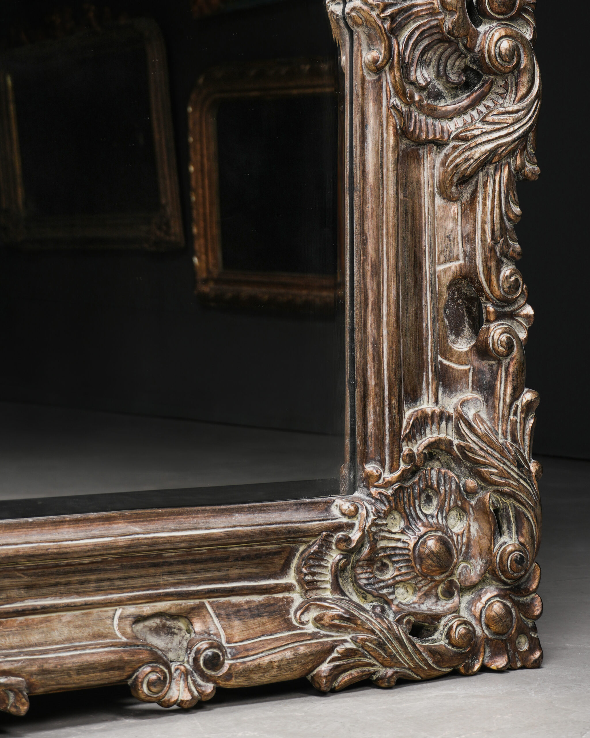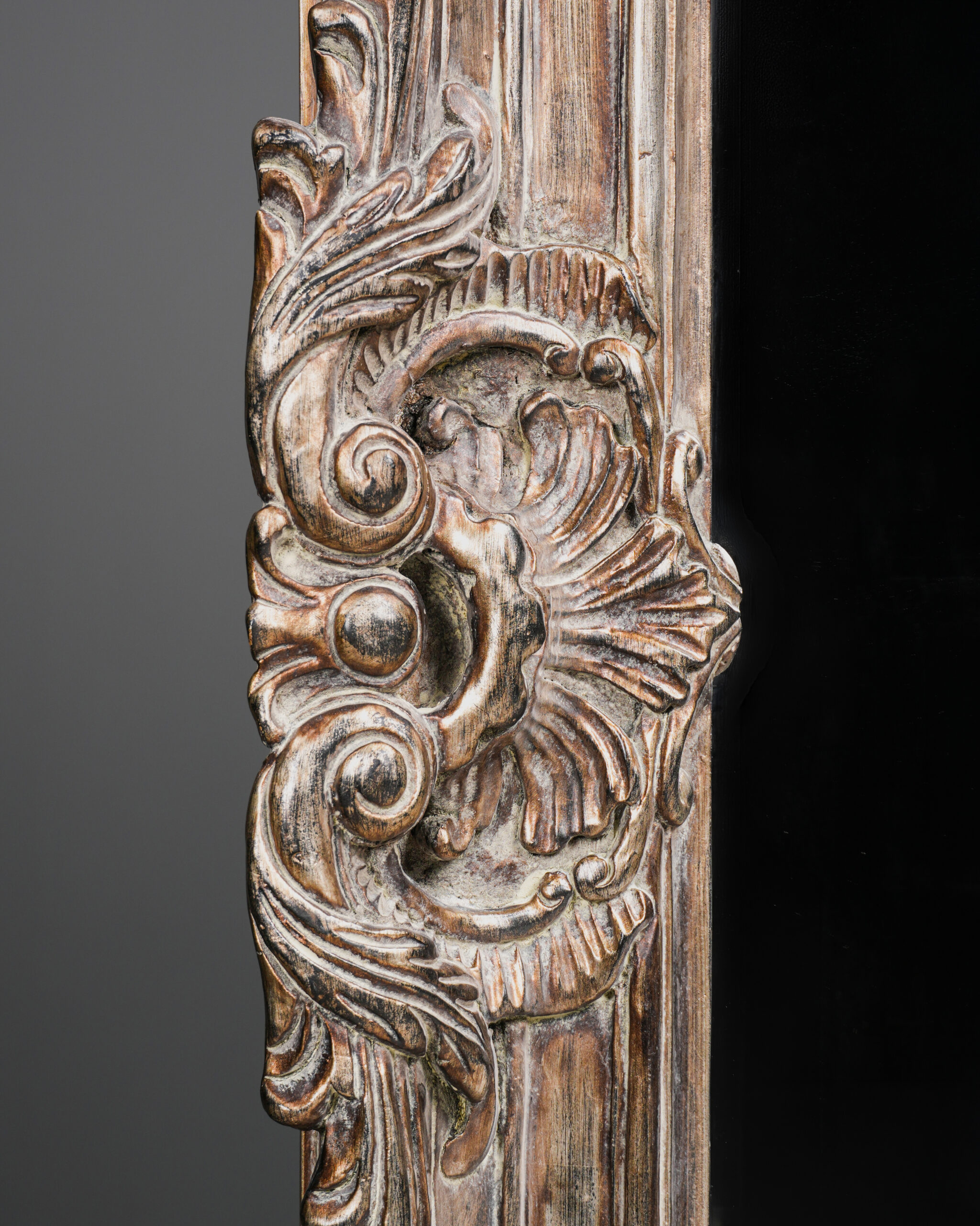 Kalın ve hacimli çerçevesi boyunca devam eden katmanlı Rococo oyma kompozisyonu, ışık ve gölge oyunlarıyla yüzeye üç boyutlu bir hareket kazandırır. Antik gümüş tonlarındaki patina finish ise oyma detaylarının iç kısımlarında daha koyu, çıkıntılı yüzeylerde ise daha açık tonlarda görünerek klasik Avrupa dekorasyonunun zarif estetiğini yansıtır.