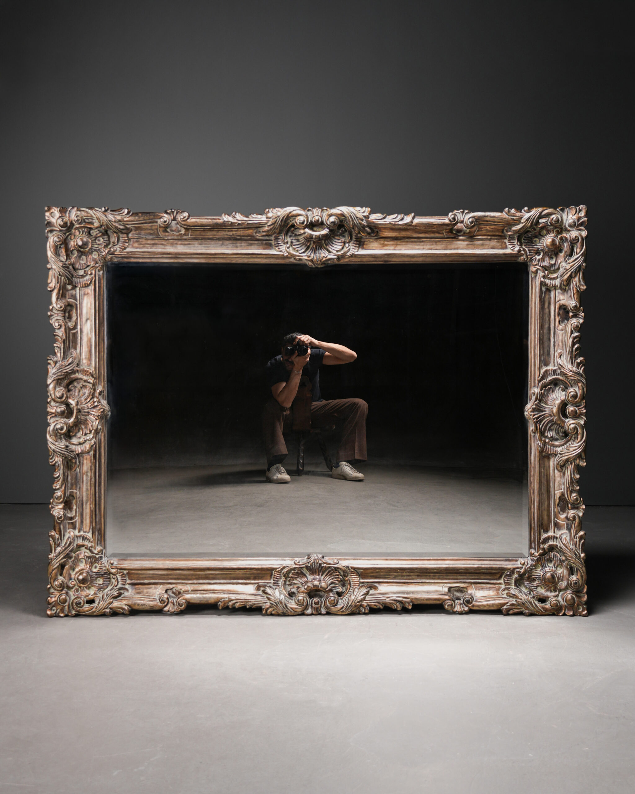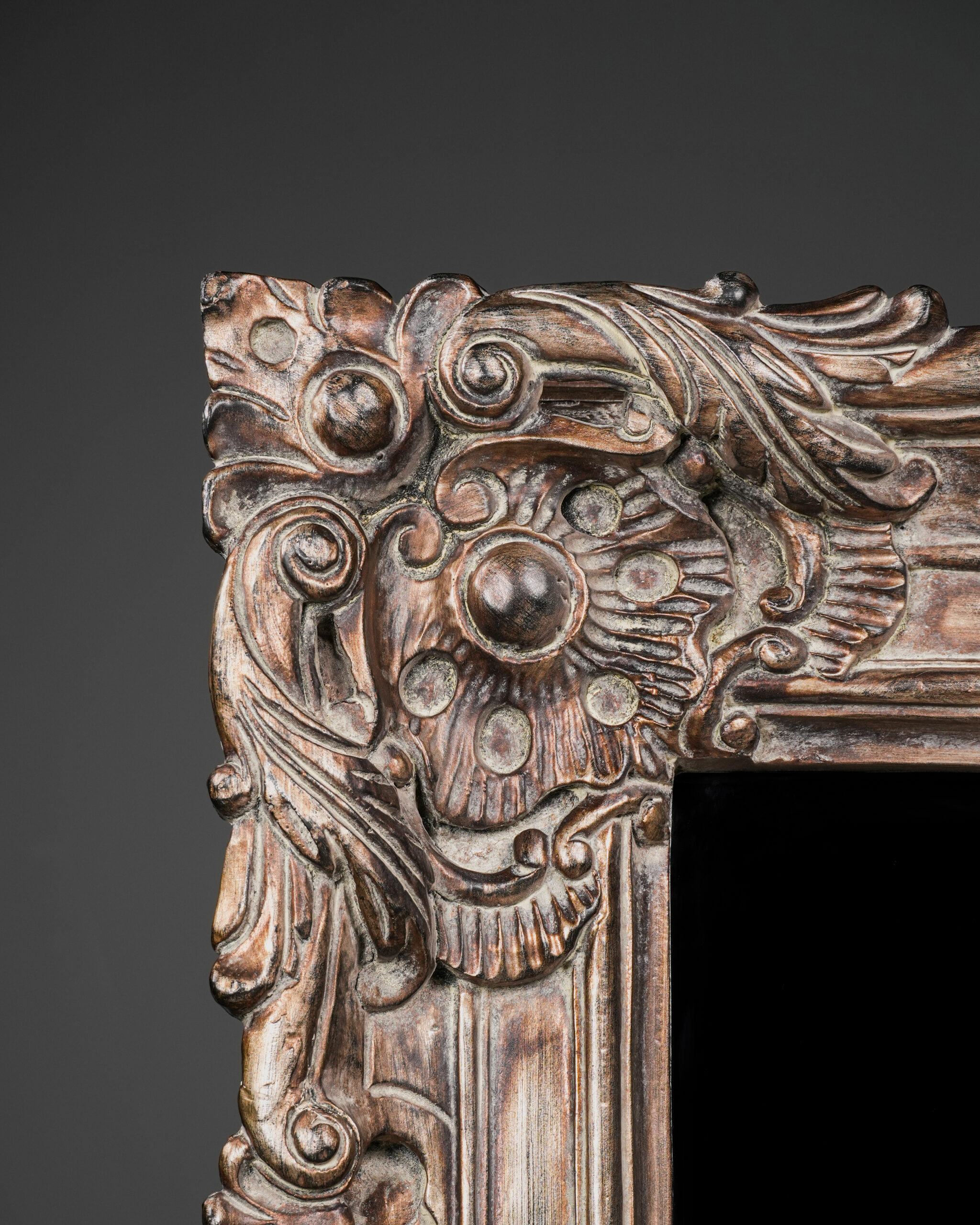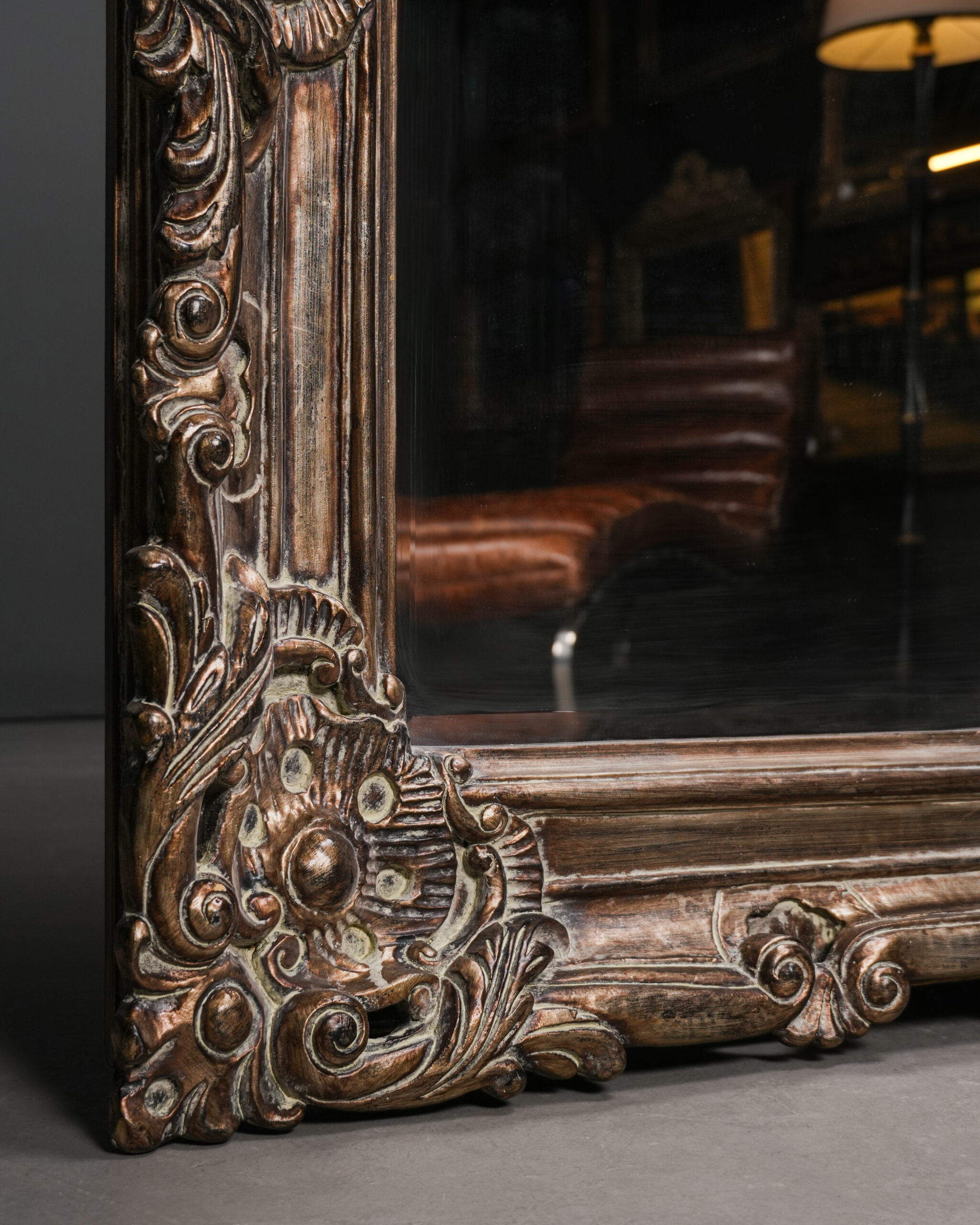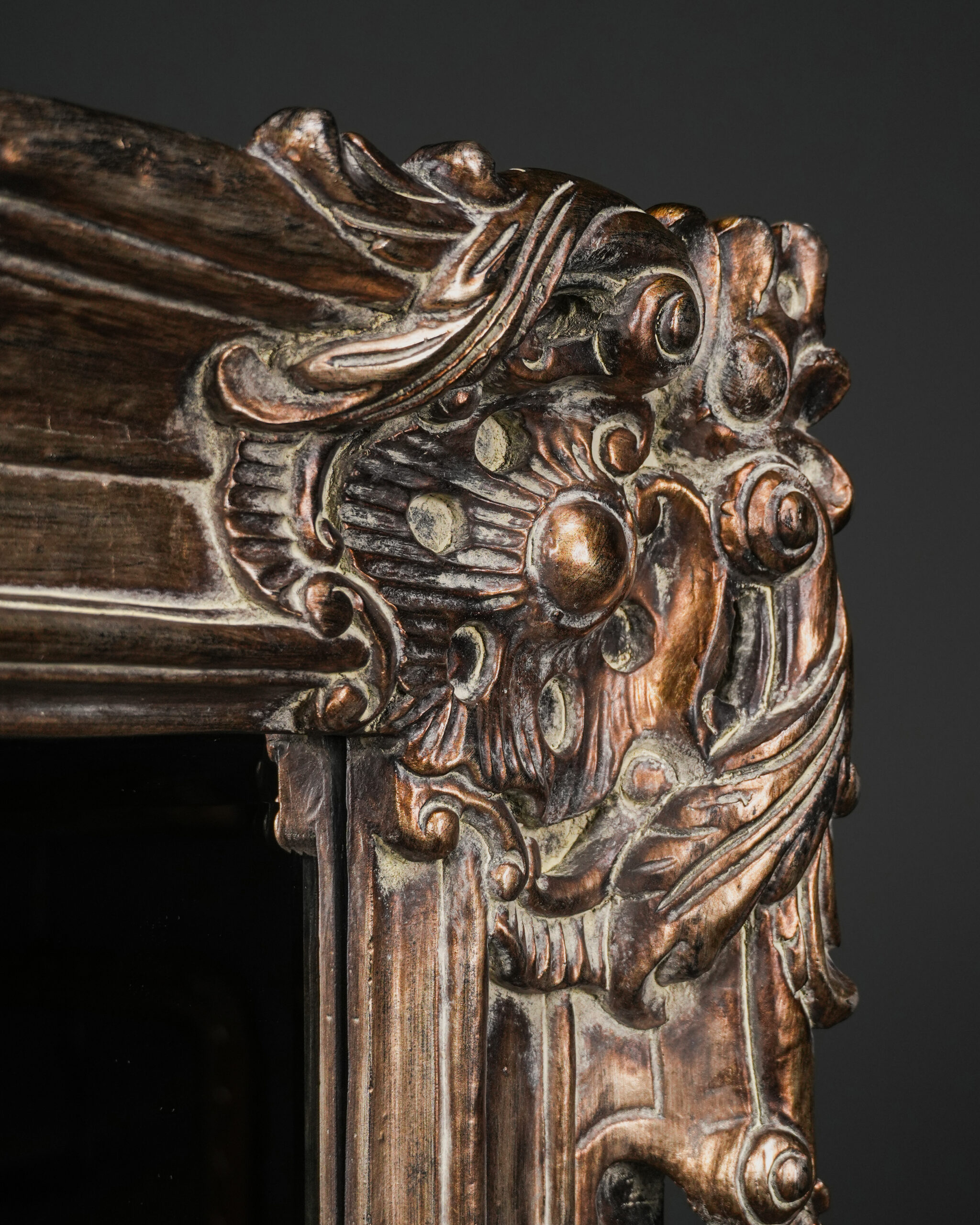 Kalın ve hacimli çerçevesi boyunca devam eden katmanlı Rococo oyma kompozisyonu, ışık ve gölge oyunlarıyla yüzeye üç boyutlu bir hareket kazandırır. Antik gümüş tonlarındaki patina finish ise oyma detaylarının iç kısımlarında daha koyu, çıkıntılı yüzeylerde ise daha açık tonlarda görünerek klasik Avrupa dekorasyonunun zarif estetiğini yansıtır.