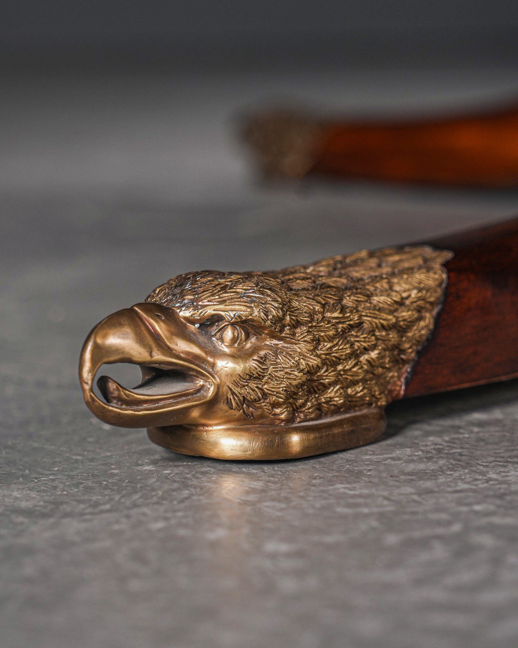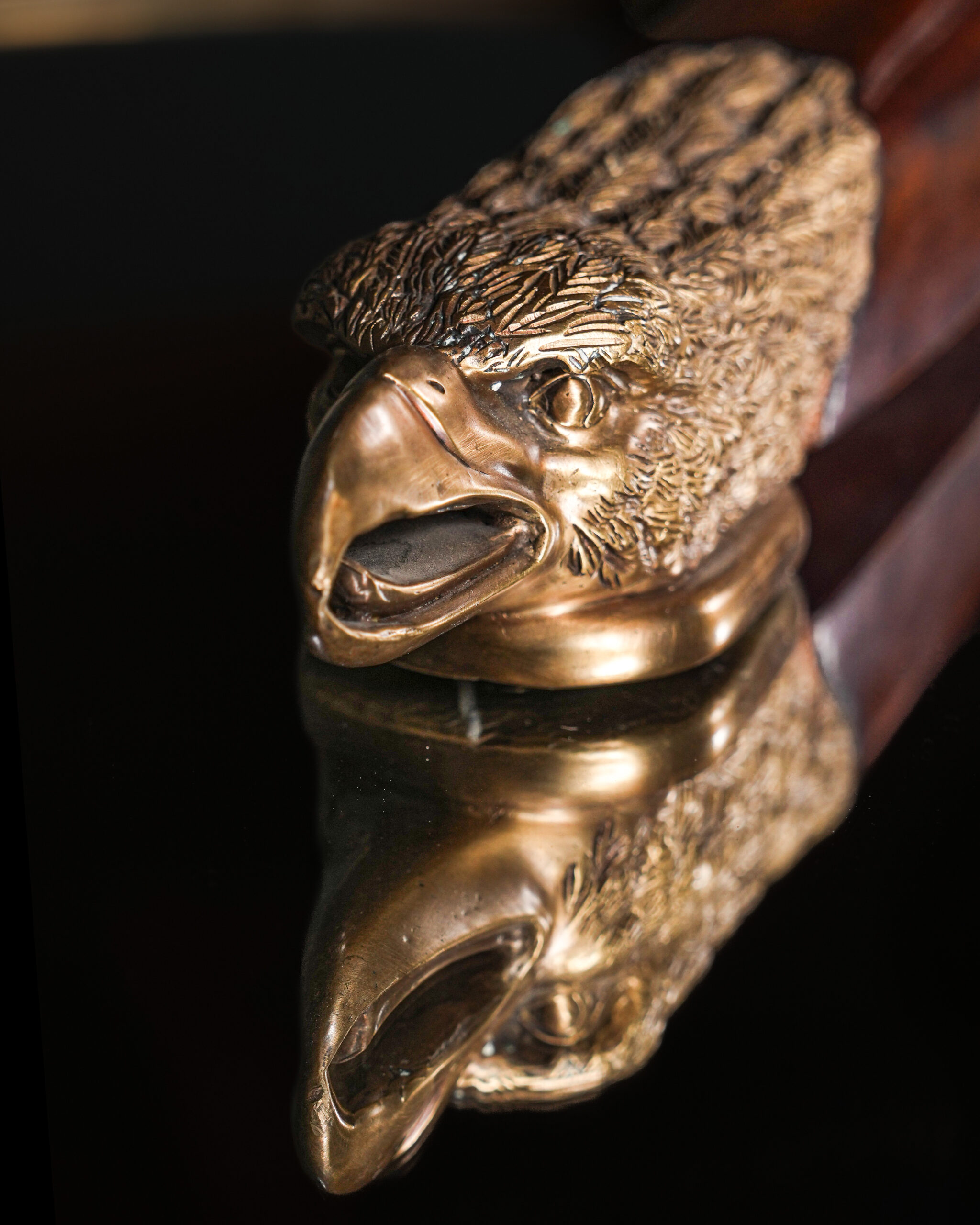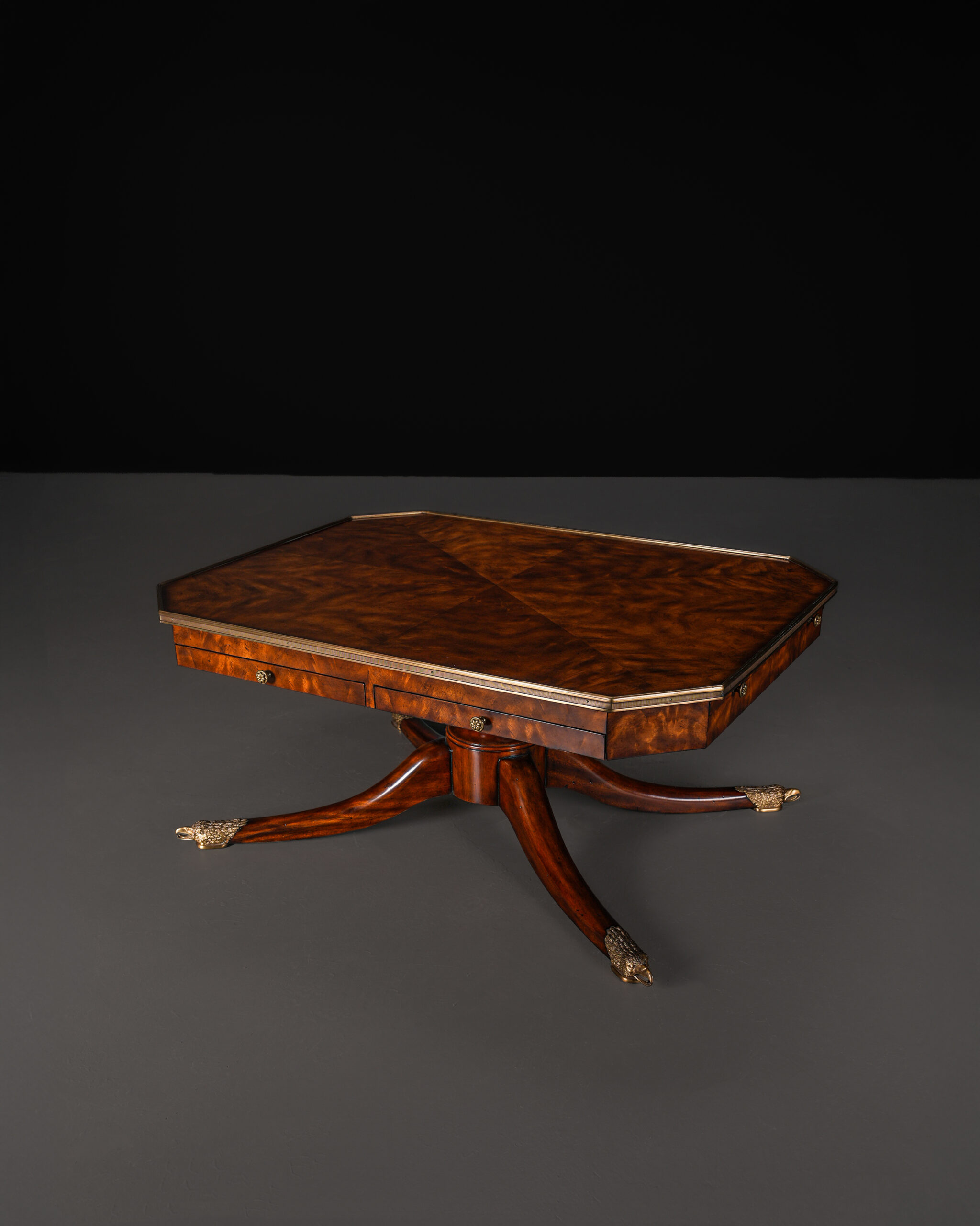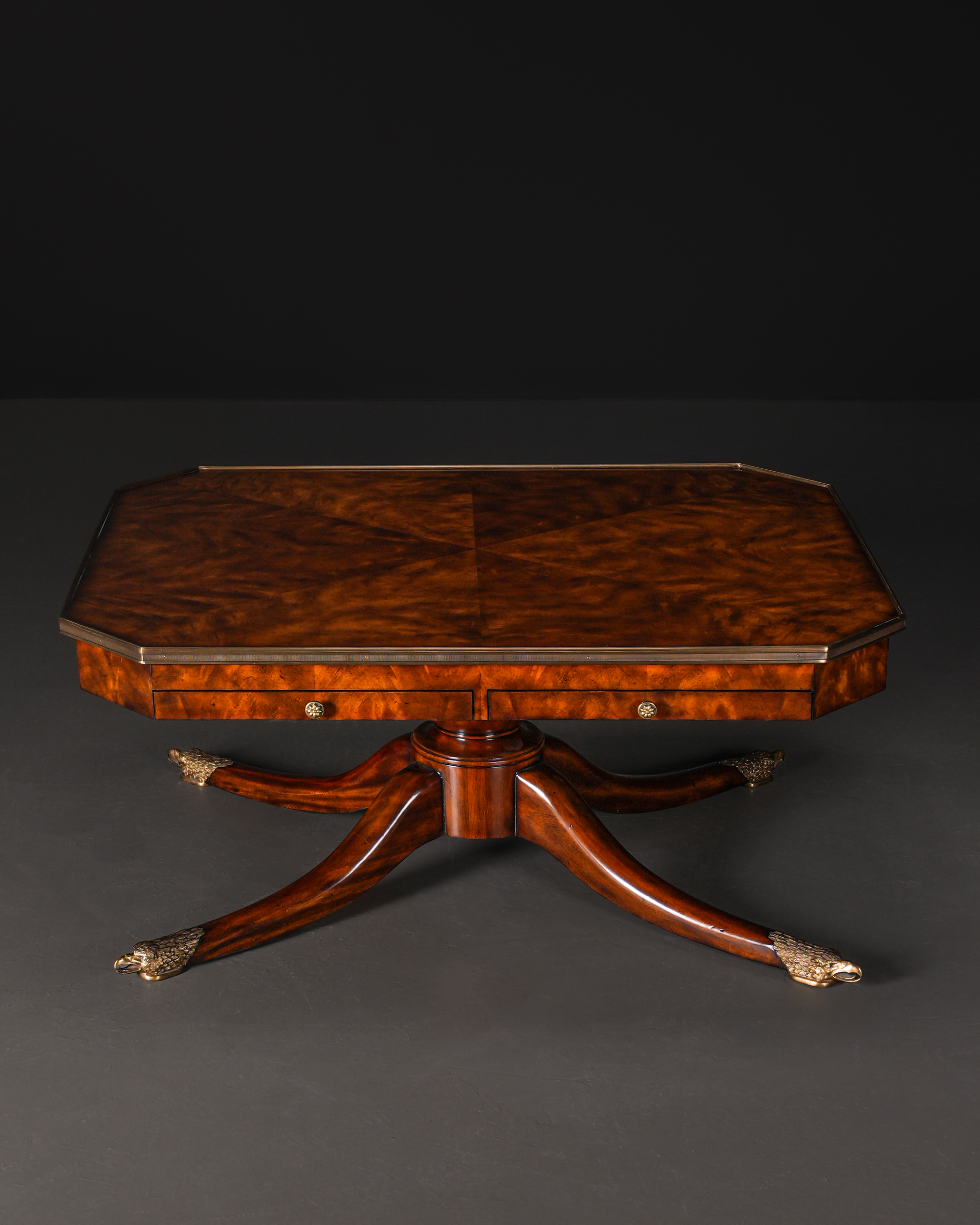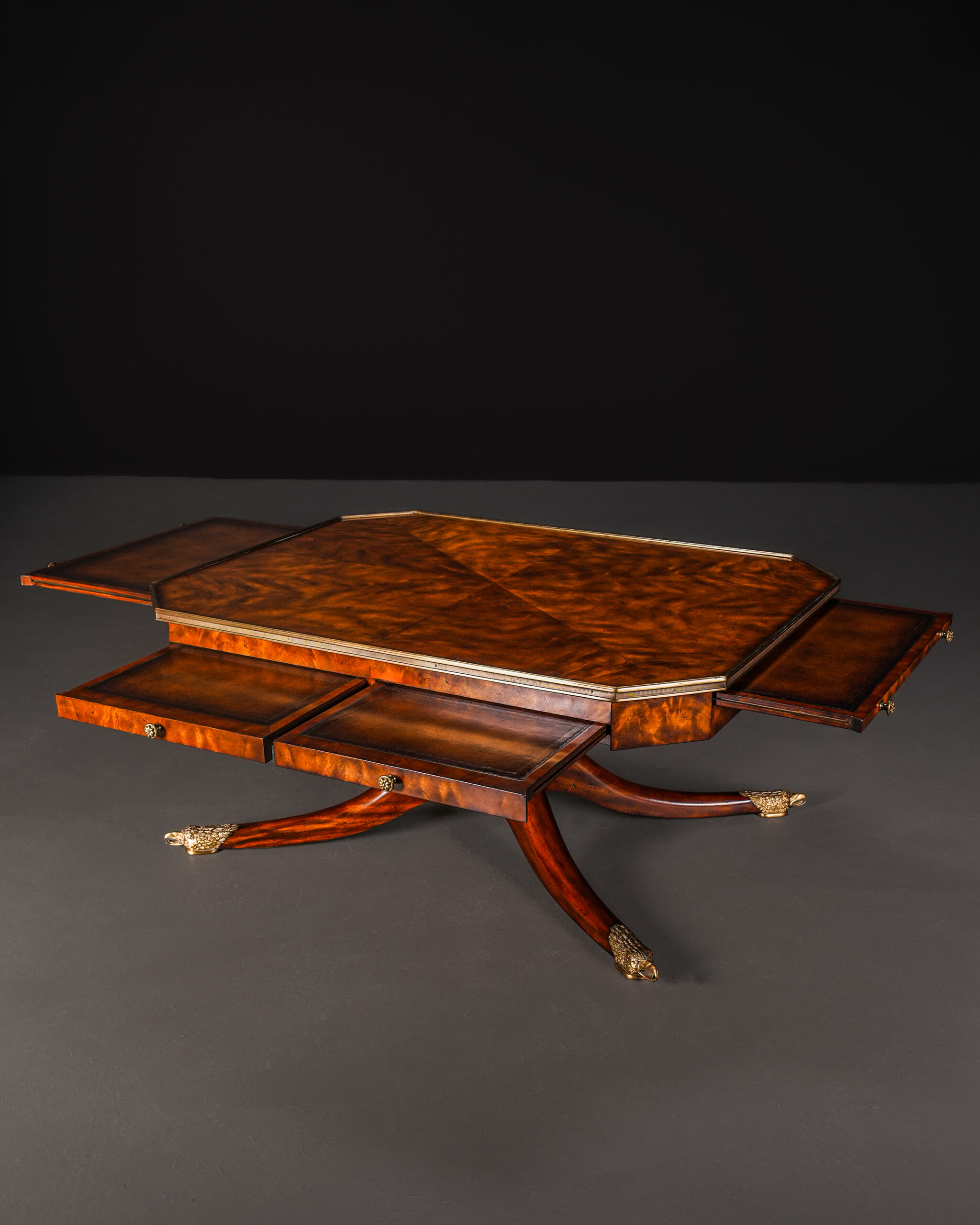Theodore Alexander imzalı, crotch maun kaplama üst yüzeye sahip, 6 adet deri kaplı sürgülü tablalı ve bronz kartal başı ayaklı lüks kokteyl sehpası. Geniş ölçülü ve prestijli tasarım.