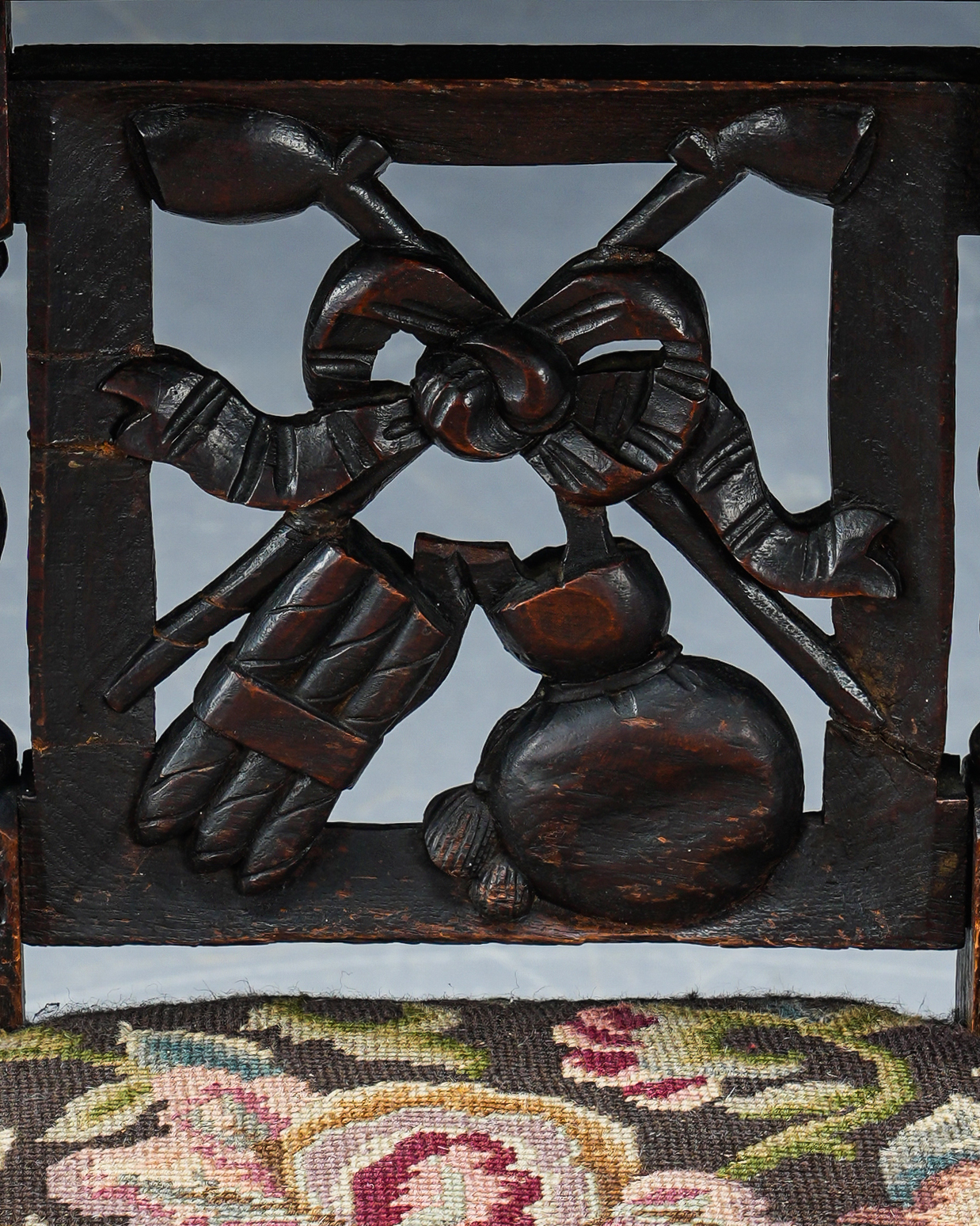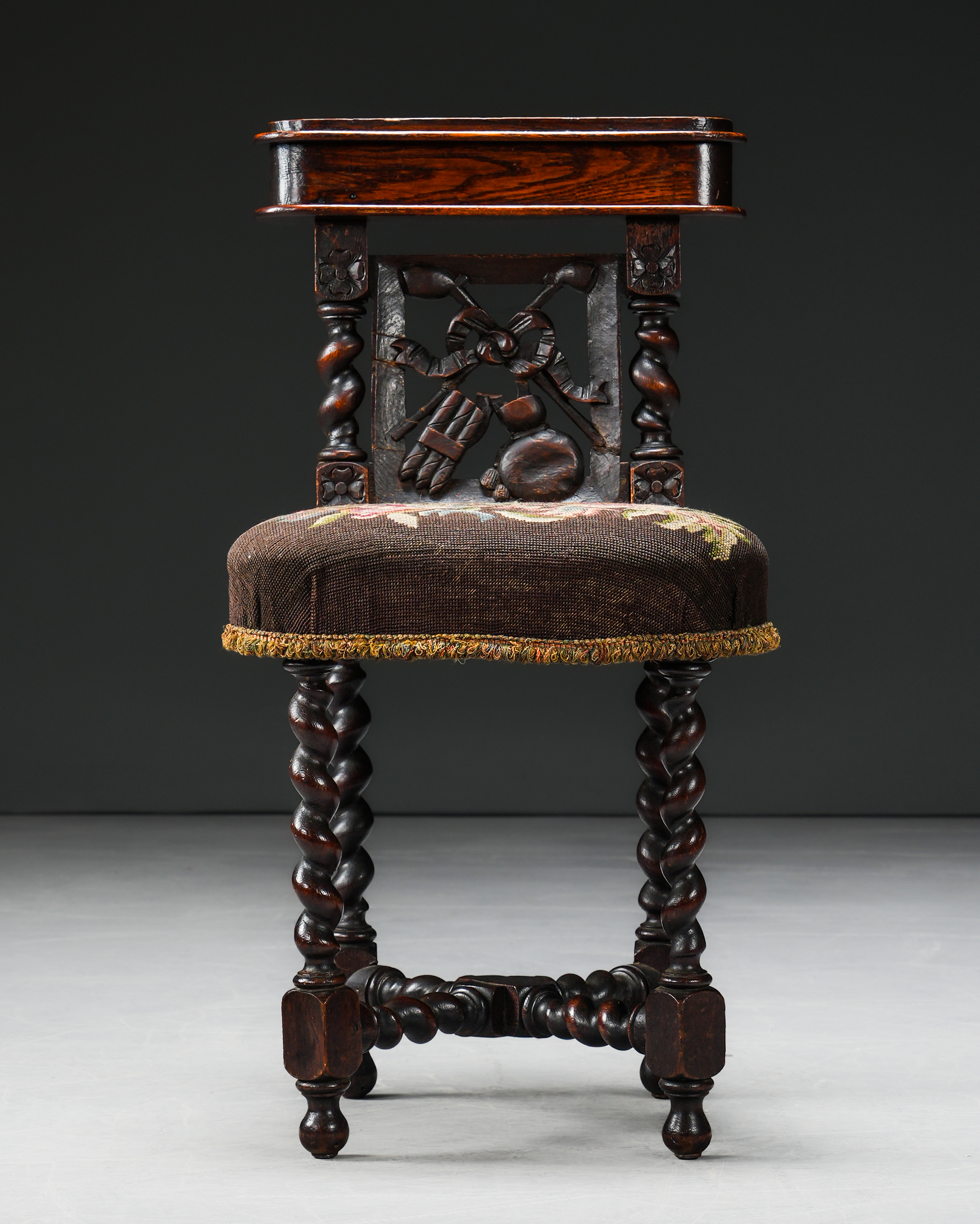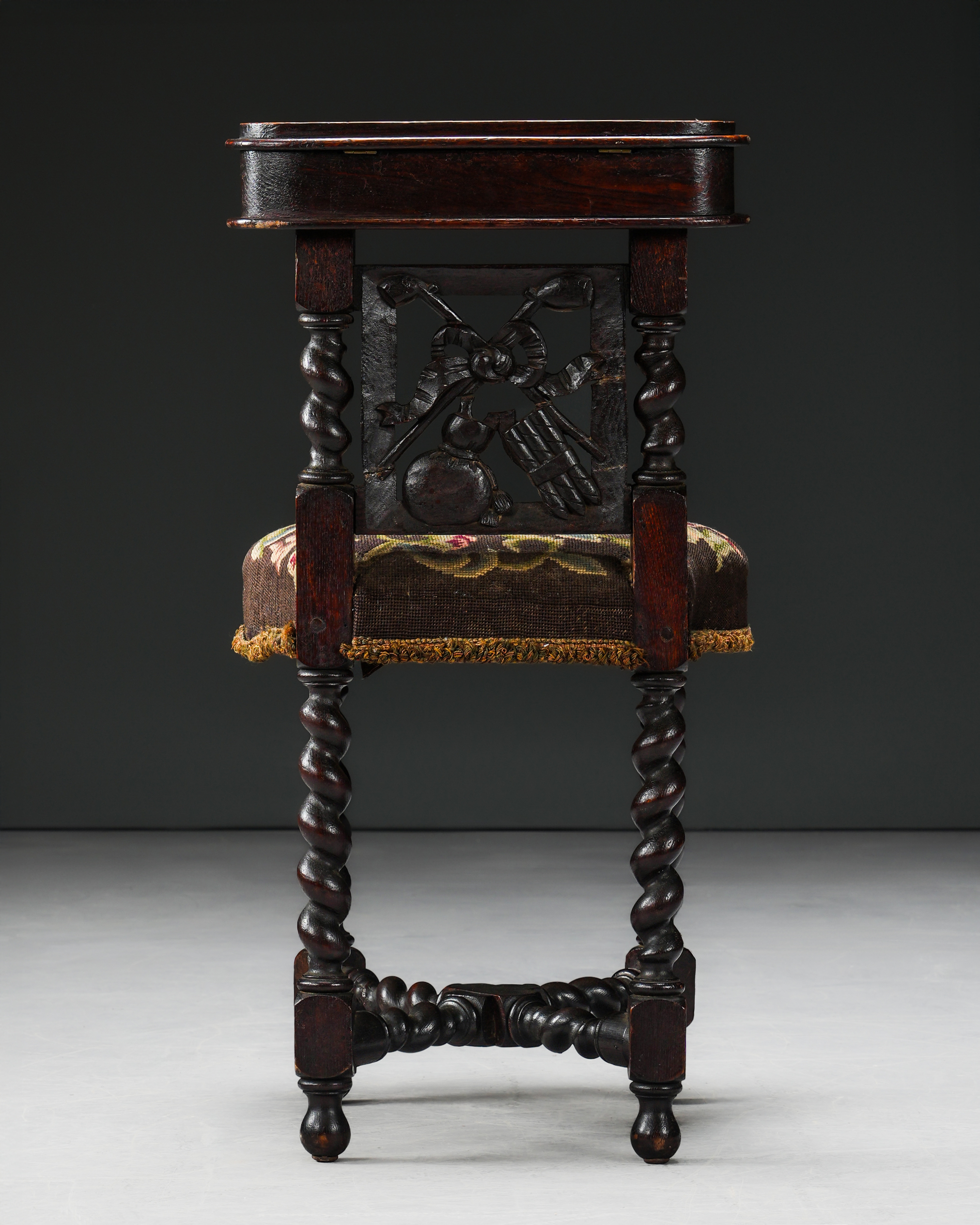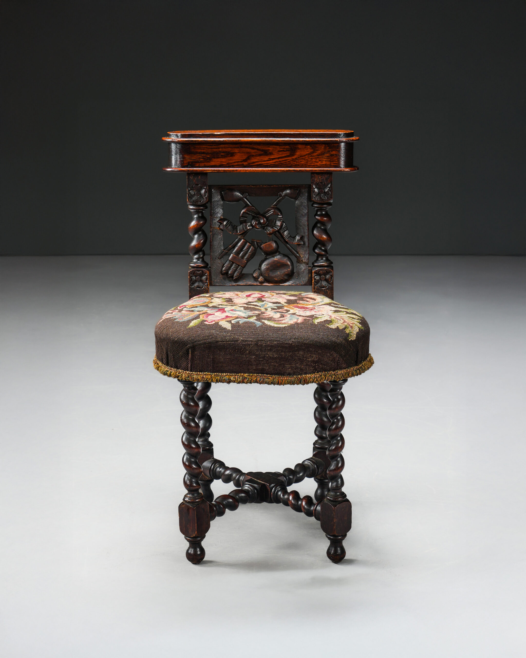 “Barley twist” ayaklar. Puro ve pipo motifleri işlenmiş sırtlığın üzerinde tütün ve pipoları saklamak için özel bir bölme. Orijinal goblen döşeme.