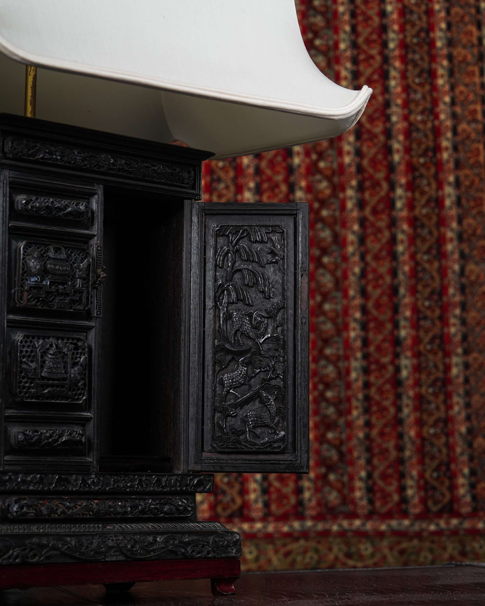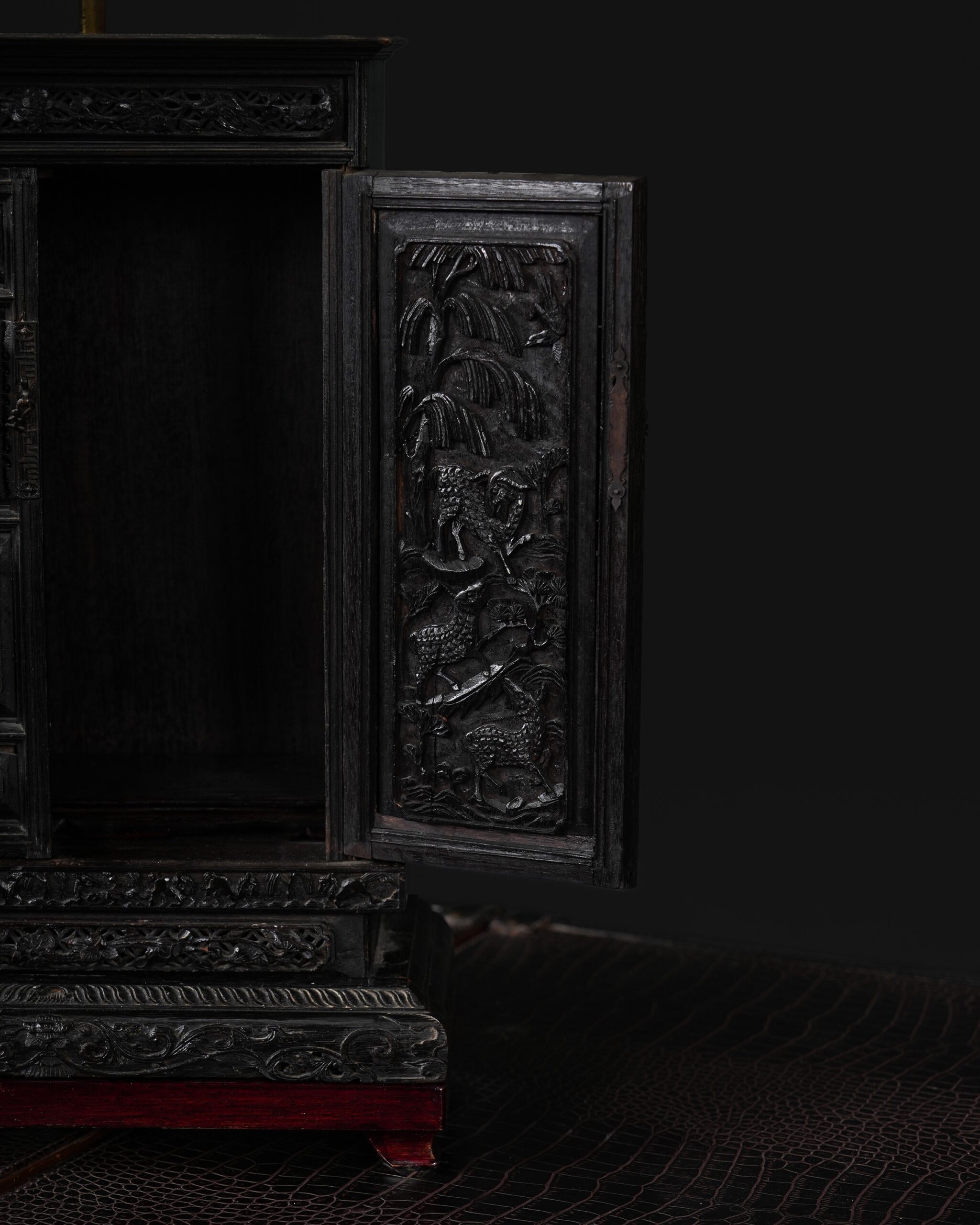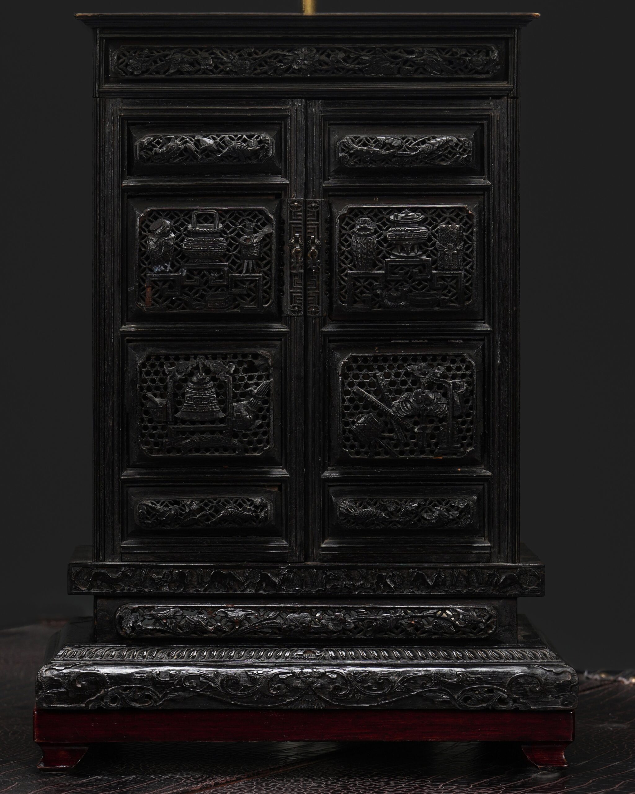 Çin tapınağı formunda dolabın ajurlu kapaklarının hem dış hem de iç tarafları çok ince bir işçilikle oyulmuştur. Kapakların dışında Çin motifleri, içinde ise hayvan desenleri işlenmiştir.