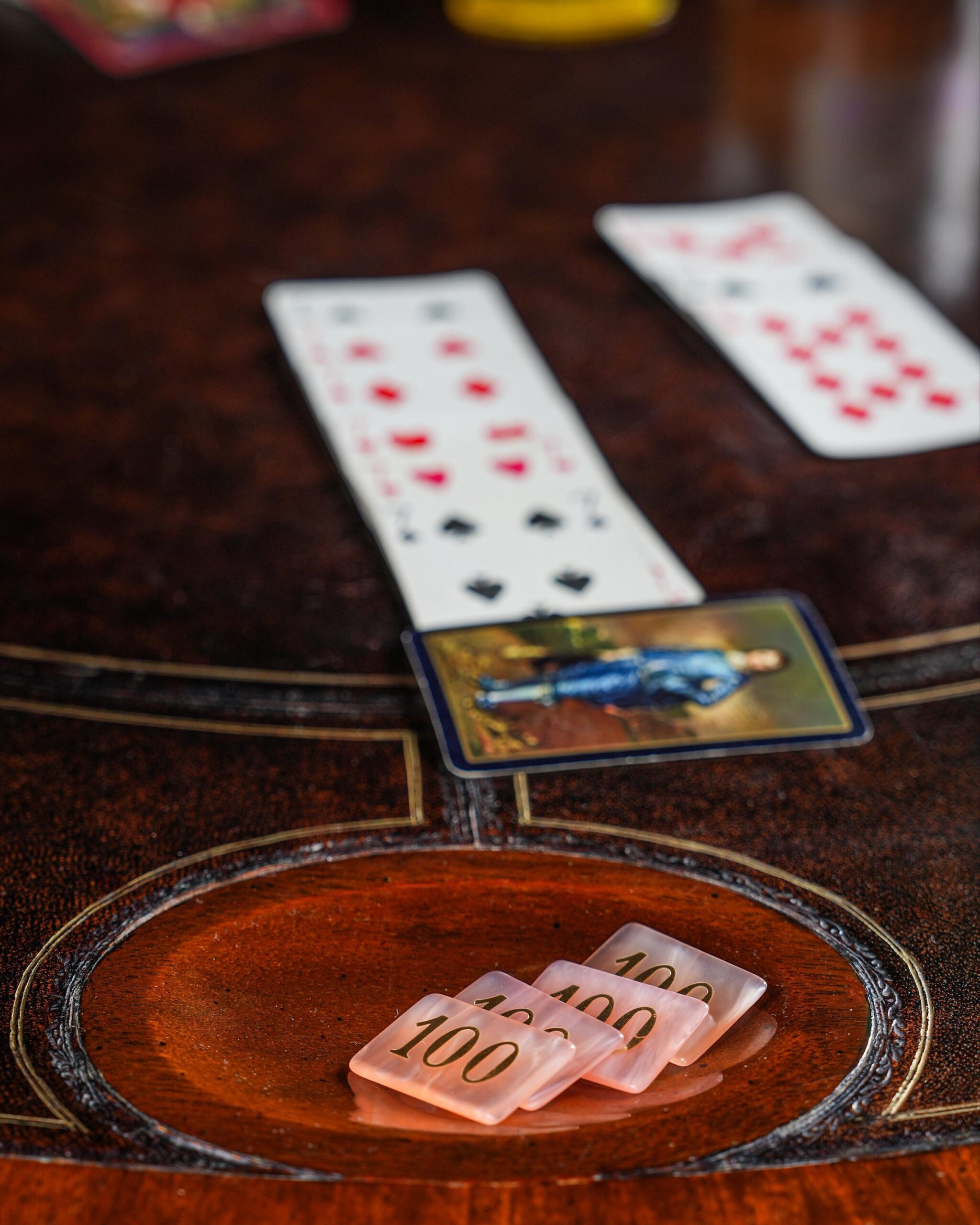 Üzeri deri kaplı ve oyun taşları için çevresine cepler oyulmuş bir katlanır tablaya sahip bu maun masa; oyun oynamanın sadece bir eğlence değil, sosyal hayatın vazgeçilmez bir parçası olduğu dönemlerin bir tasarımıdır.
