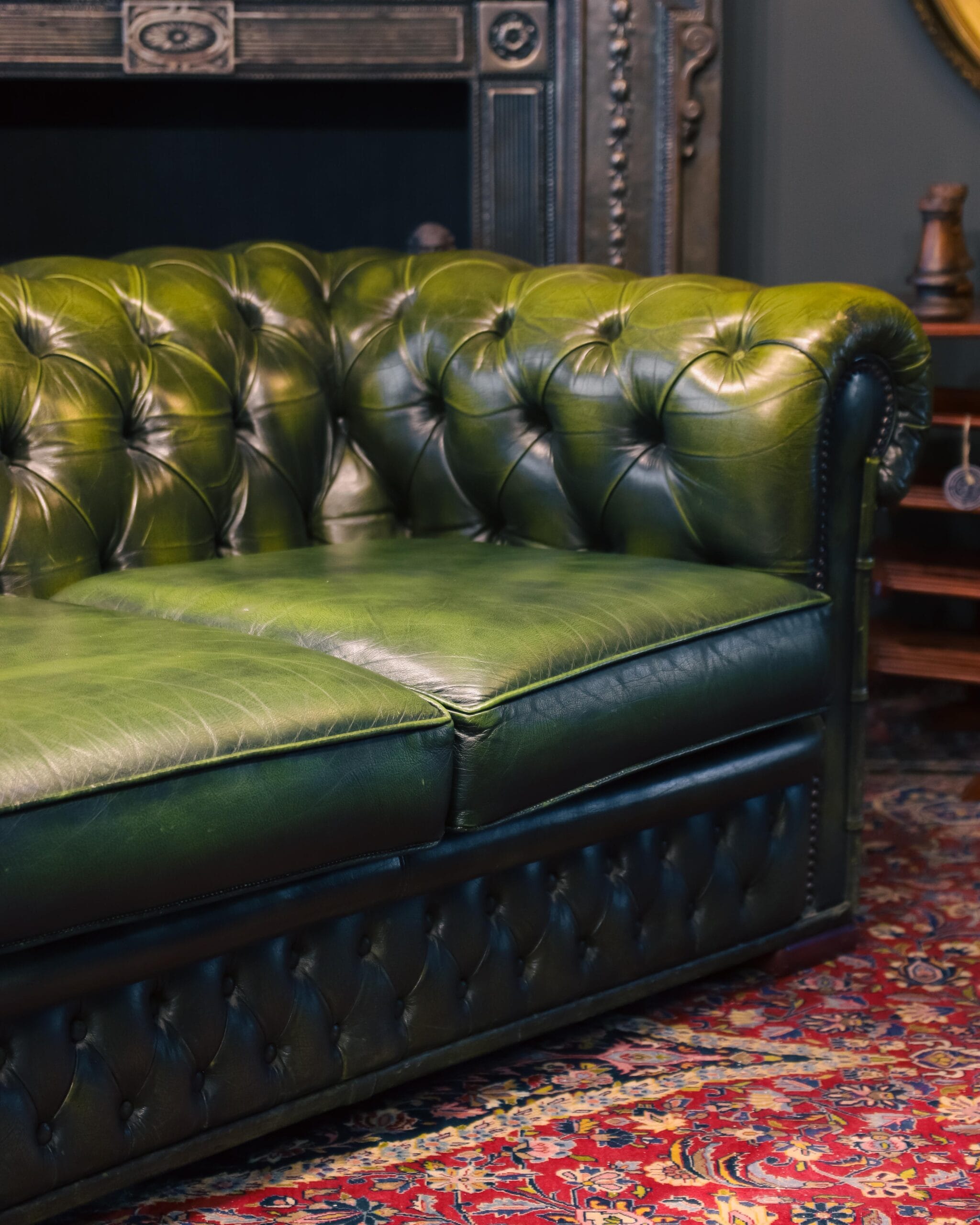 Bir Chesterfield kanepenin etrafına kurulmuş bu odayı nasıl tarif etsek?