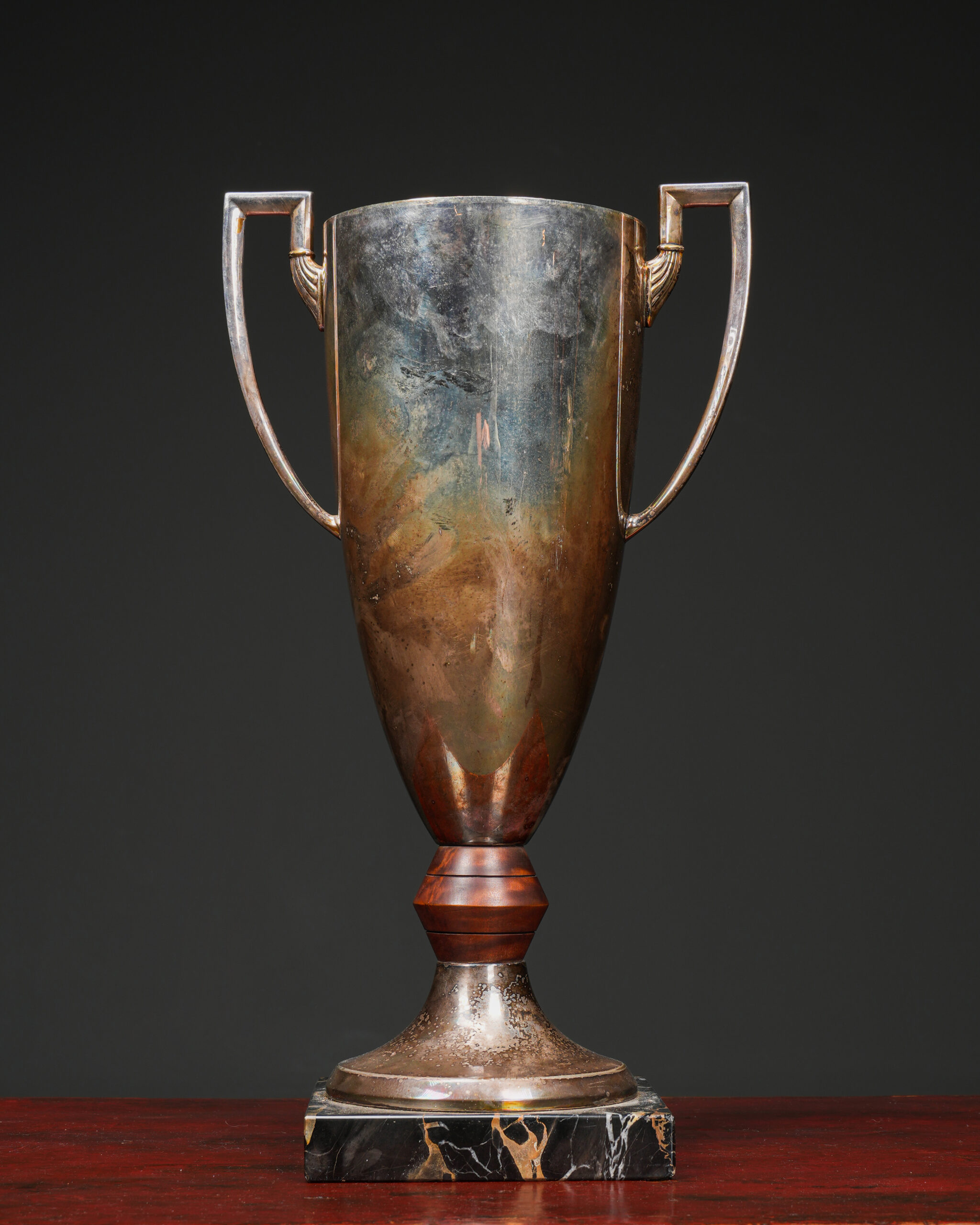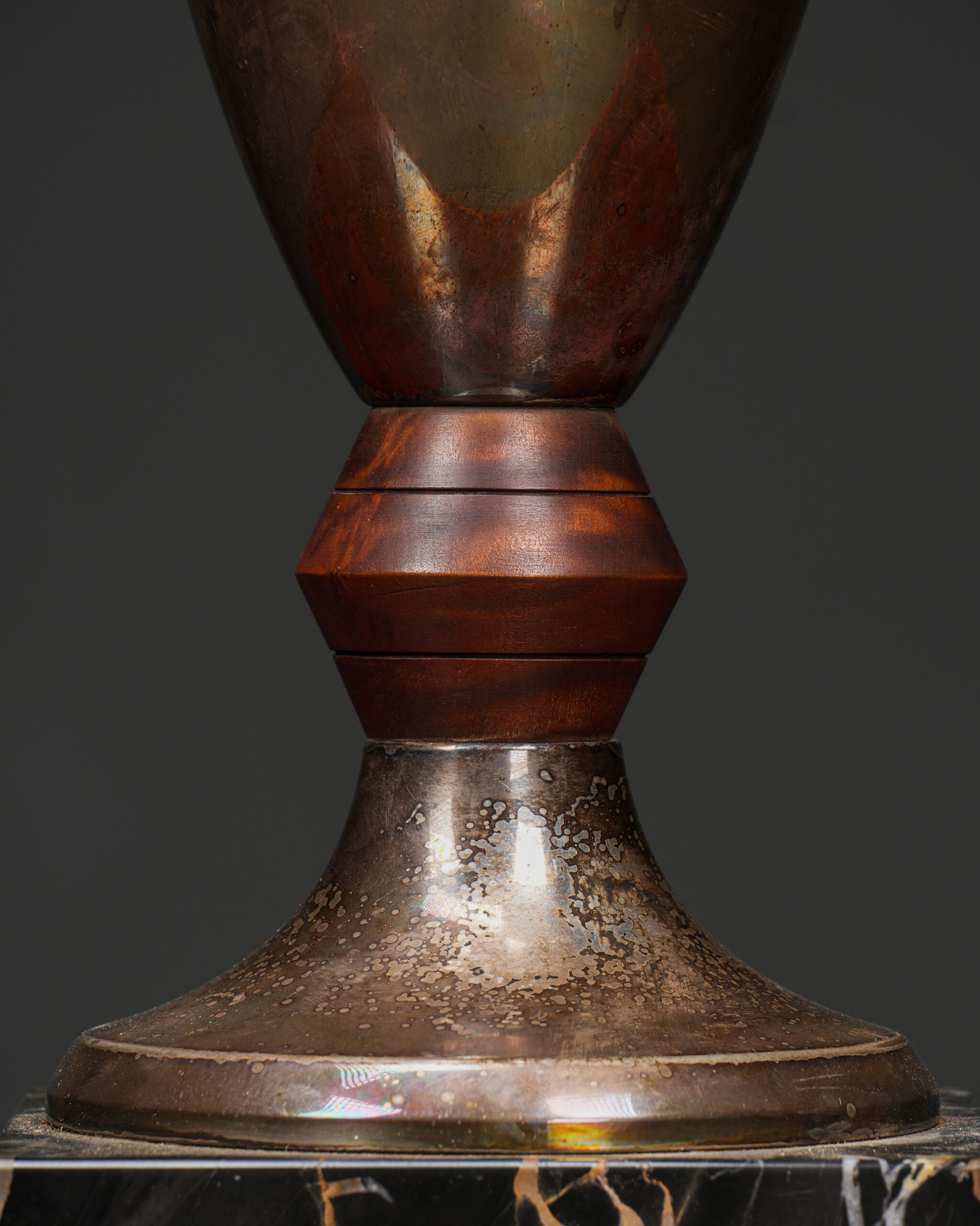 Vintage karakteriyle öne çıkan bu dekoratif kupa, klasik trophy formundan ilham alan zarif siluetiyle dikkat çeker. Yüksek ve dar gövdesi, iki yandan yükselen kulpları ve mermer kaidesiyle birlikte hem güçlü hem de dengeli bir kompozisyon sunar. Yüzeyinde görülen doğal patina ve renk geçişleri, objeye zamanla oluşmuş özgün bir karakter kazandırır.