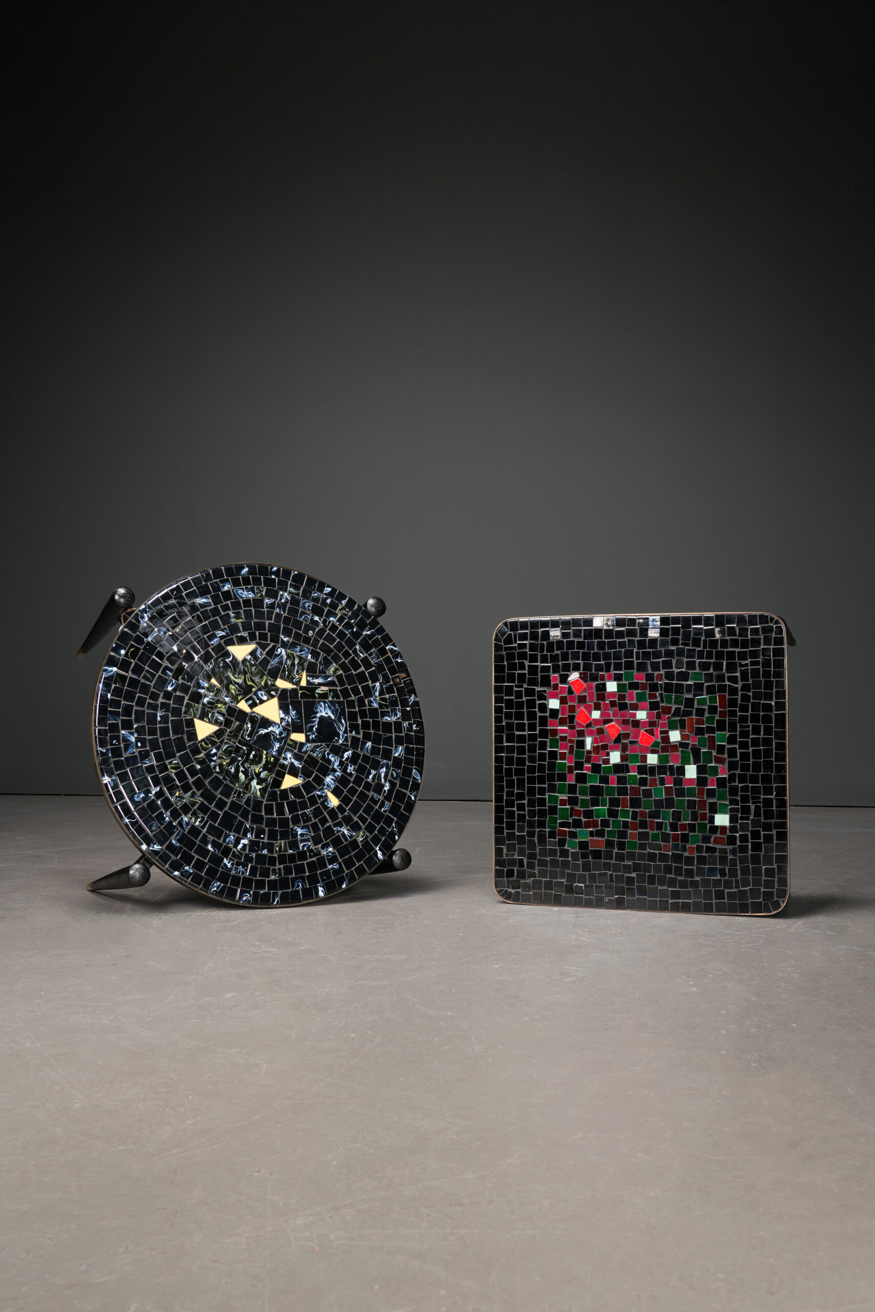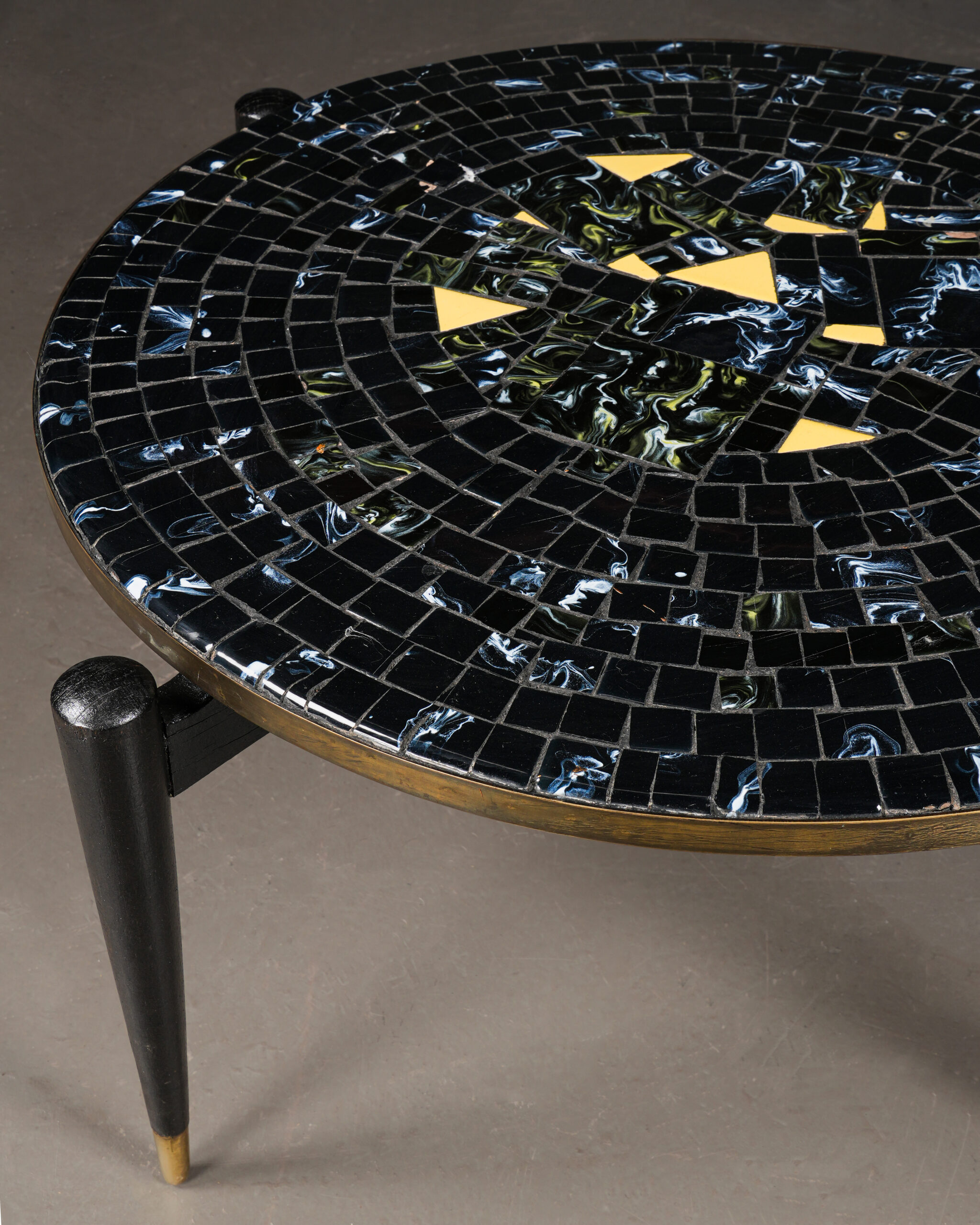 Dairesel formu ve zengin yüzey dokusuyla öne çıkan bu mozaik sehpa, mid-century modern tasarım anlayışını güçlü bir şekilde yansıtır. Siyah tonların hakim olduğu mozaik yüzey, merkezdeki dinamik desenle birleşerek ışığa göre değişen derinlikli bir görünüm sunar.